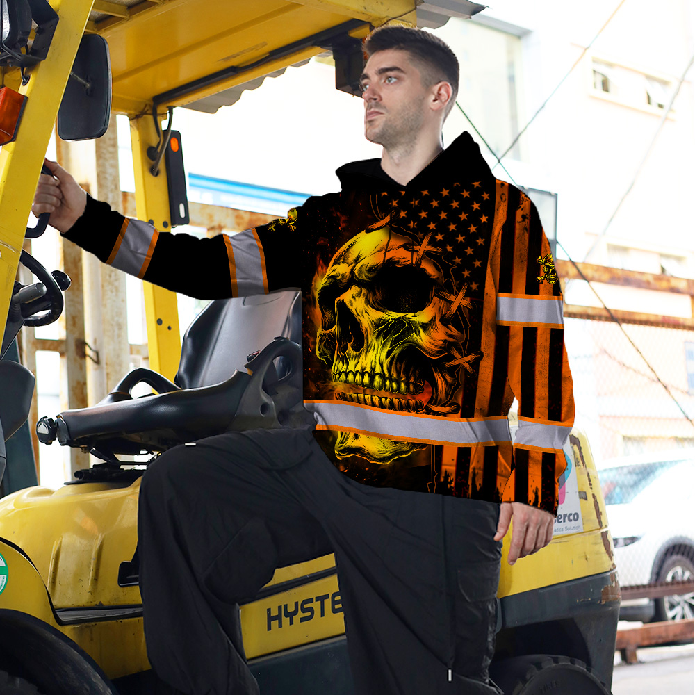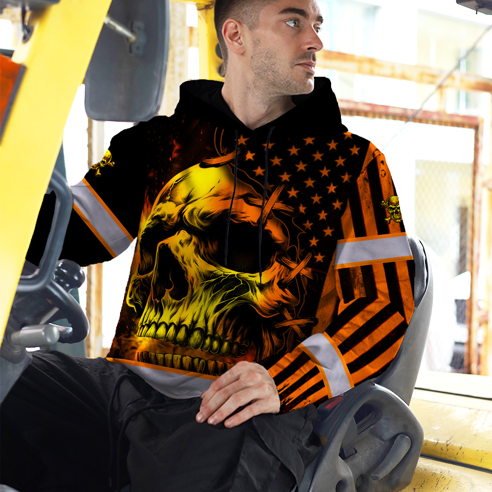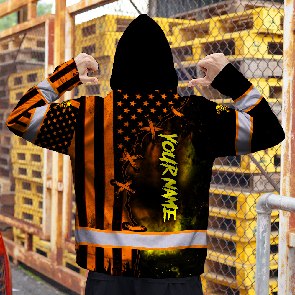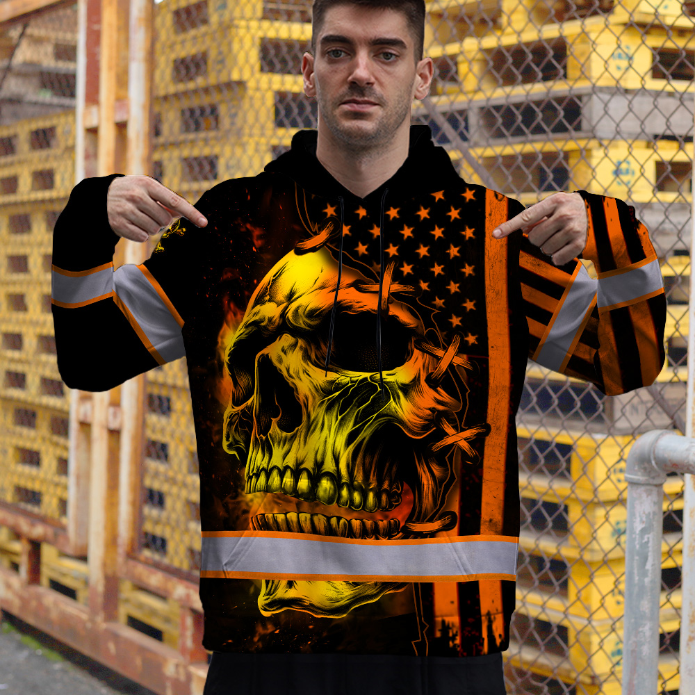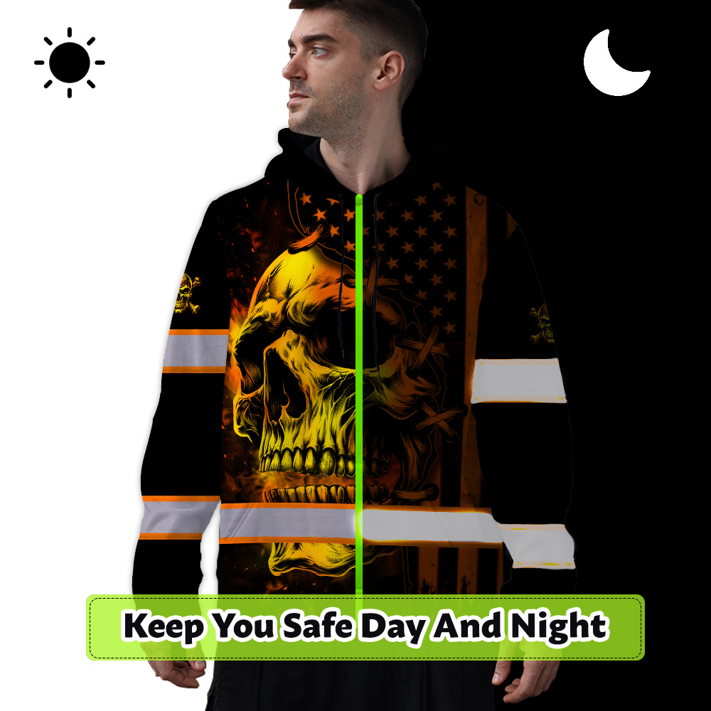 Hi Vis Hoodie Reflective Tapes Orange Neon Skull Scratch US Flag Custom Name