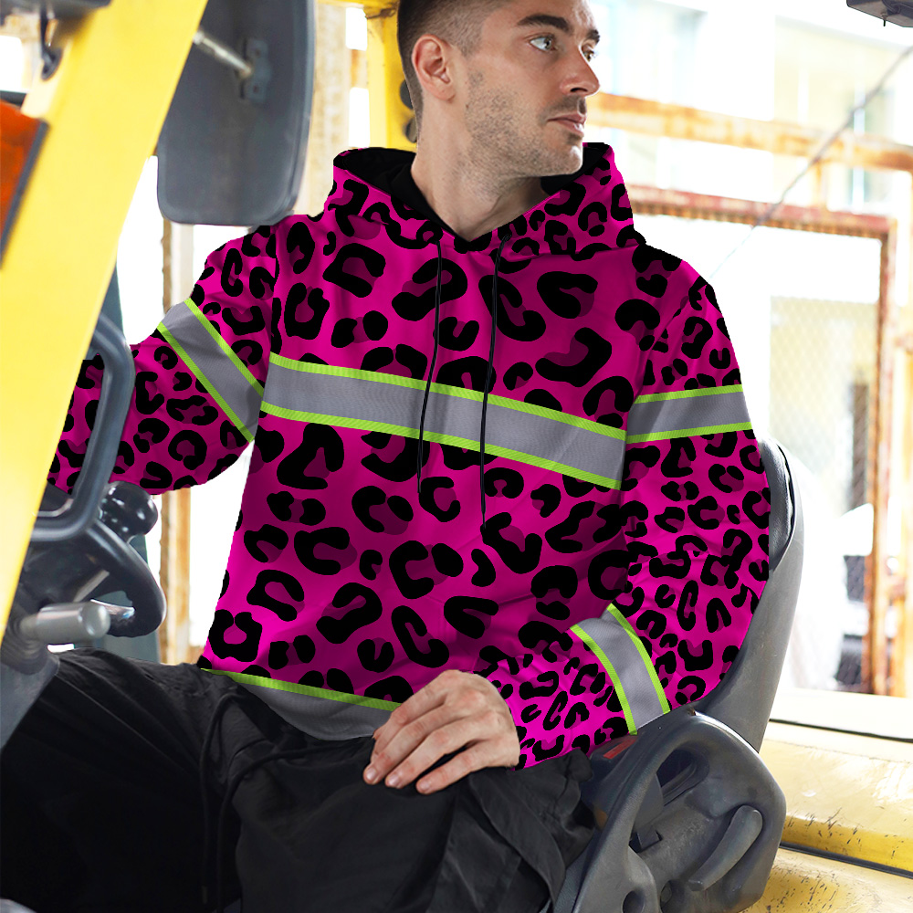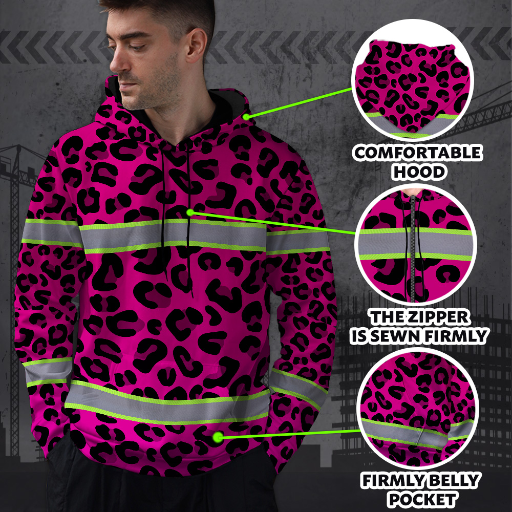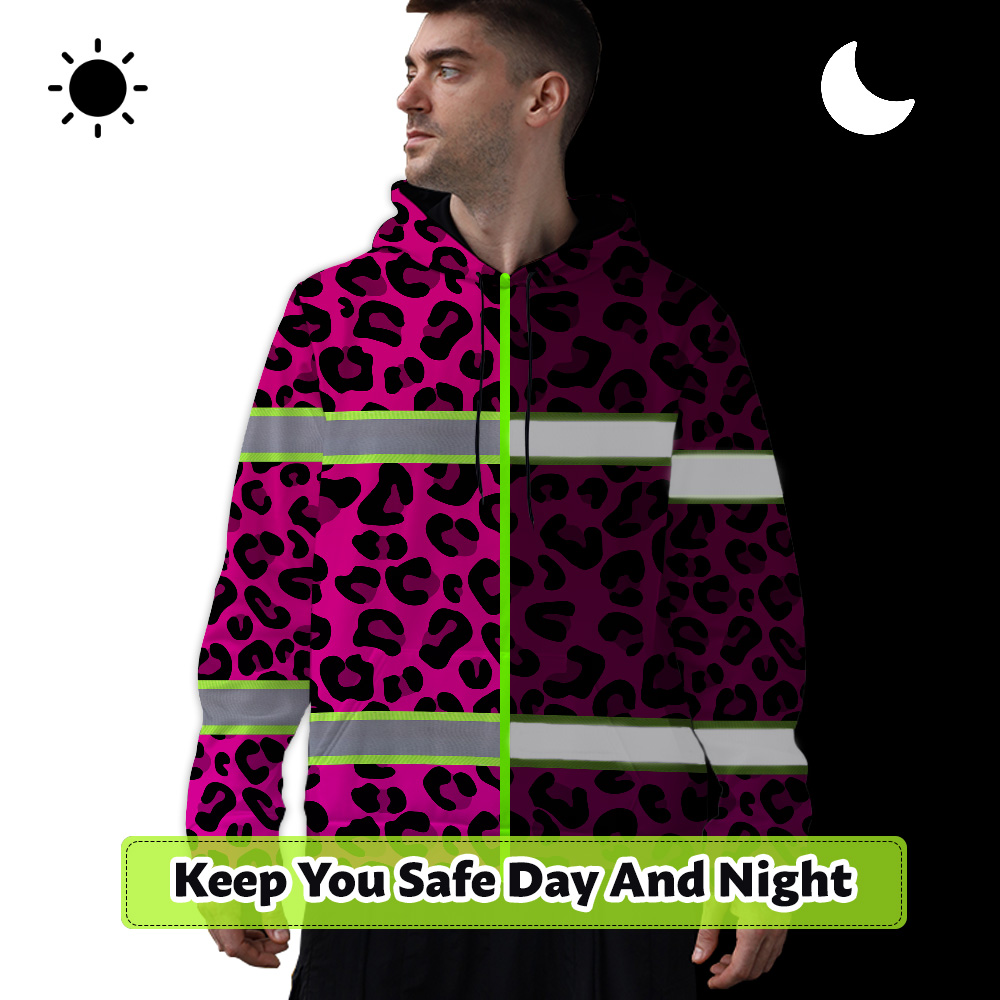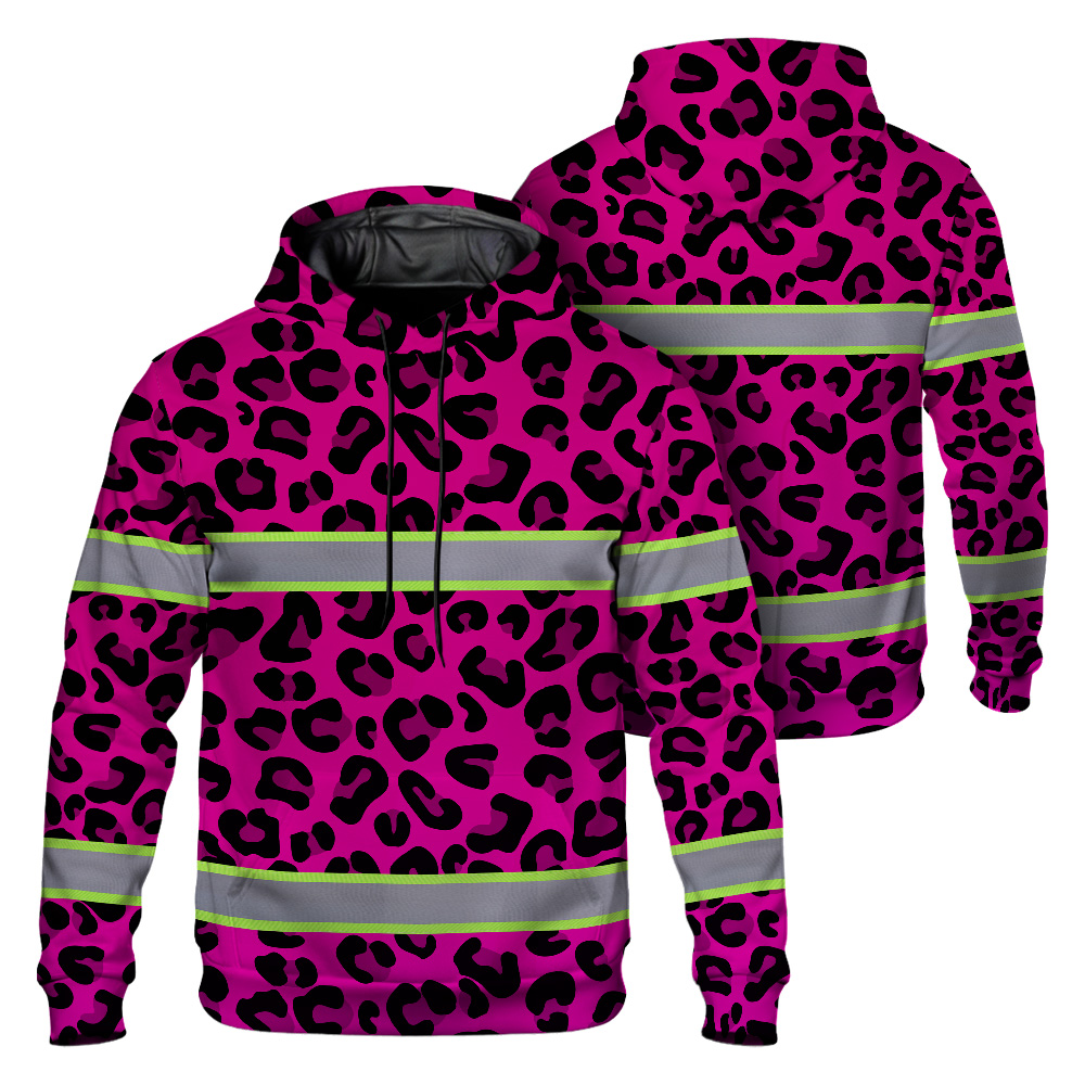 Hi Vis Hoodie Reflective Tapes Pink Leopard Safety Workwear For Workers, Runners, Cyclists Description