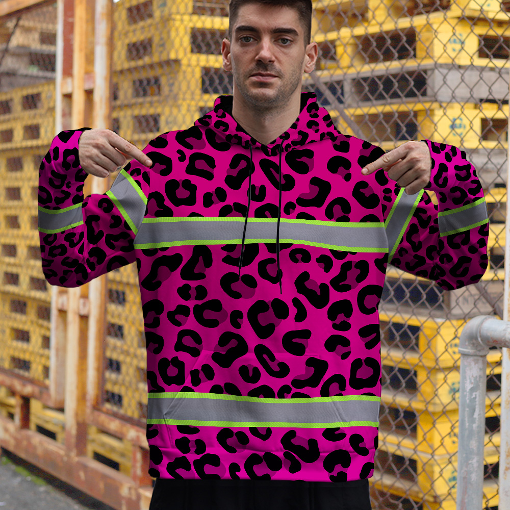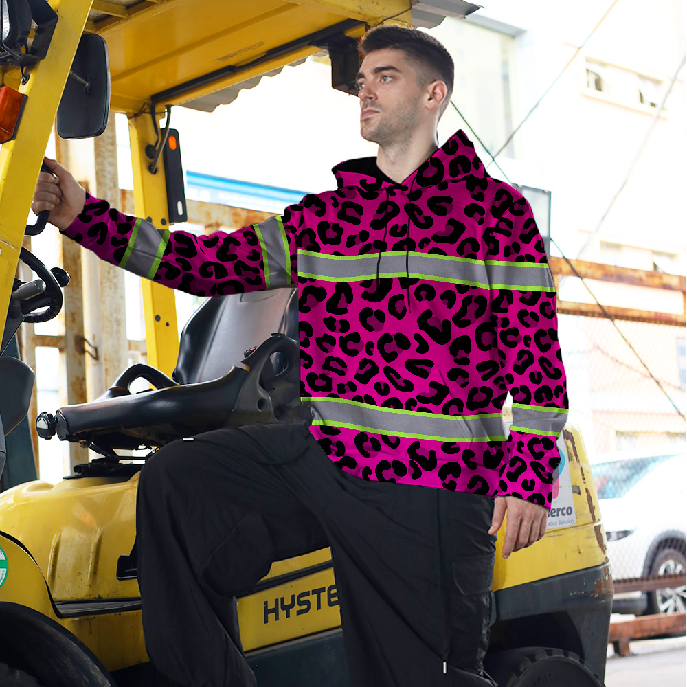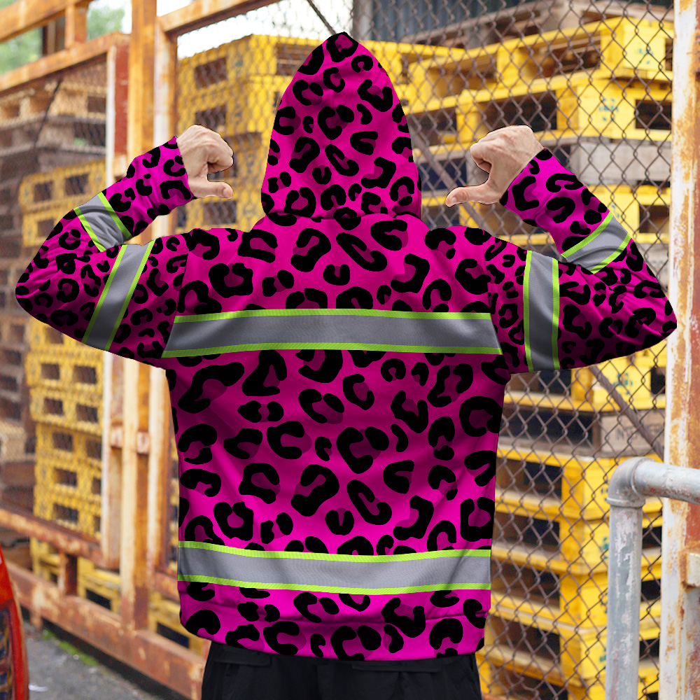 The reflective tapes on the Hi Vis Hoodie are perfect for those who want to be safe while working or running. The pink leopard print safety workwear is also stylish and will make you stand out in a crowd. Order your hoodie today at Hi Vis Custom.