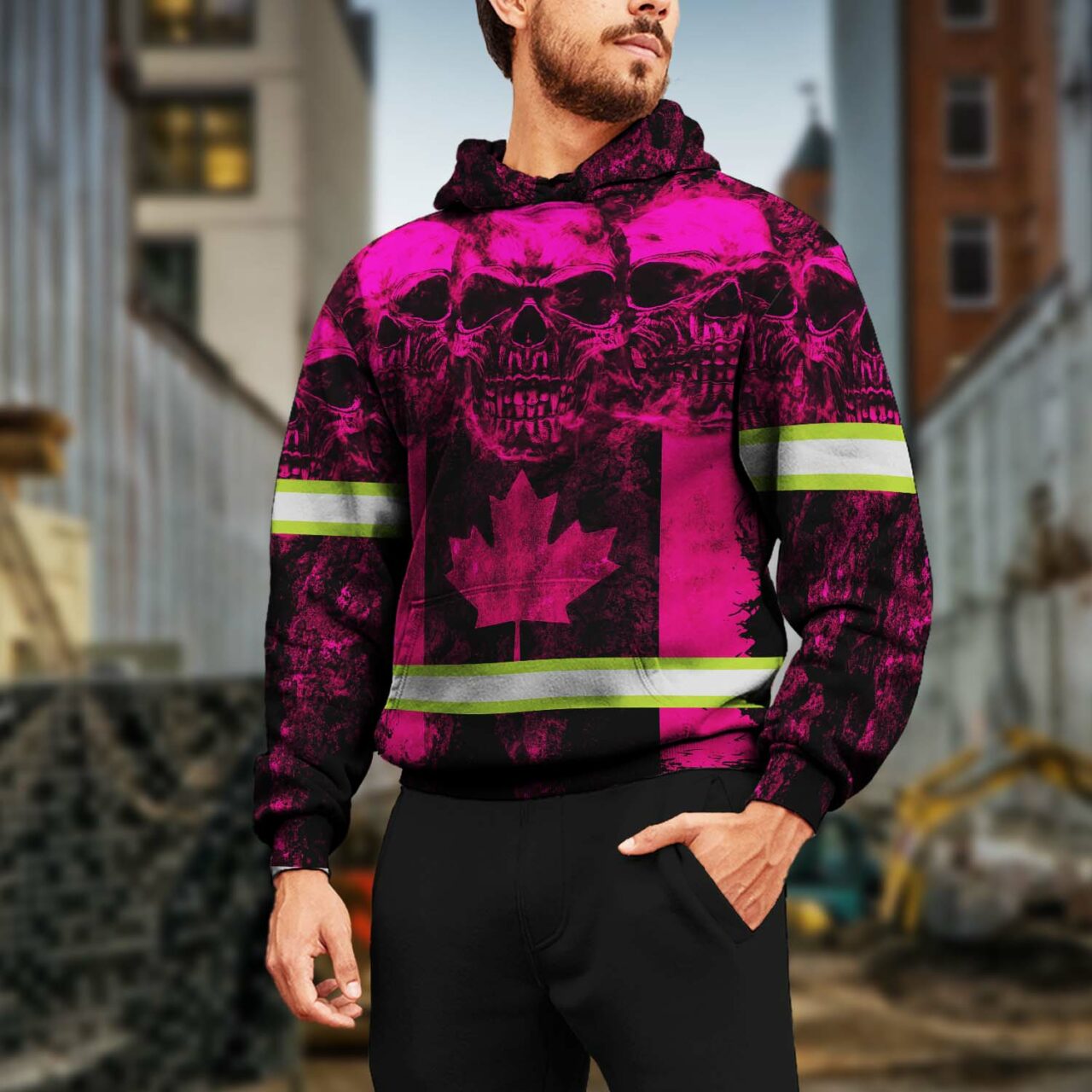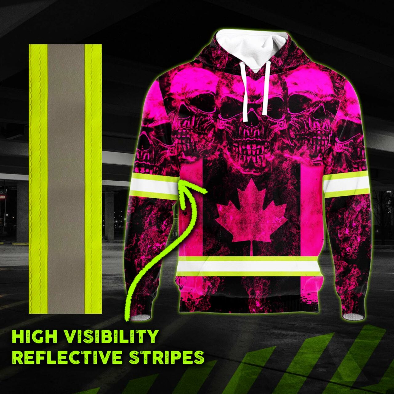 Hi Vis Hoodie Reflective Tapes Pink Neon Skull Canada Flag Safety