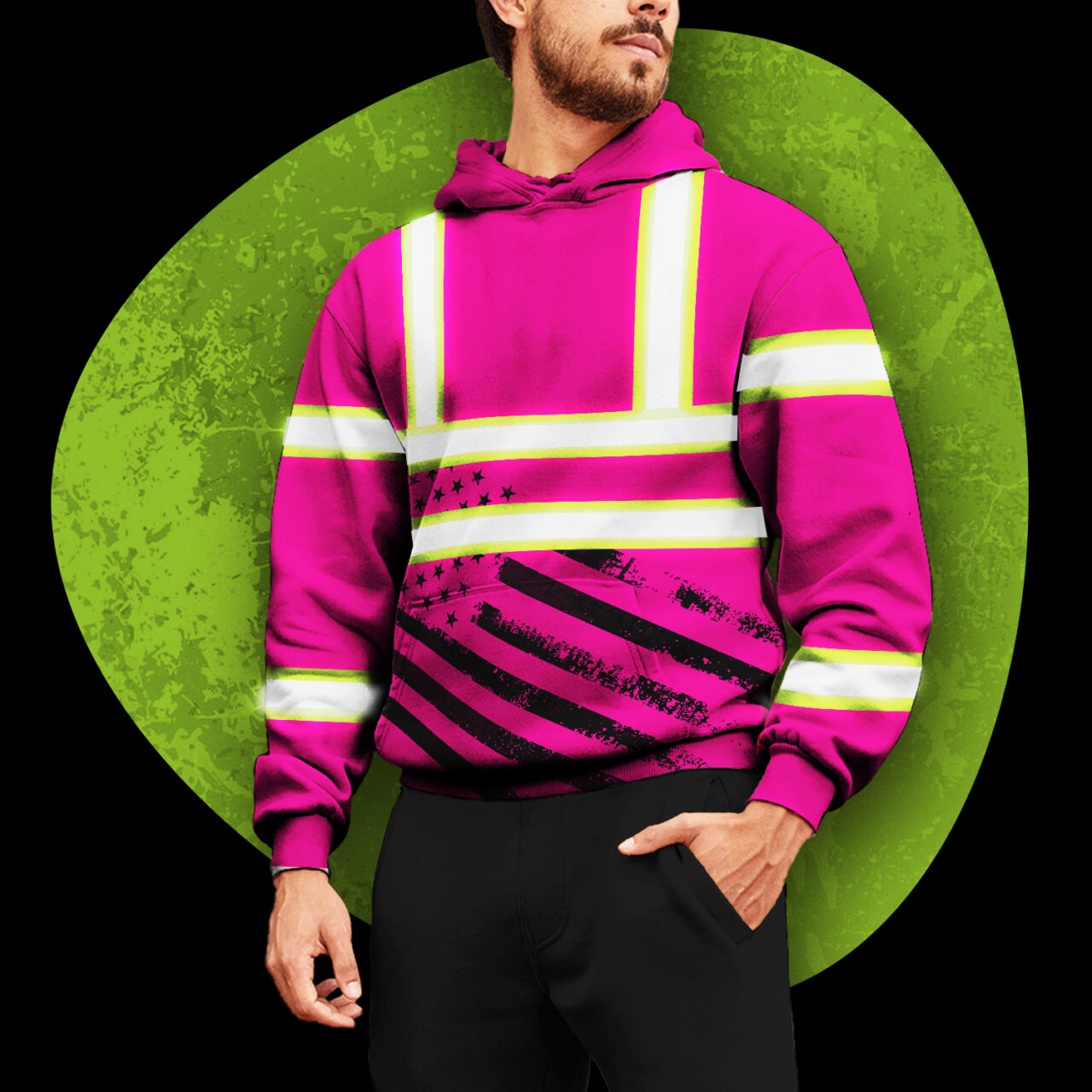 A high-quality reflective hoodie is a great investment for your safety, whether you’re working on a construction site or out for a run. Our Hi Vis Hoodie with Reflective Tapes in Pink USA Flag Safety Workwear is perfect for patriotic Americans who want to stay safe while showing their pride. The bright pink color and reflective strips will make you highly visible in low-light conditions, ensuring that drivers and other people see you. Order hi vis hoodies now from Hi Vis Custom.
