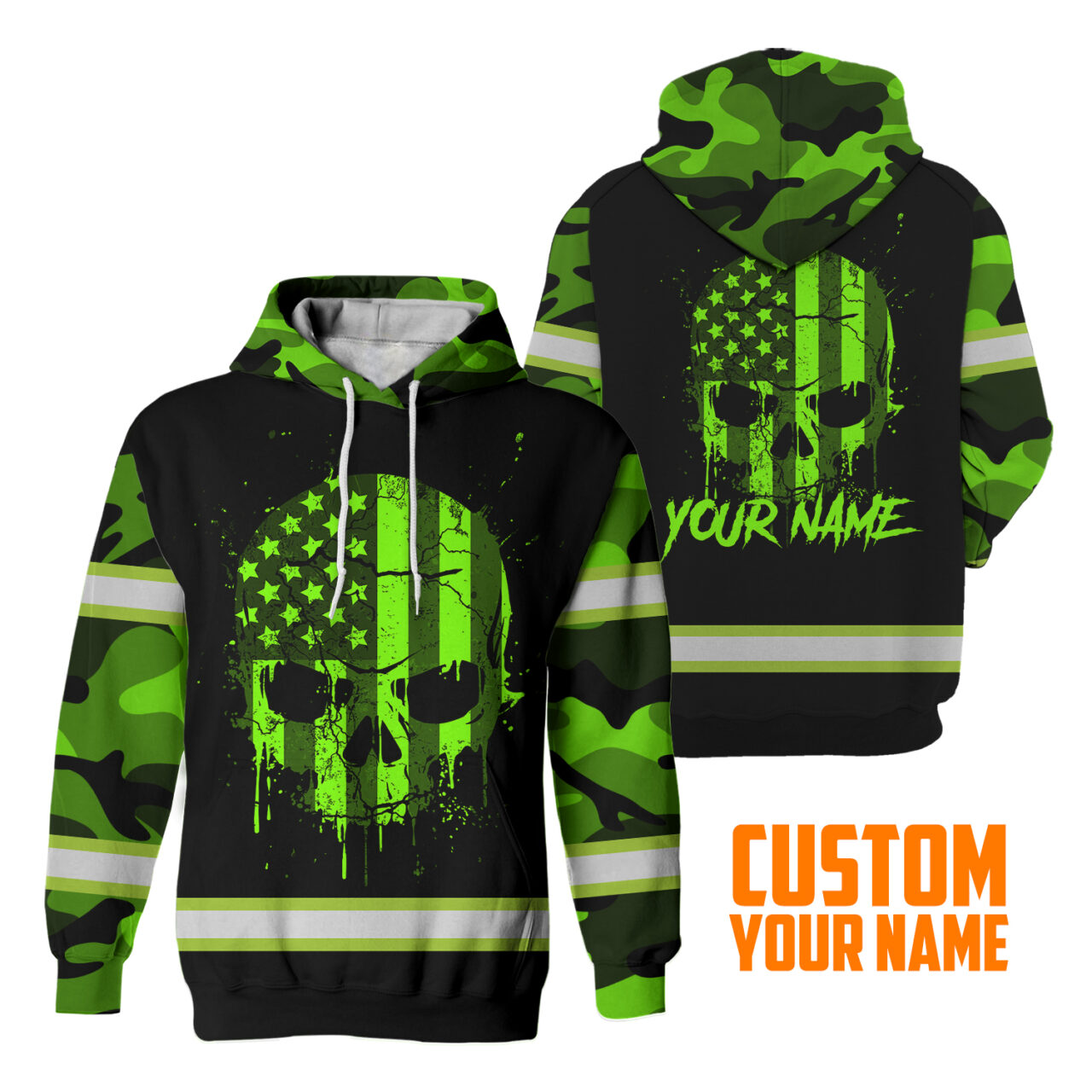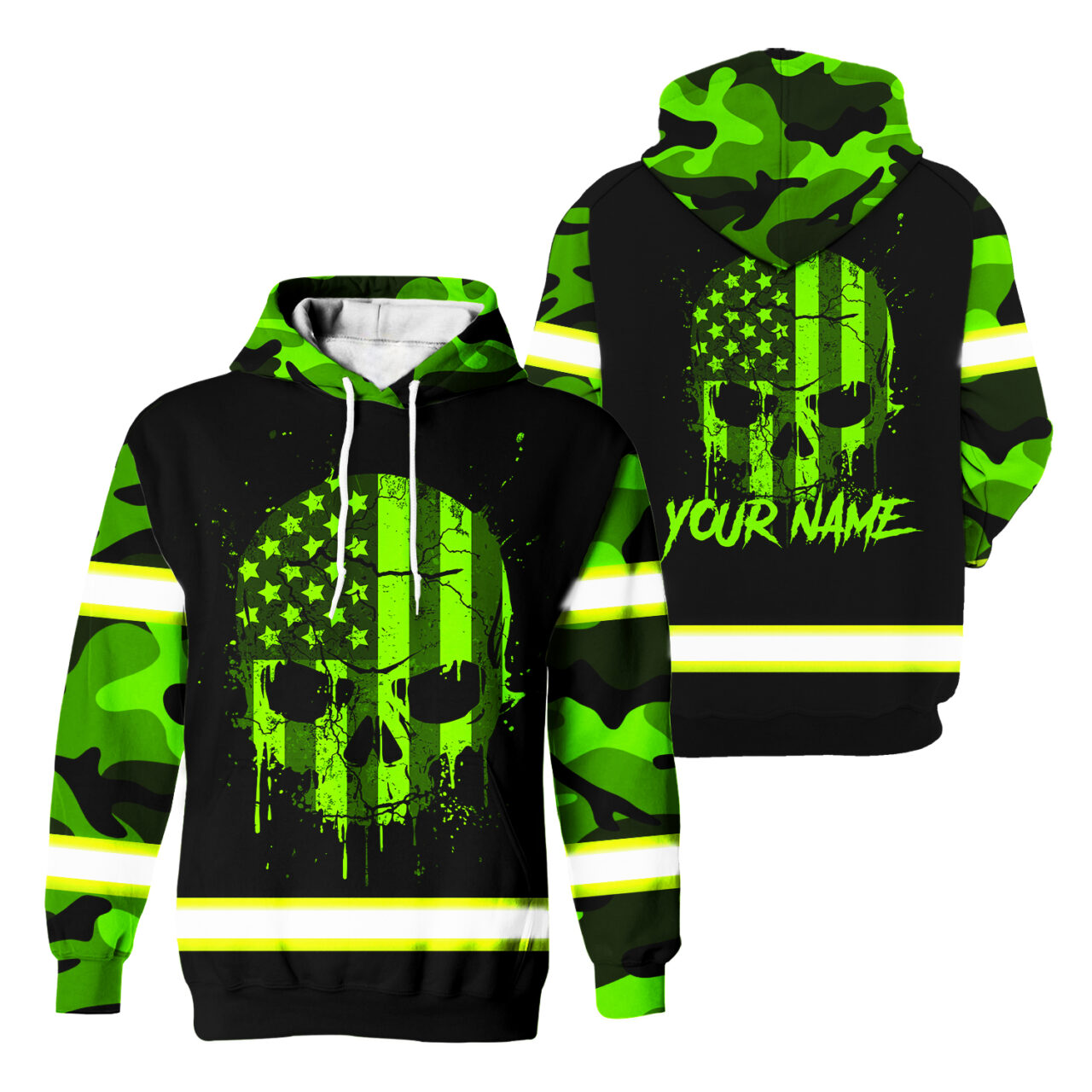 Hi Vis Hoodie Reflective Tapes Skull Camo USA Flag Custom Name Safety Workwear For Workers, Runners, Cyclists, Patriotic Description