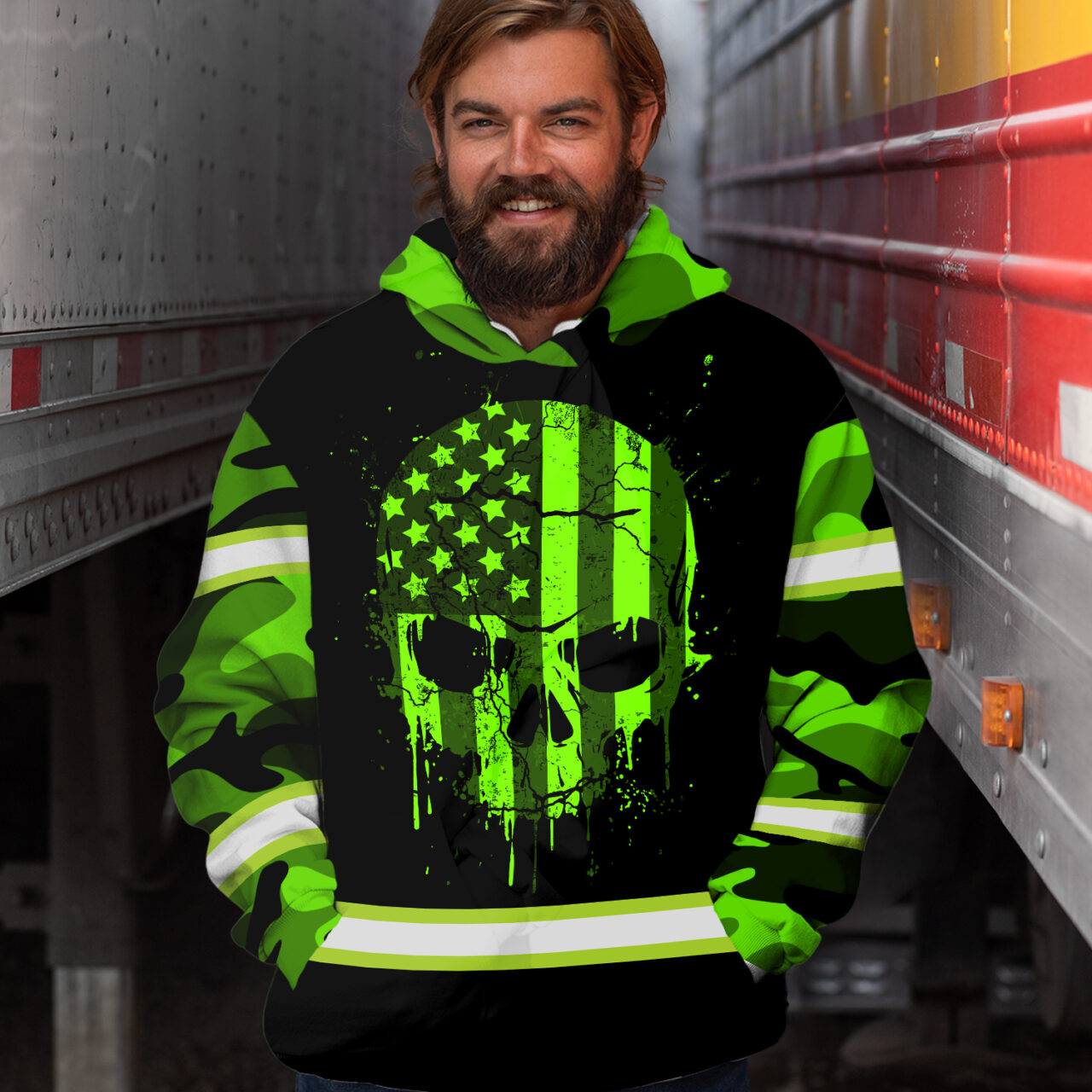 This Hi Vis Hoodie is perfect for patriotic Americans who want to stay safe while working or exercising. The reflective tapes and skull camo design help make the wearer more visible, while the USA flag adds a touch of patriotism. The custom name feature also allows you to personalize the hoodie with your name or initials. This makes it perfect for workers, runners, cyclists, or anyone else who wants to stay safe while showing their love for America. Order yours today and be sure to stay safe out there!