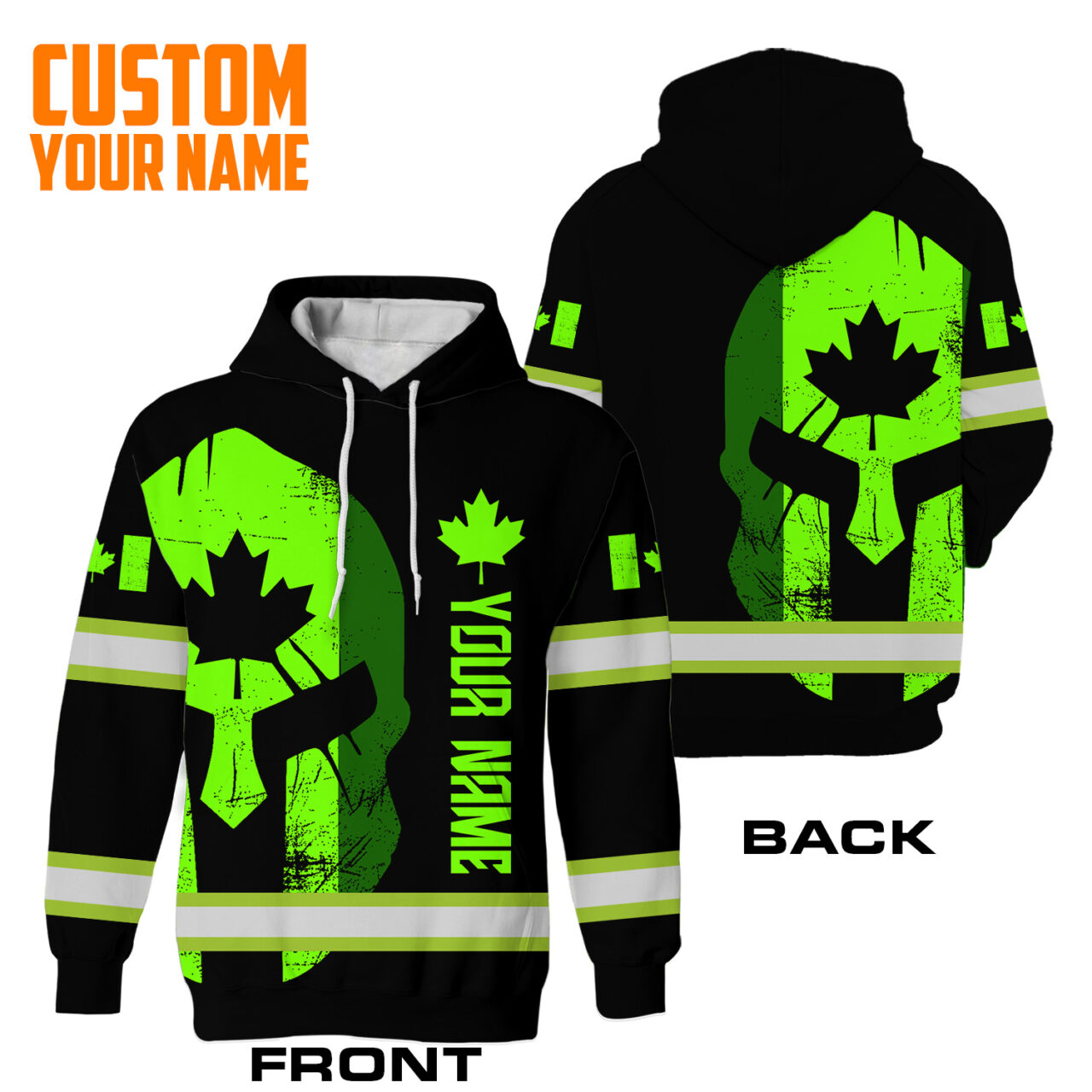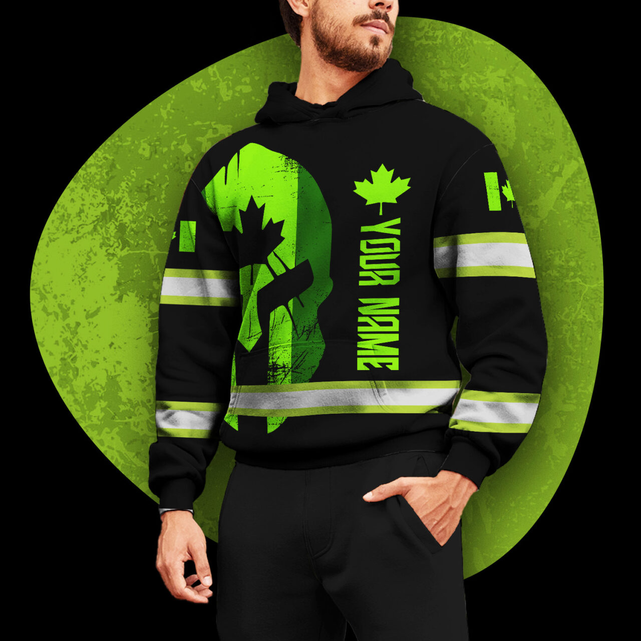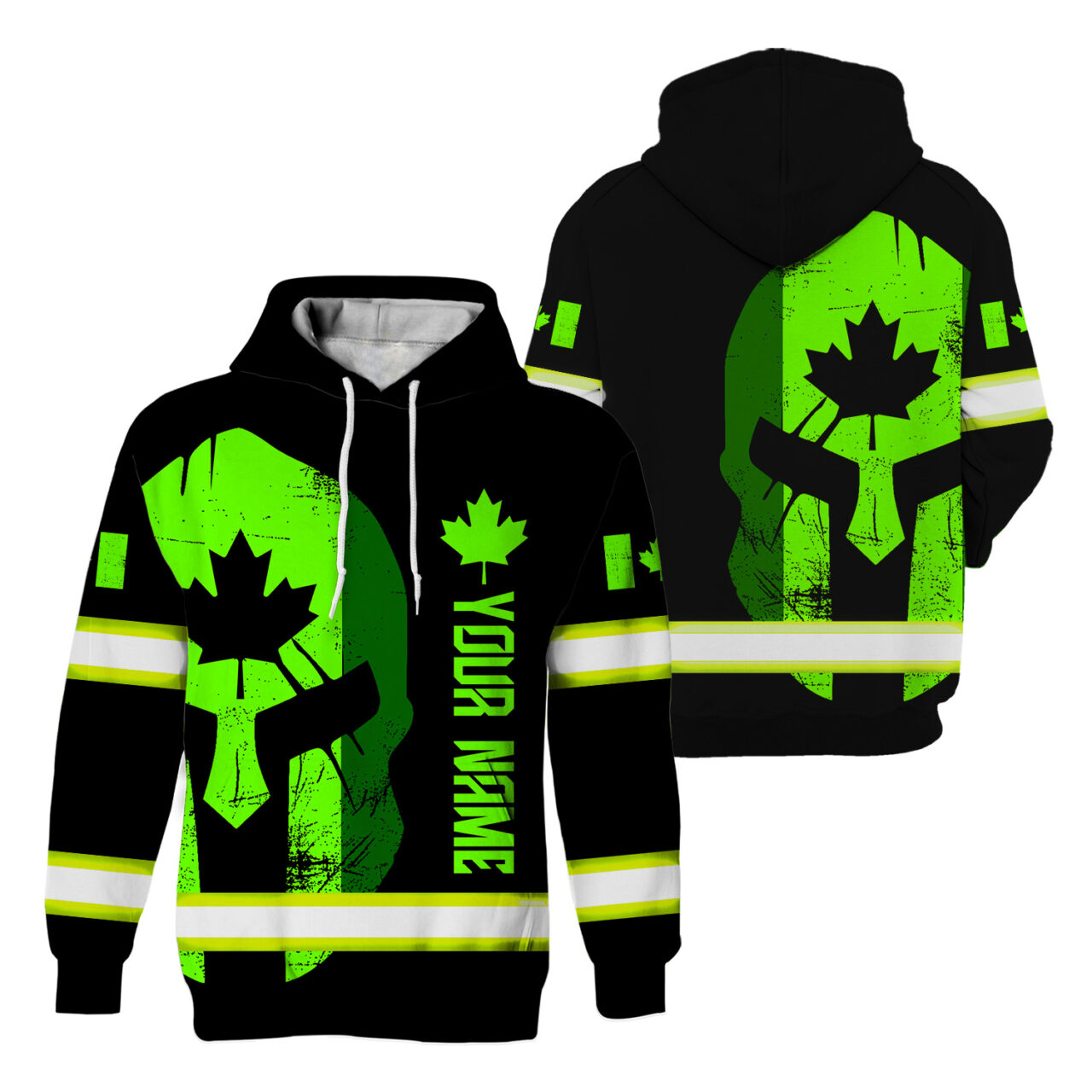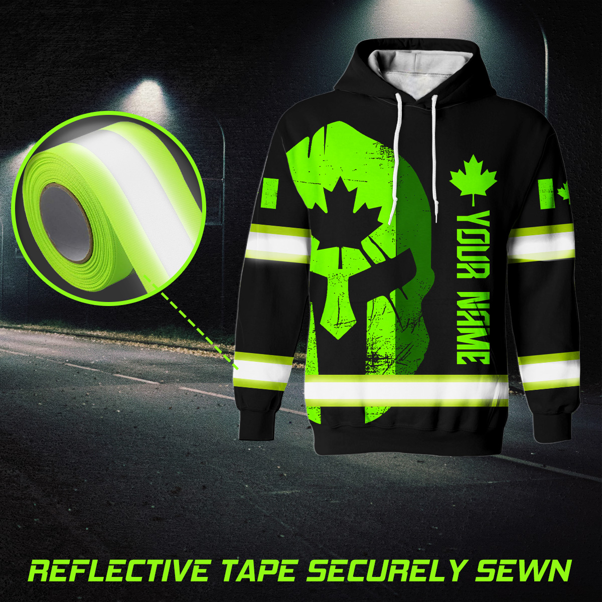 Hi Vis Hoodie Reflective Tapes Skull Green Neon Scratch Canada Flag Custom Name Safety Workwear For Canadian Workers, Runners, Cyclists, Patriotic