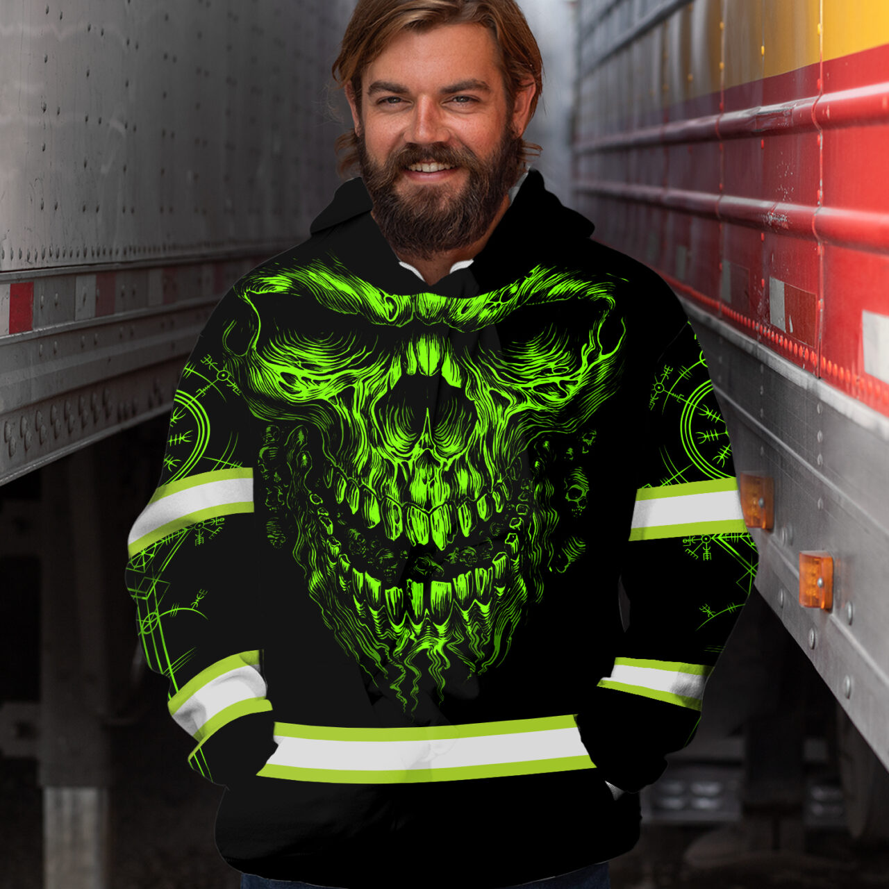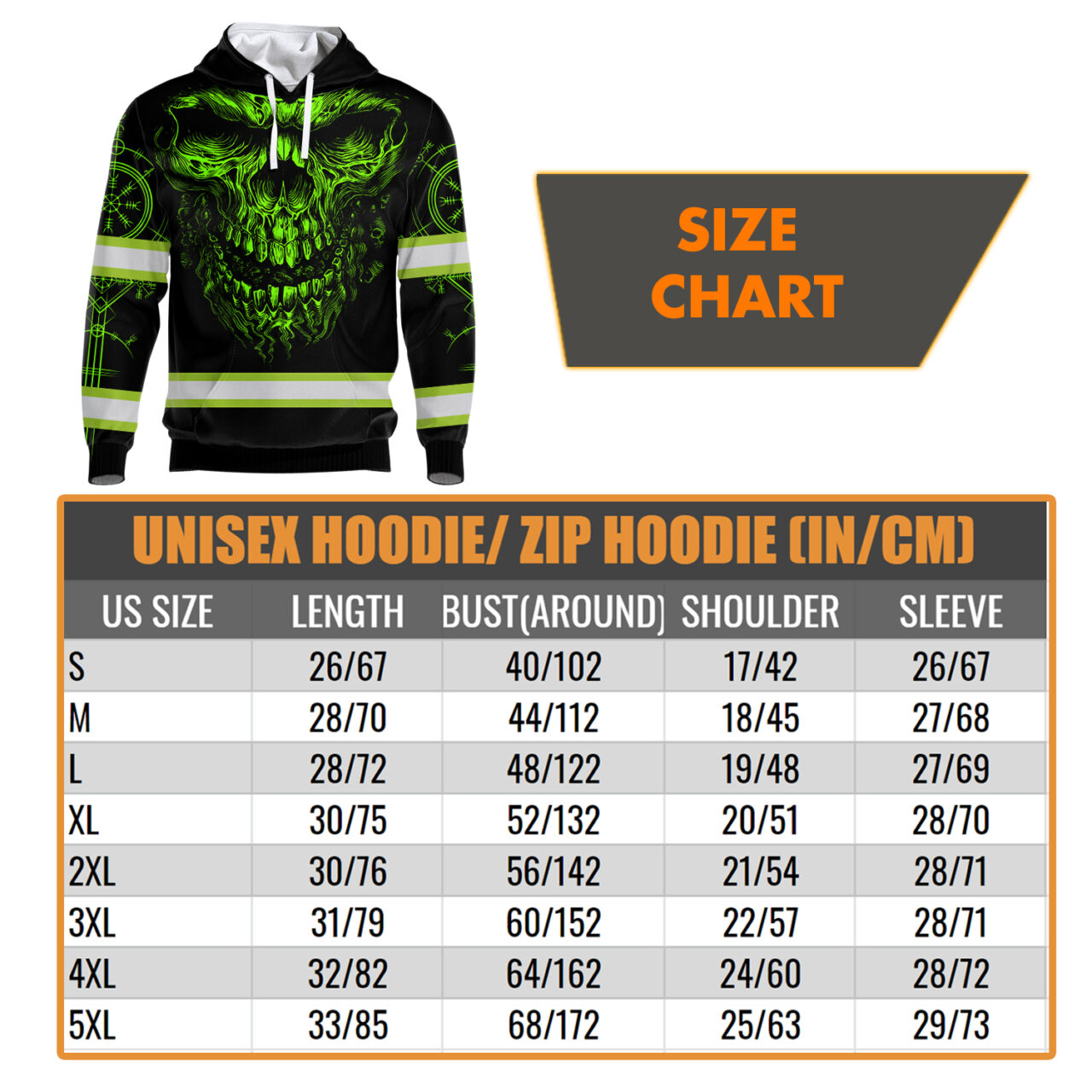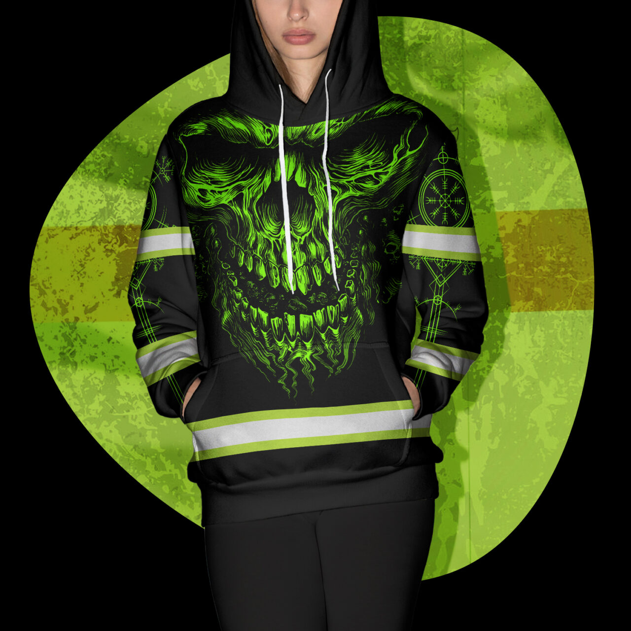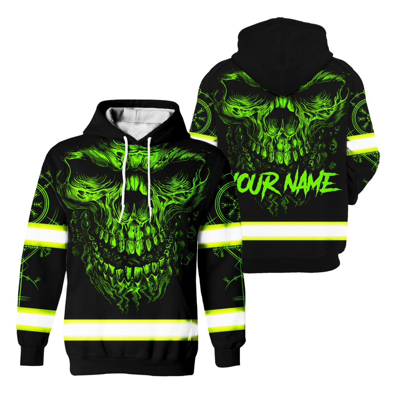 Hi Vis Hoodie Reflective Tapes Skull Viking Symbol Tattoo Green Neon Custom Name Safety Workwear