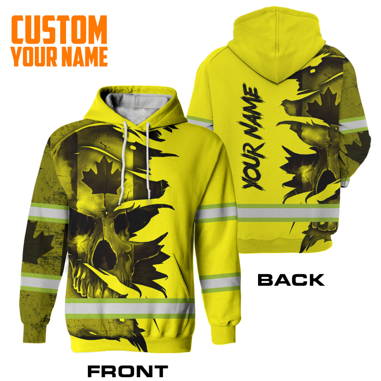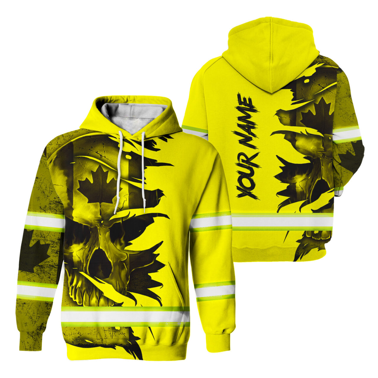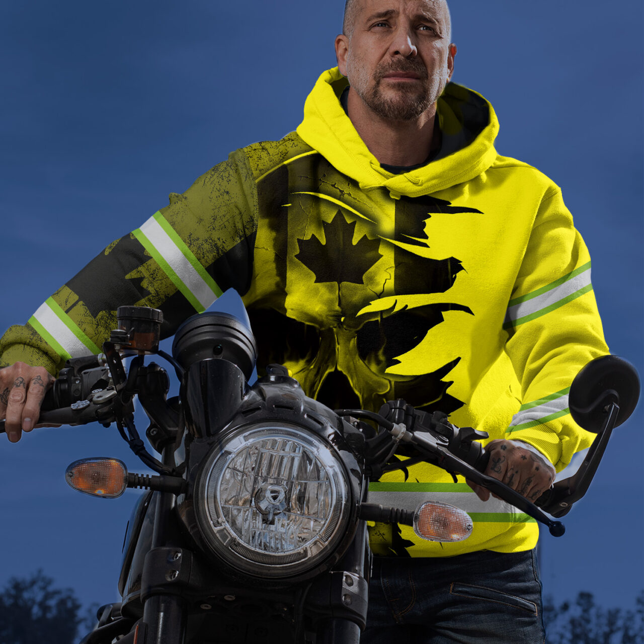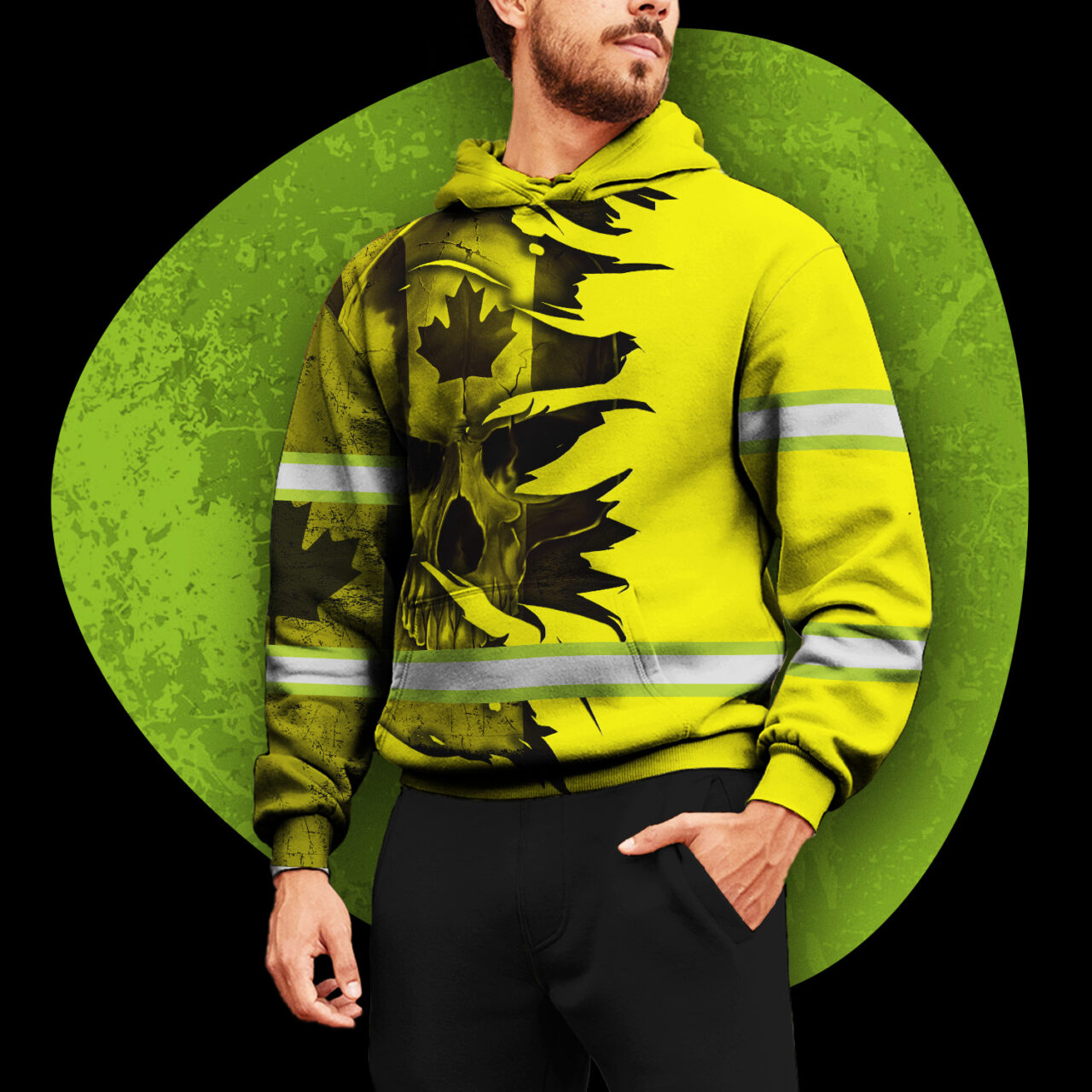 Hi Vis Hoodie Reflective Tapes Yellow Neon Skull Canada Flag Scratch Custom Name Safety Workwear For Workers, Runners, Cyclists, Patriotic