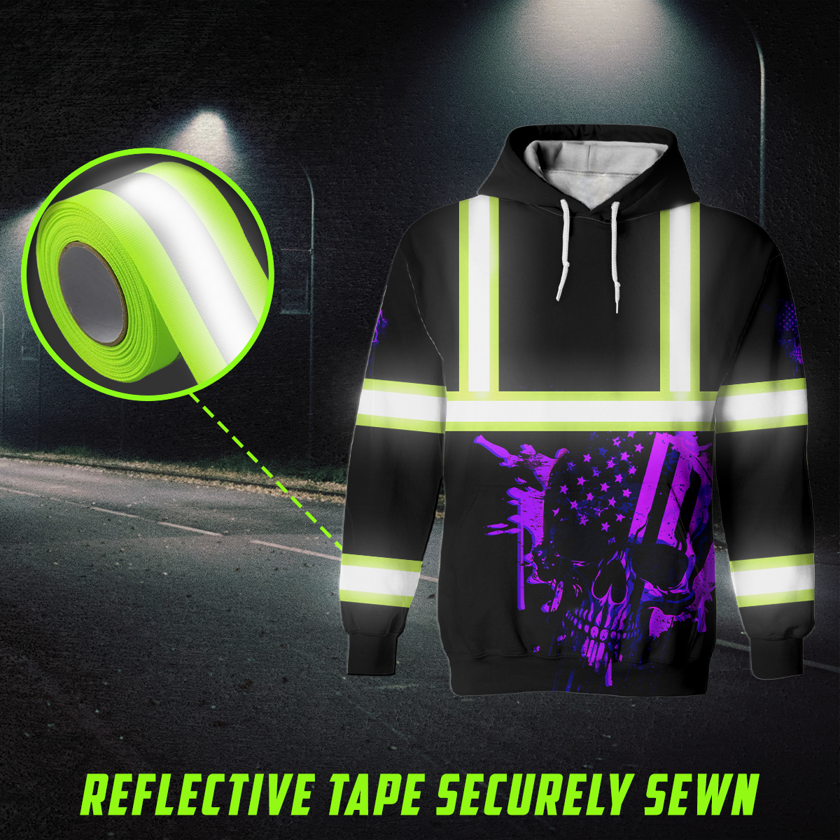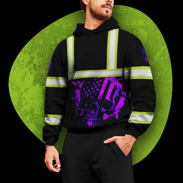 Hi Vis Hoodie Reflective Violet Neon USA Skull Custom Name Safety Workwear For Workers, Runners, Cyclists, Patriotic