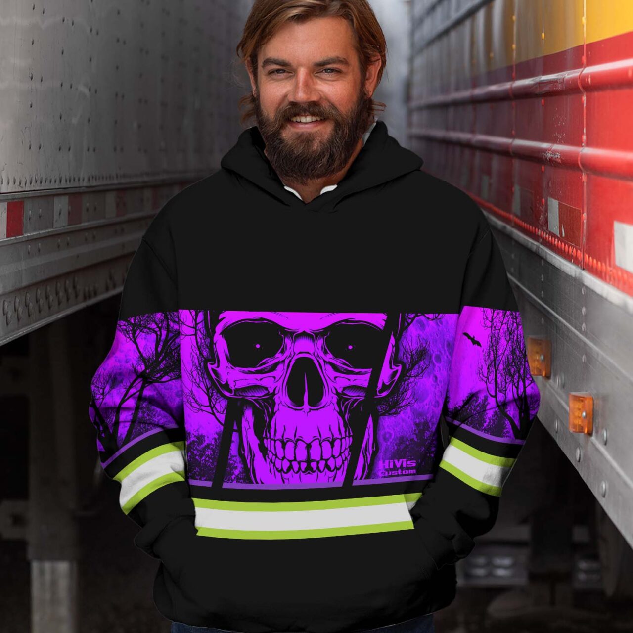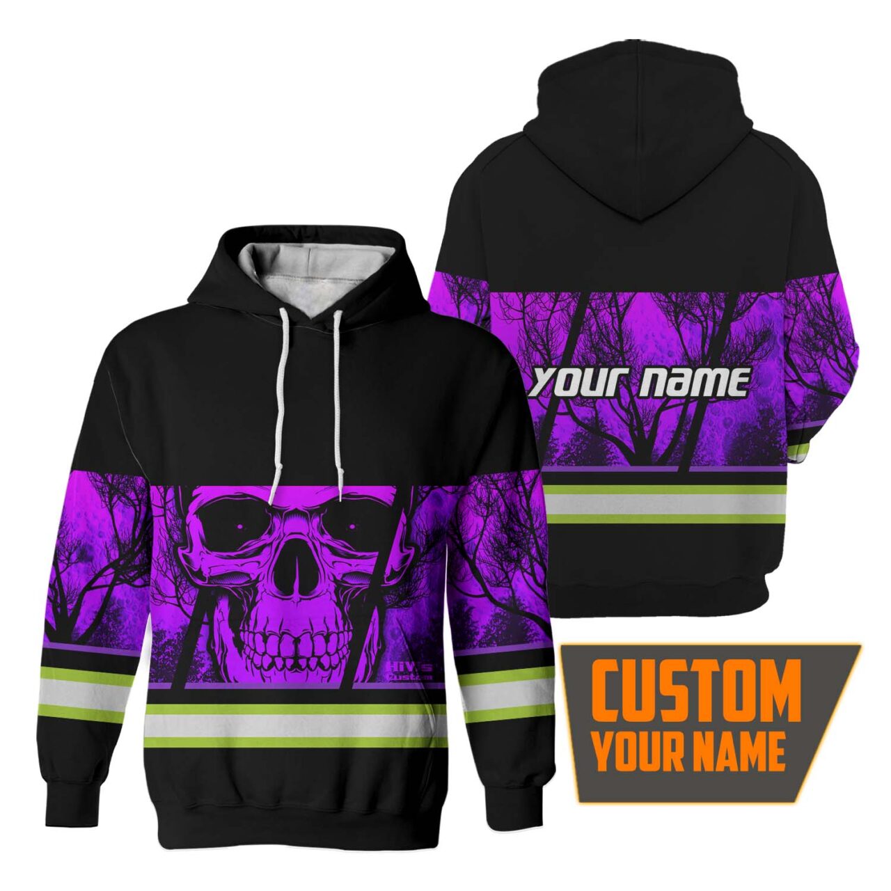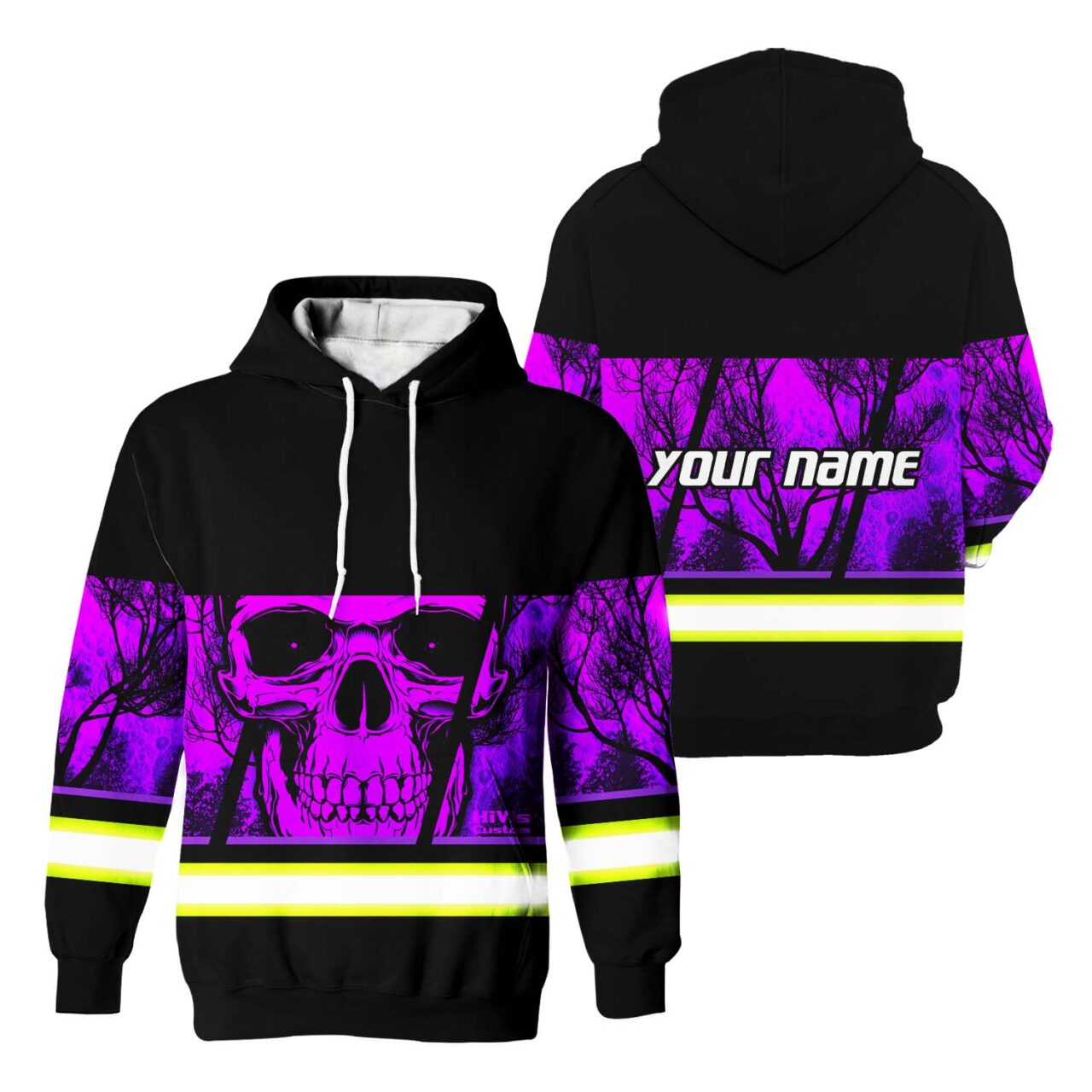 Hi Vis Hoodie Reflective Violet Skull USA Flag Custom Name Safety Workwear For Worker, Operator, Trucker