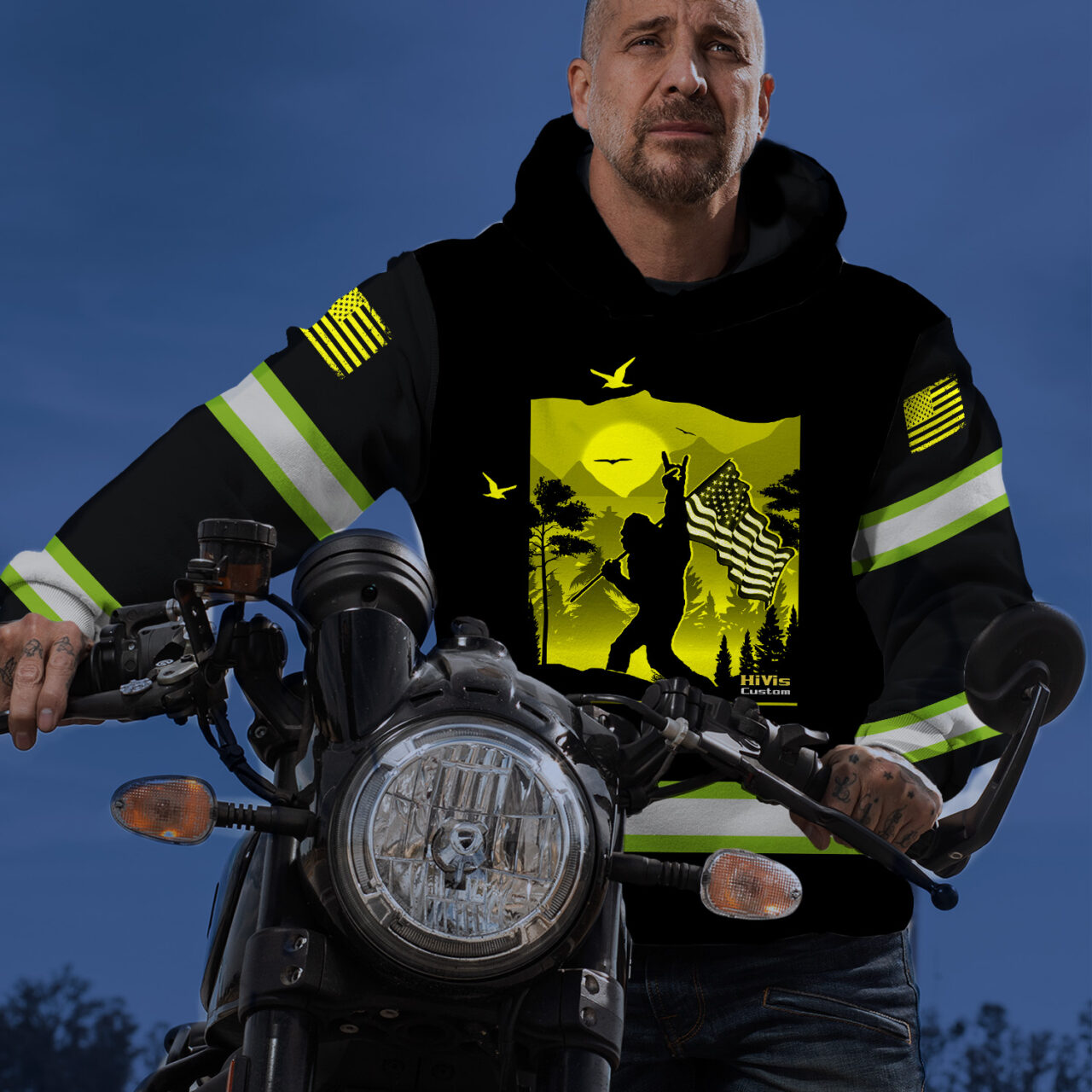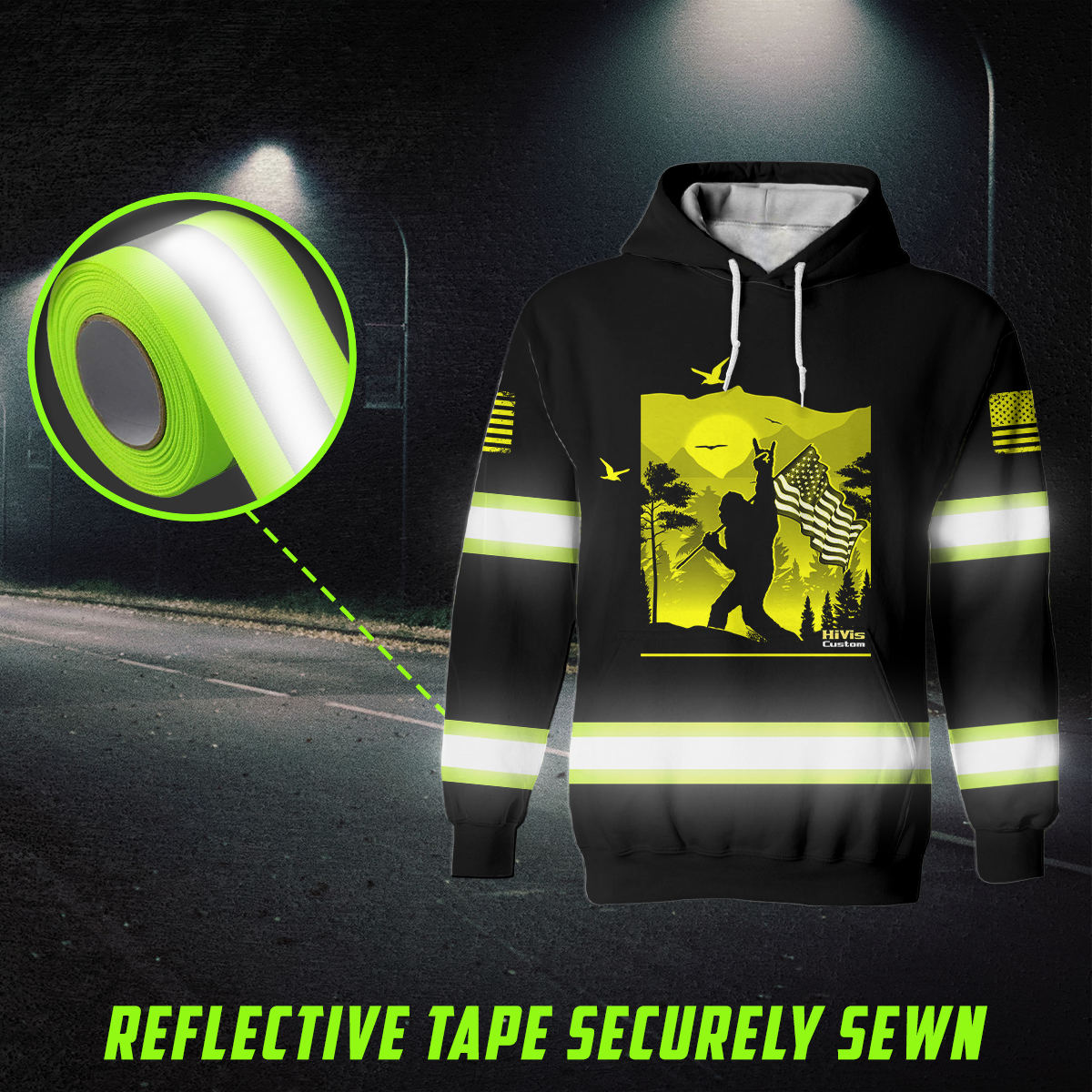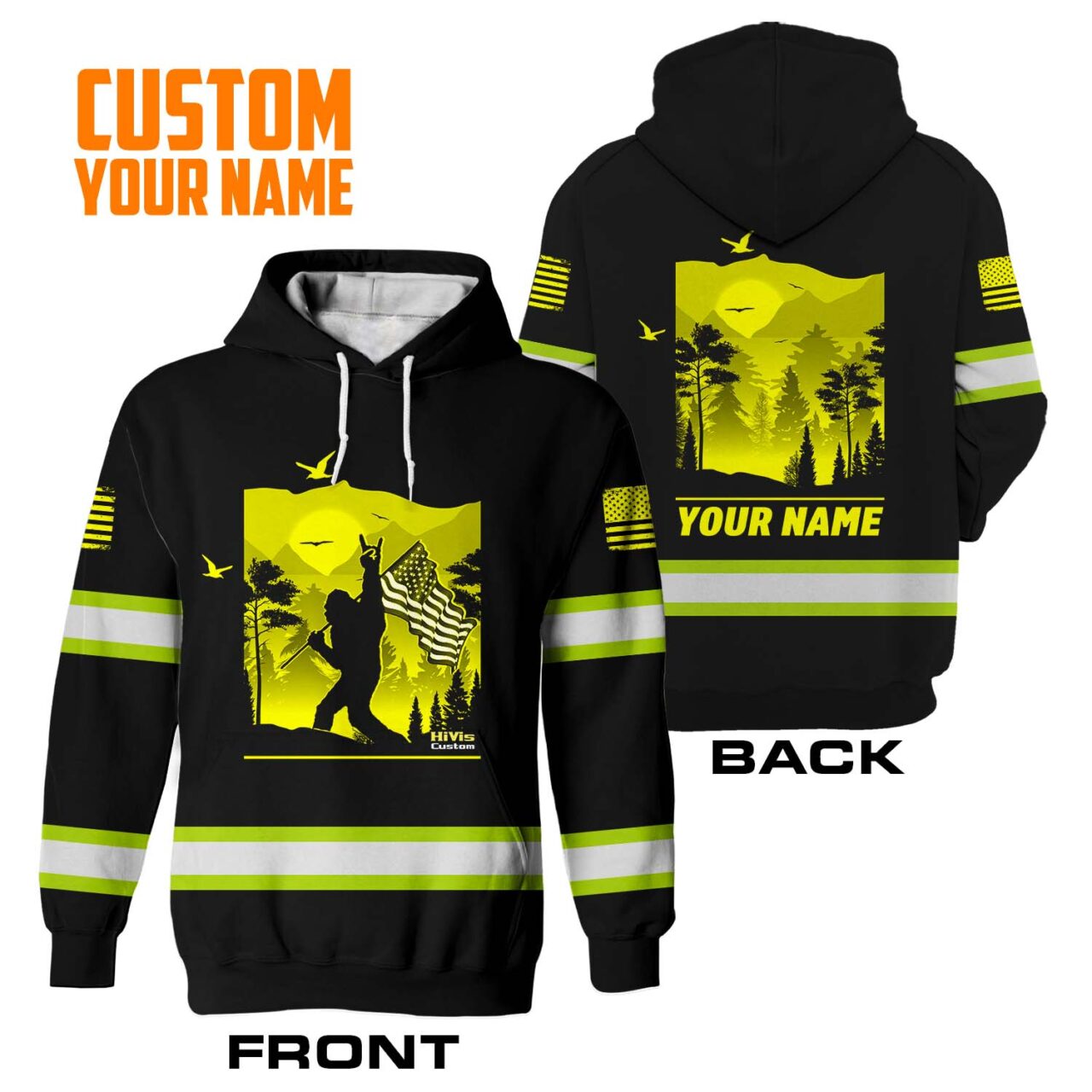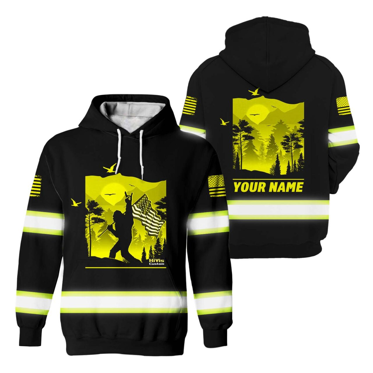 Hi Vis Hoodie Reflective Yellow Gorilla USA Flag Custom Name Safety Workwear For Workers, Runners, Cyclists, Patriotic