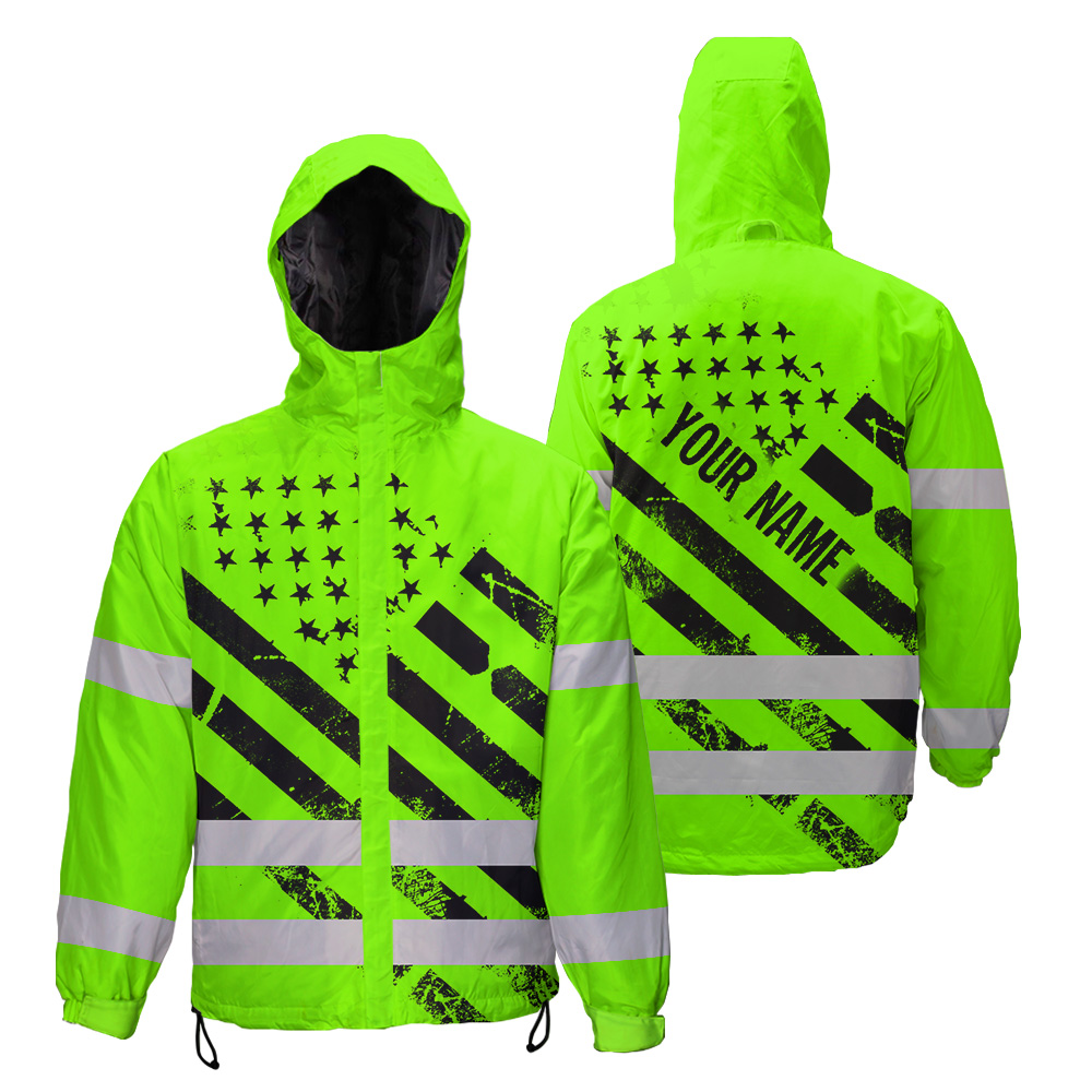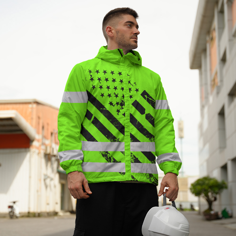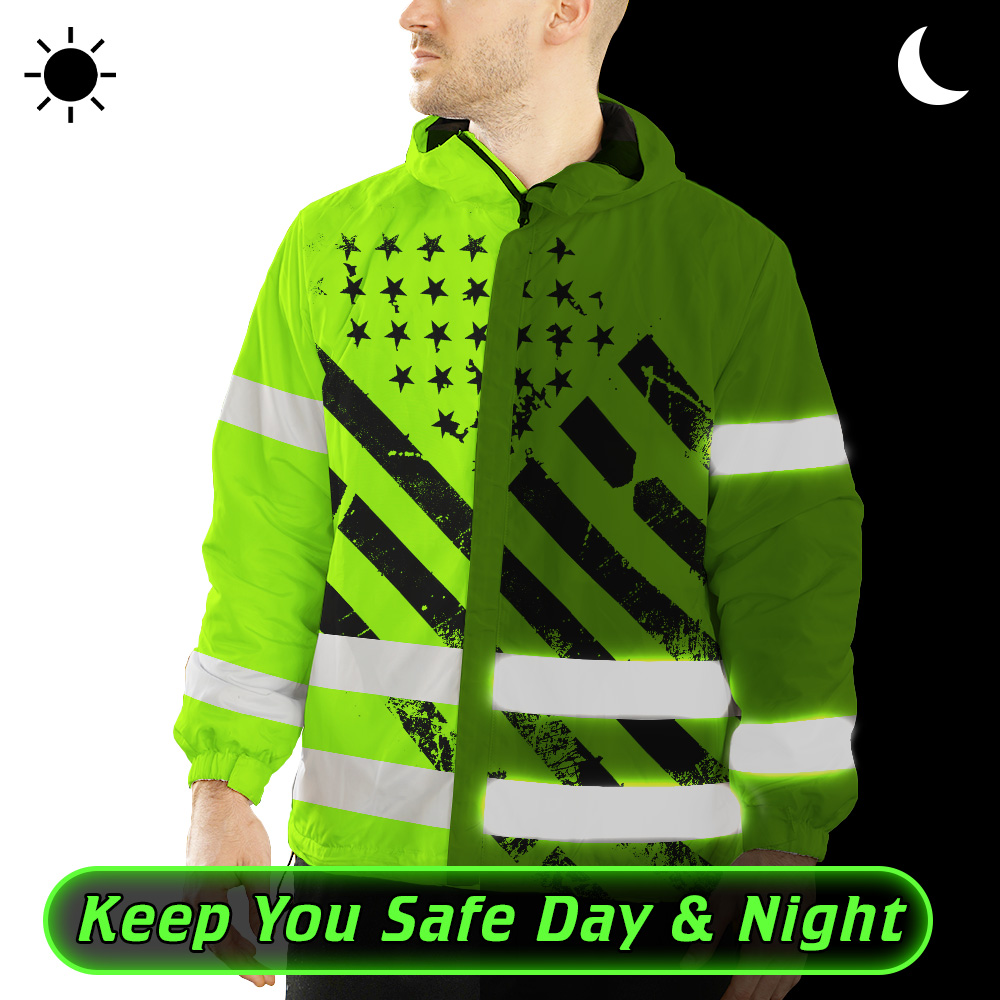 Hi Vis Jacket Waterproof And Windproof Reflective Black Green USA Flag