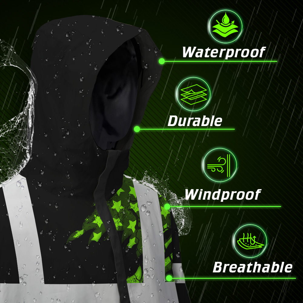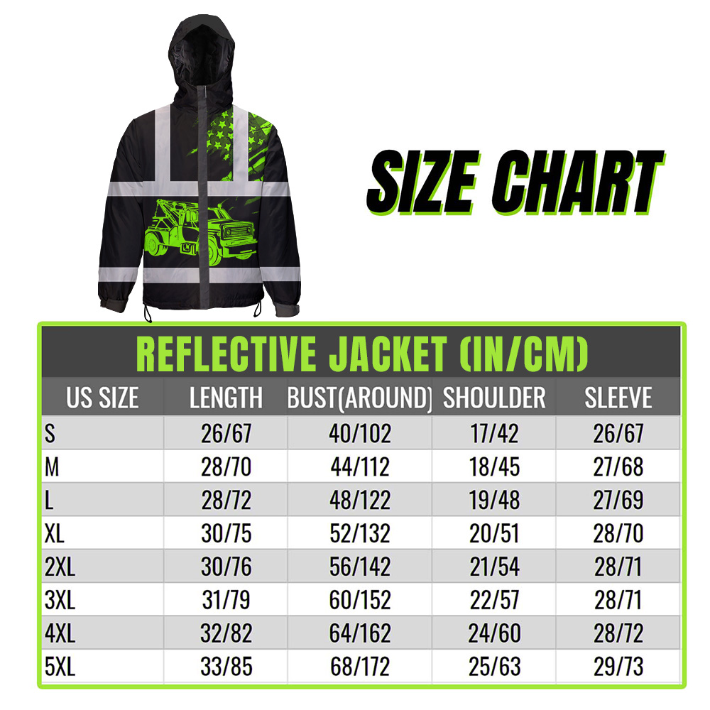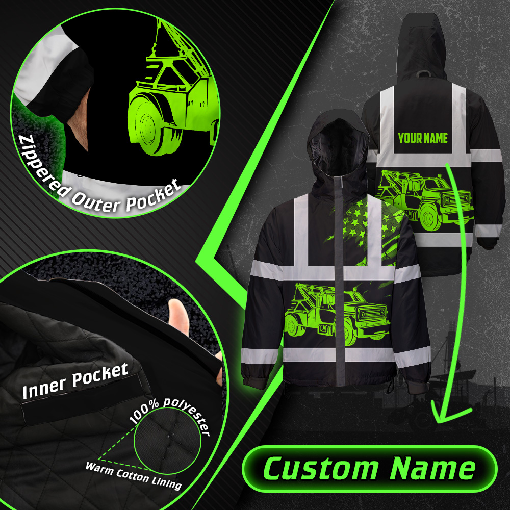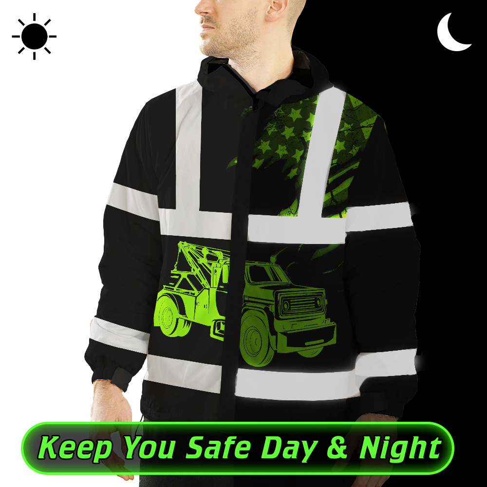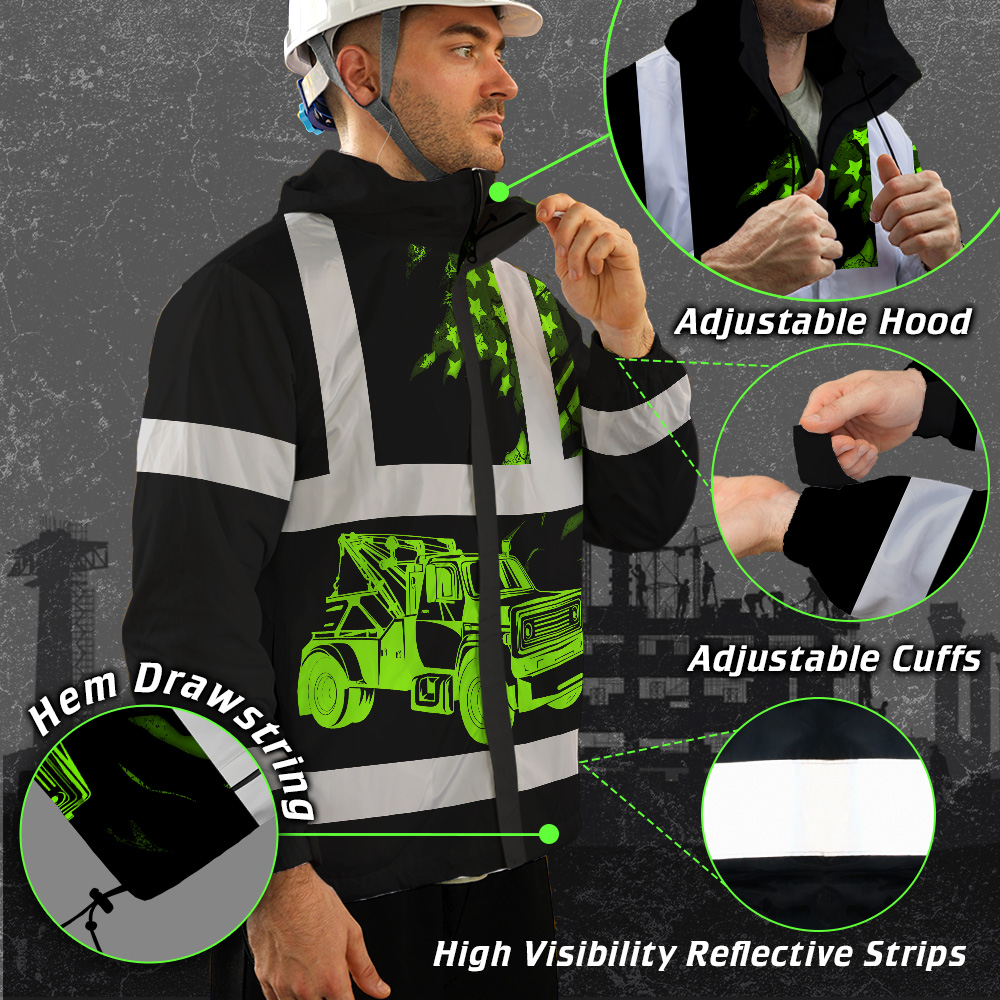 Hi Vis Jacket Waterproof And Windproof Reflective Black Tow Truck Driver Custom Name Safety Workwear For Truckers, Workers, Runners, Cyclists, Patriotic