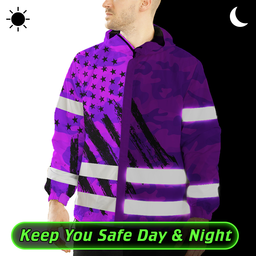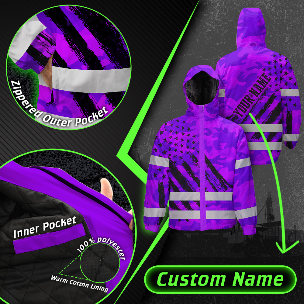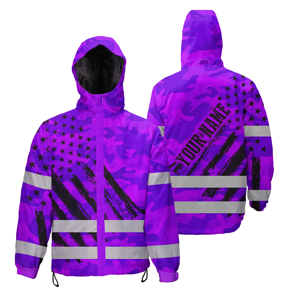 Hi Vis Jacket Waterproof And Windproof Reflective Camo Violet Neon US Flag Custom Name Safety Workwear For Truckers, Workers, Runners, Cyclists, Patriotic