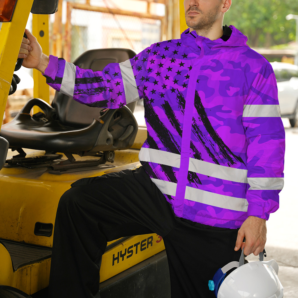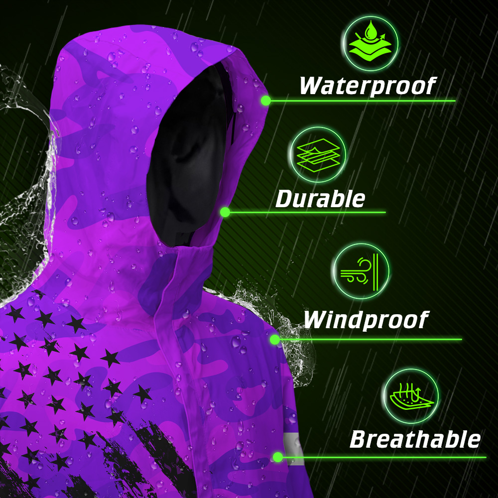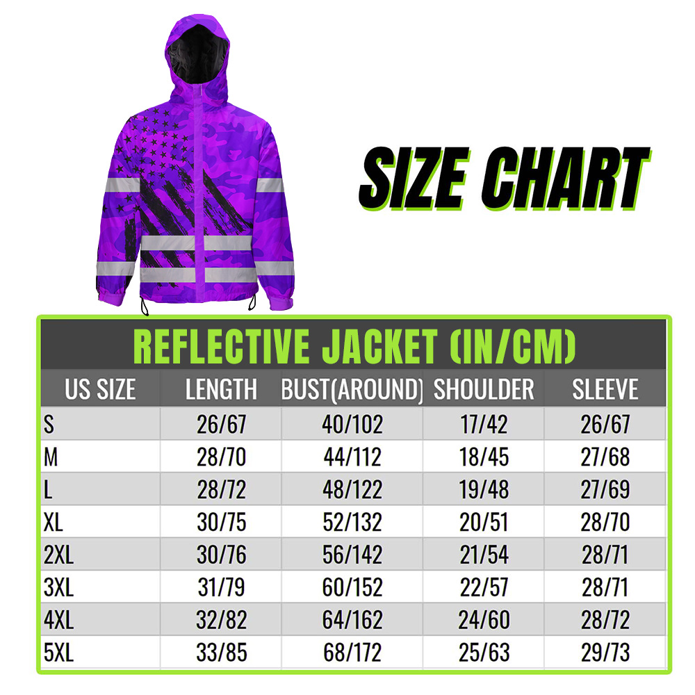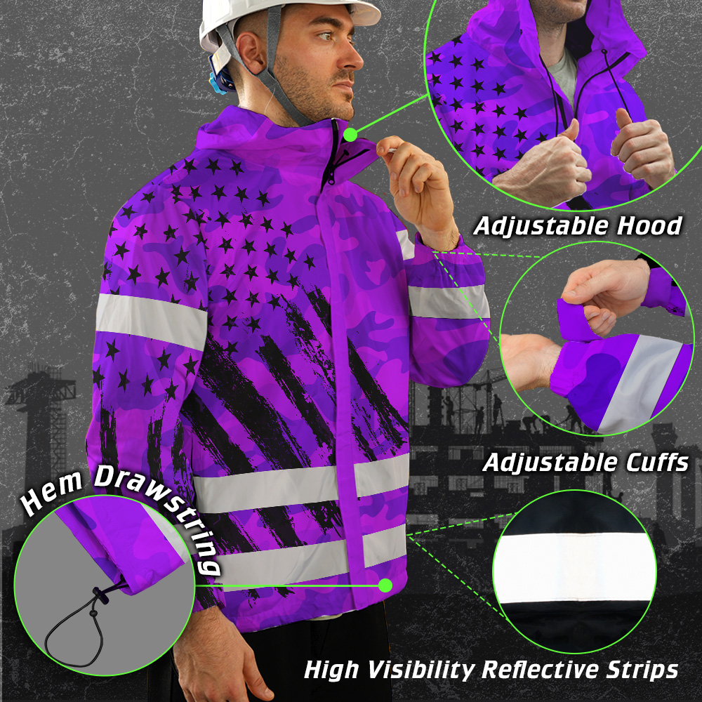 Hi Vis Jacket Waterproof And Windproof Reflective Camo Violet Neon US Flag Custom Name Safety Workwear For Truckers, Workers, Runners, Cyclists, Patriotic