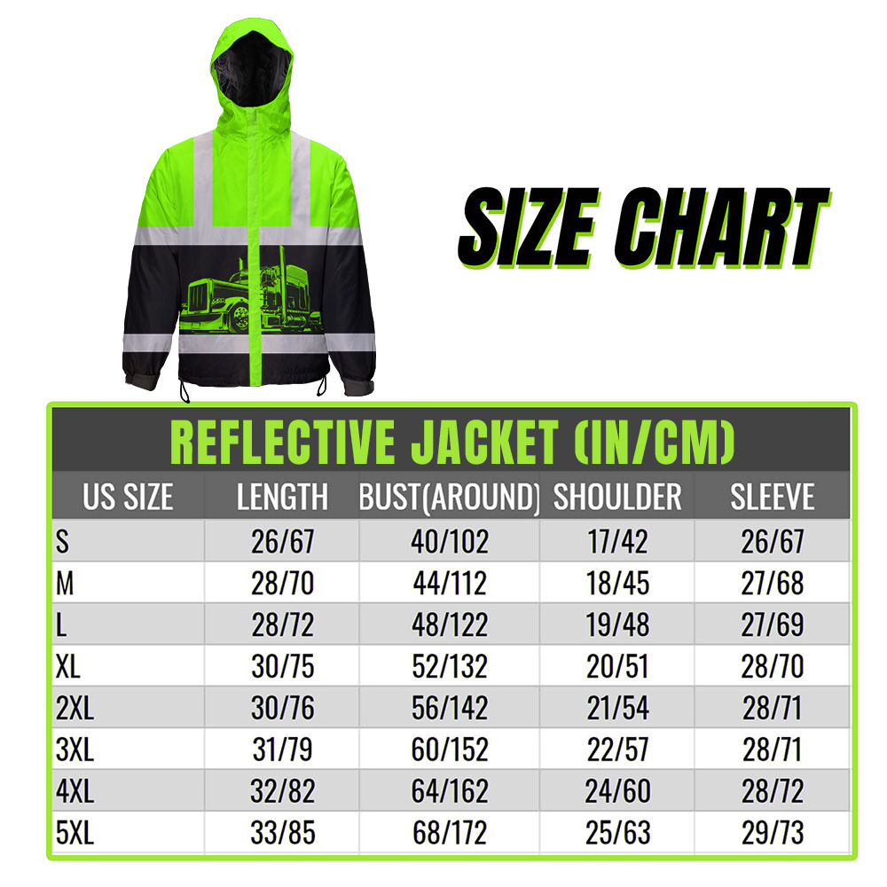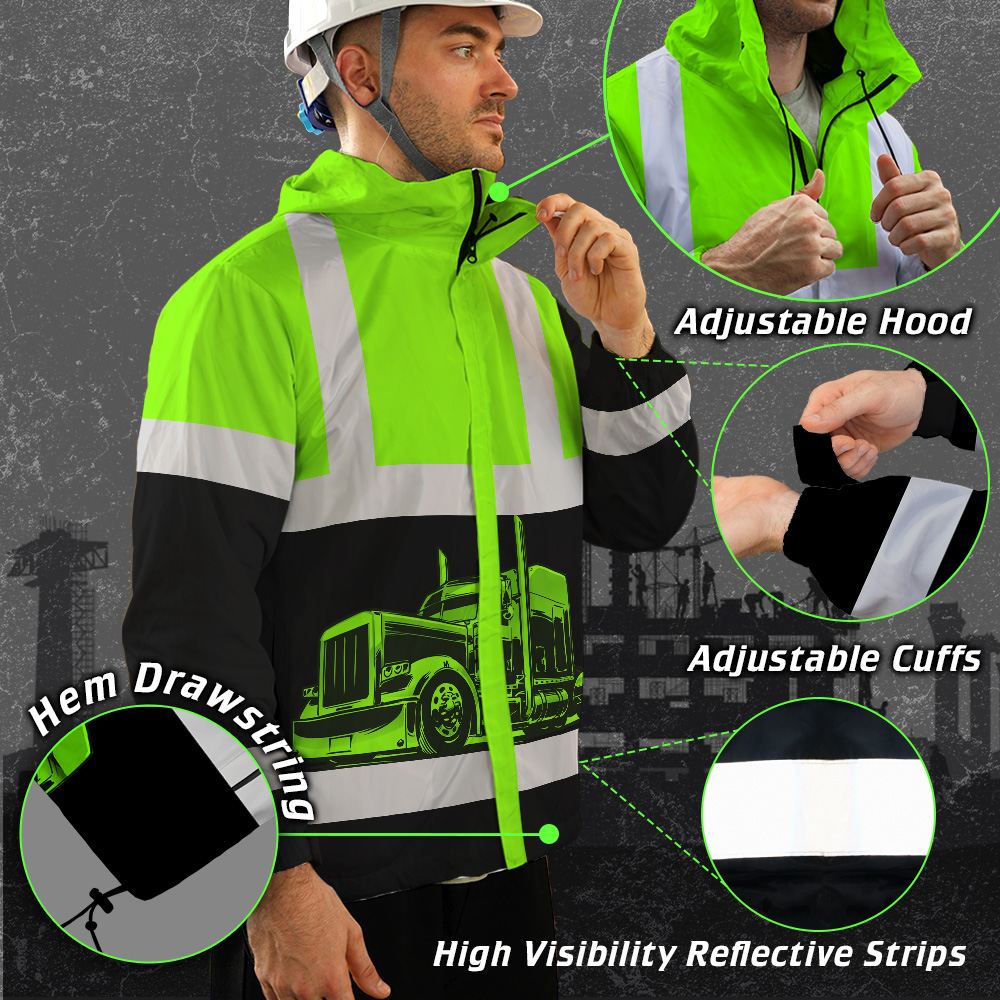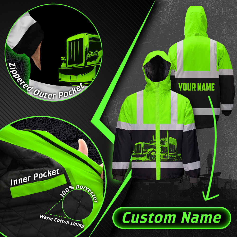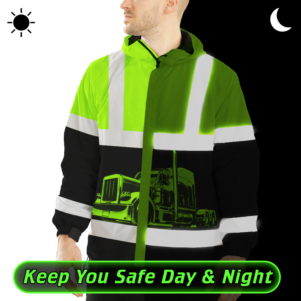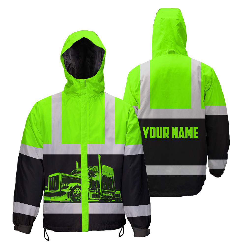 Hi Vis Jacket Waterproof And Windproof Reflective Green Semi Truck Driver Custom Name Safety Workwear For Truckers, Workers, Runners, Cyclists, Patriotic