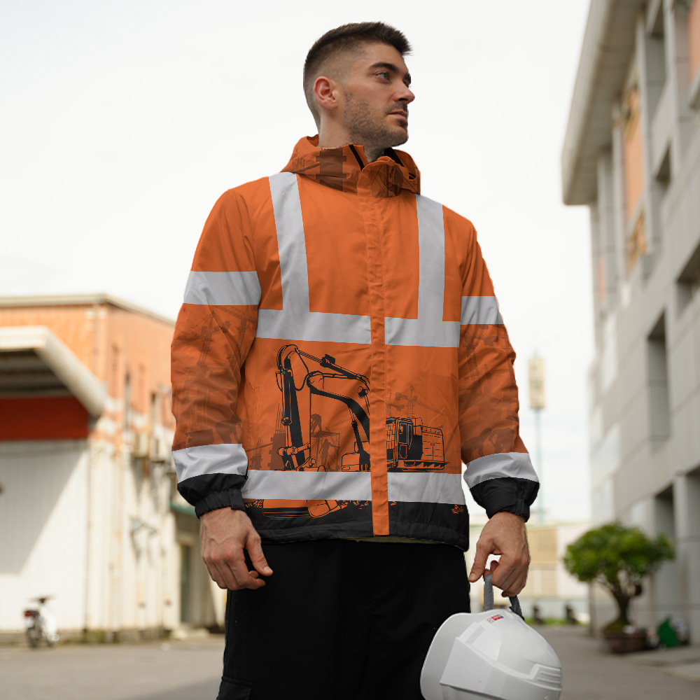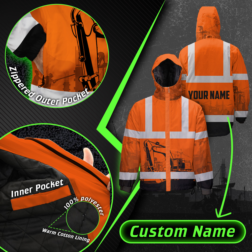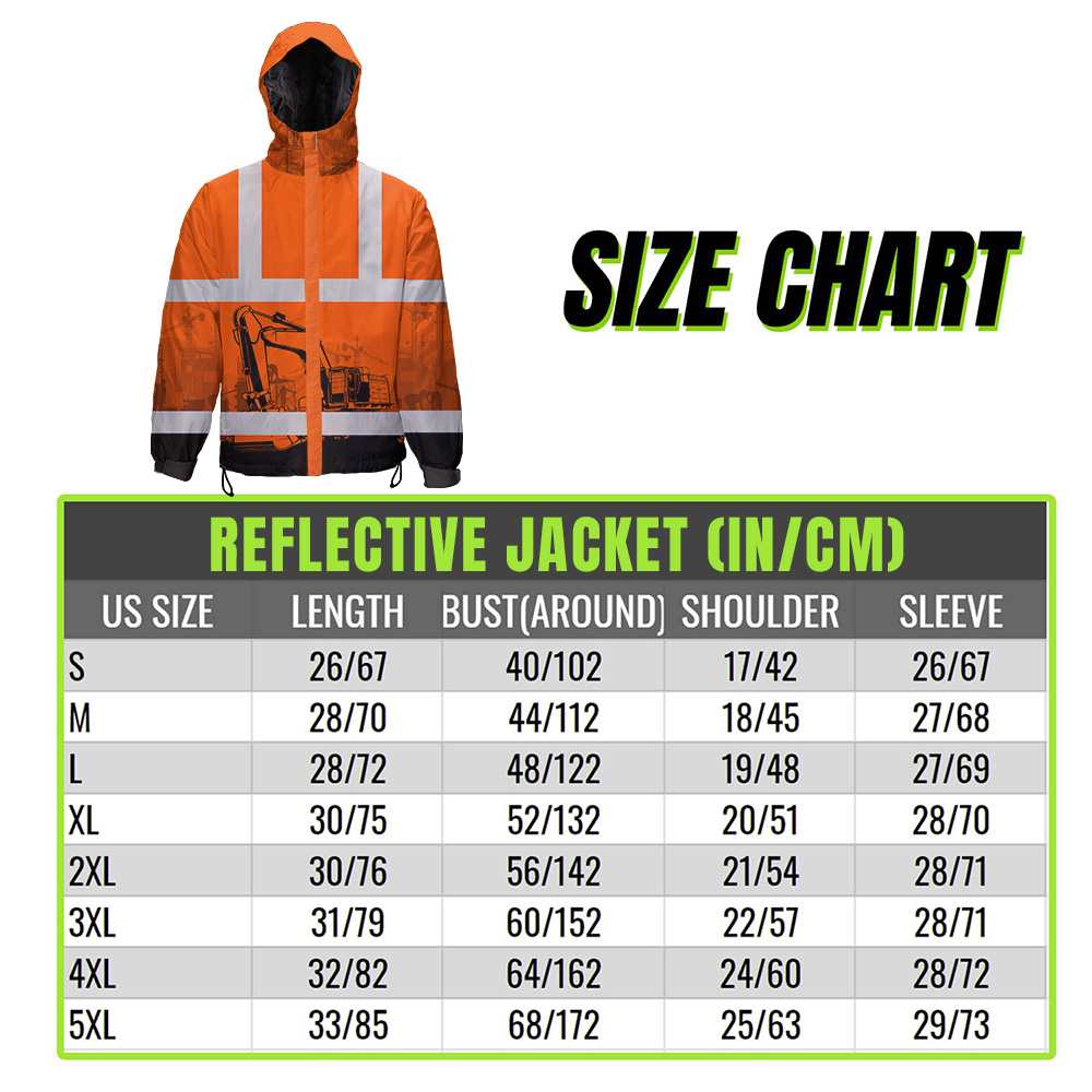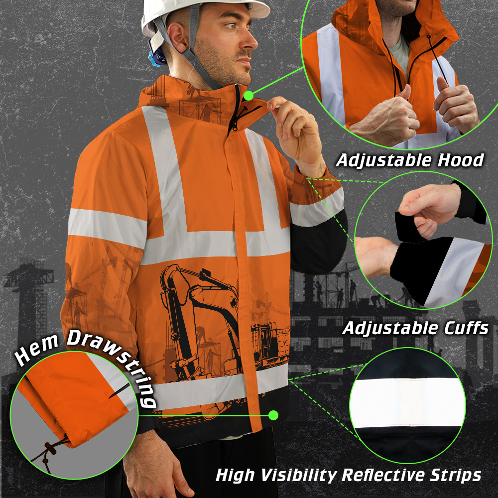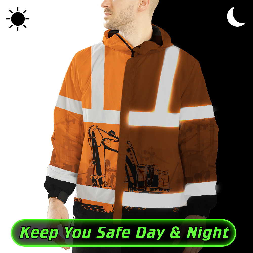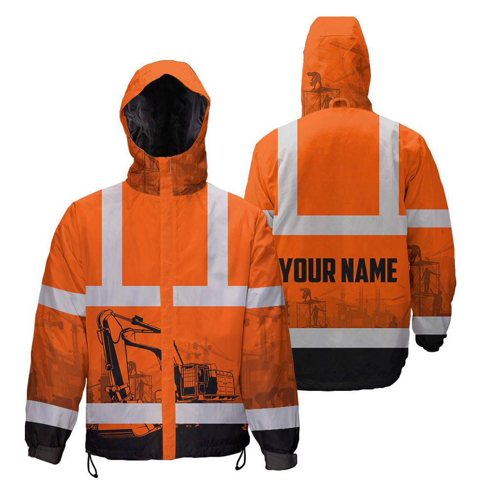 Hi Vis Jacket Waterproof And Windproof Reflective Orange Excavator Operator Custom Name Safety Workwear For Truckers, Workers, Runners, Cyclists, Patriotic