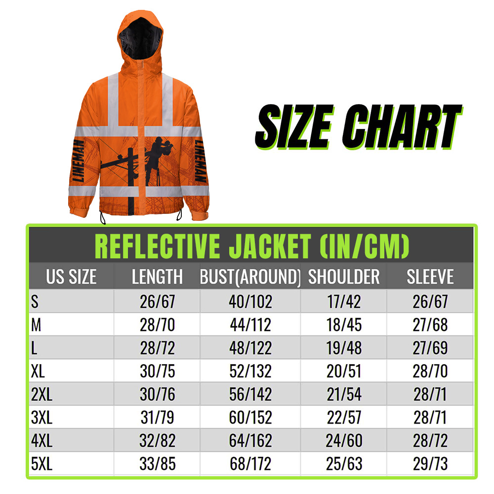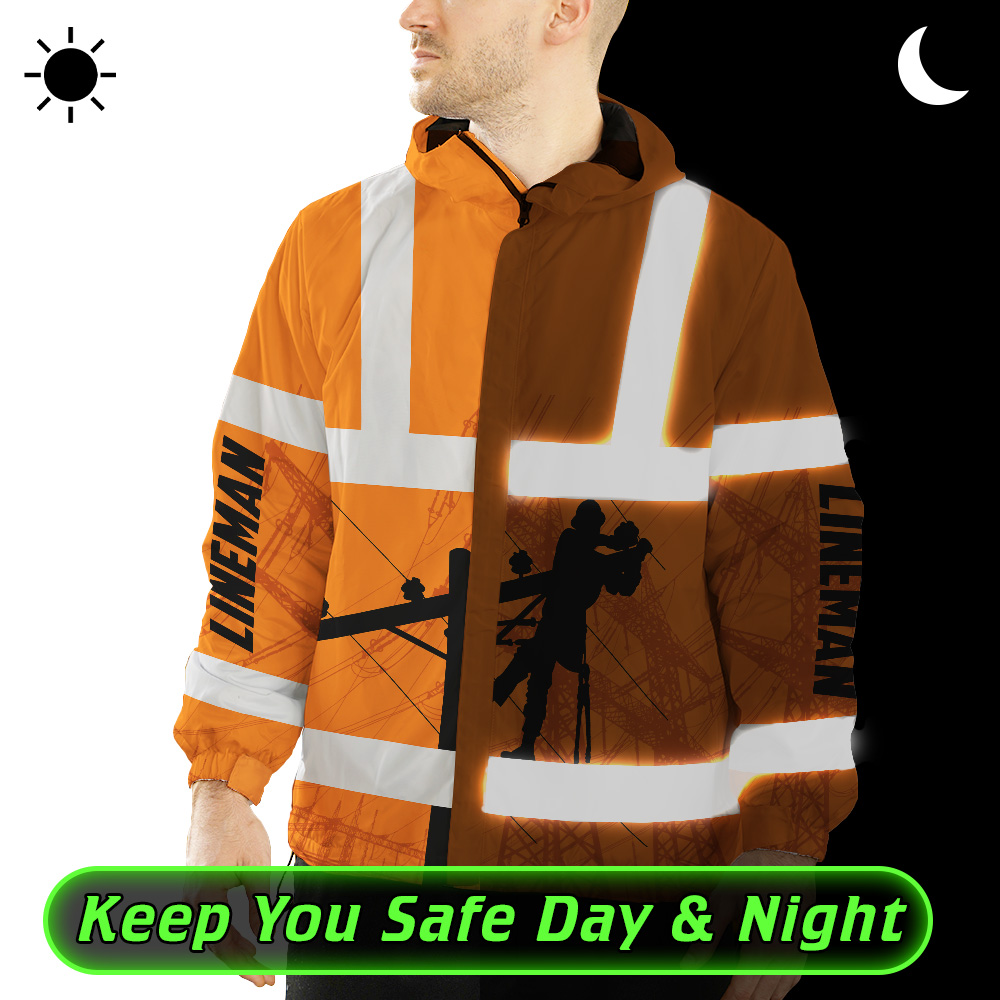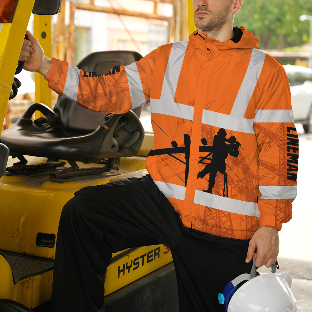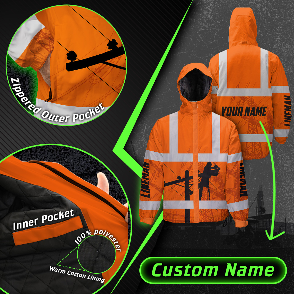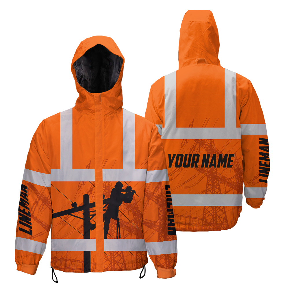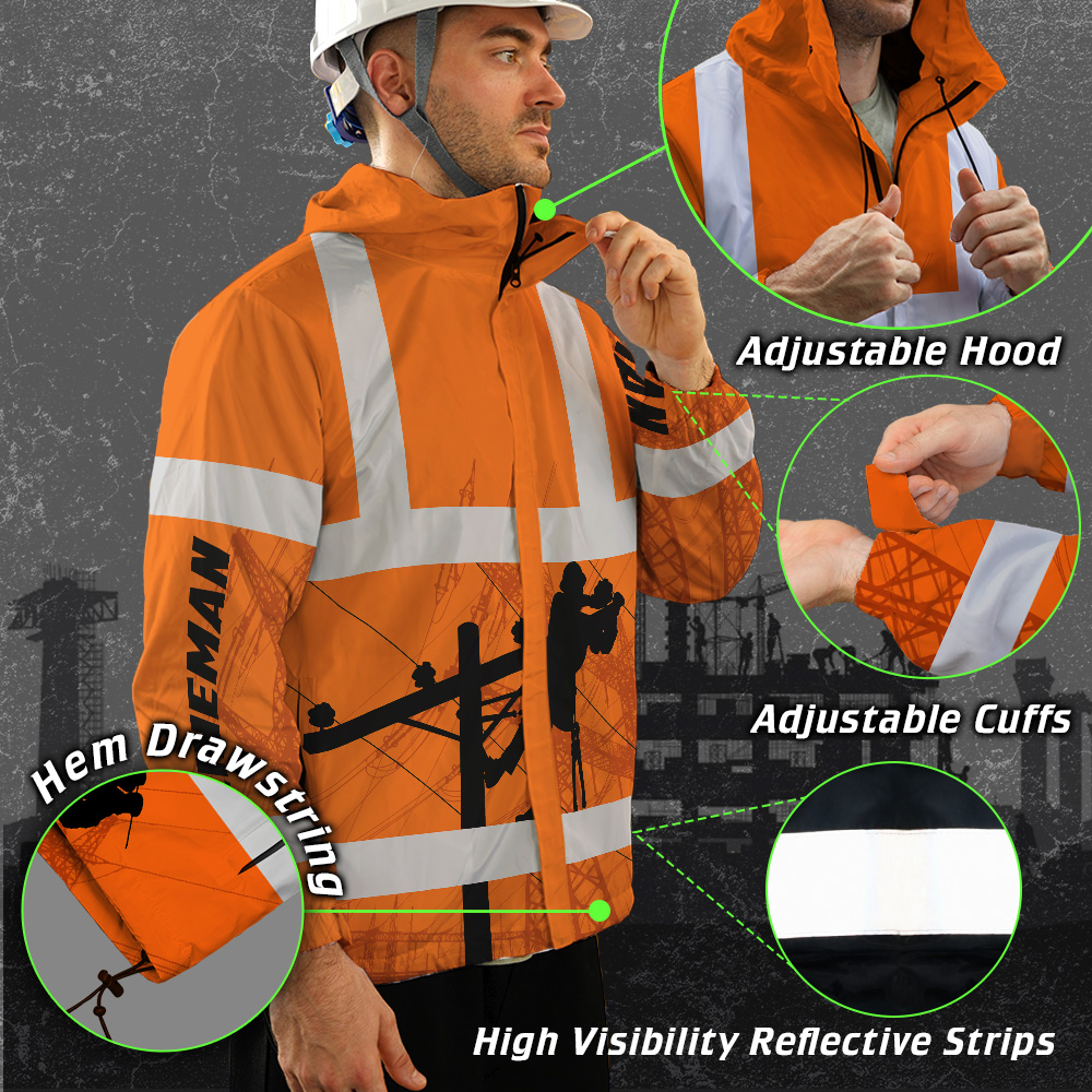 Hi Vis Jacket Waterproof And Windproof Reflective Orange Lineman Custom Name Safety Workwear For Lineman, Workers, Runners, Cyclists, Patriotic