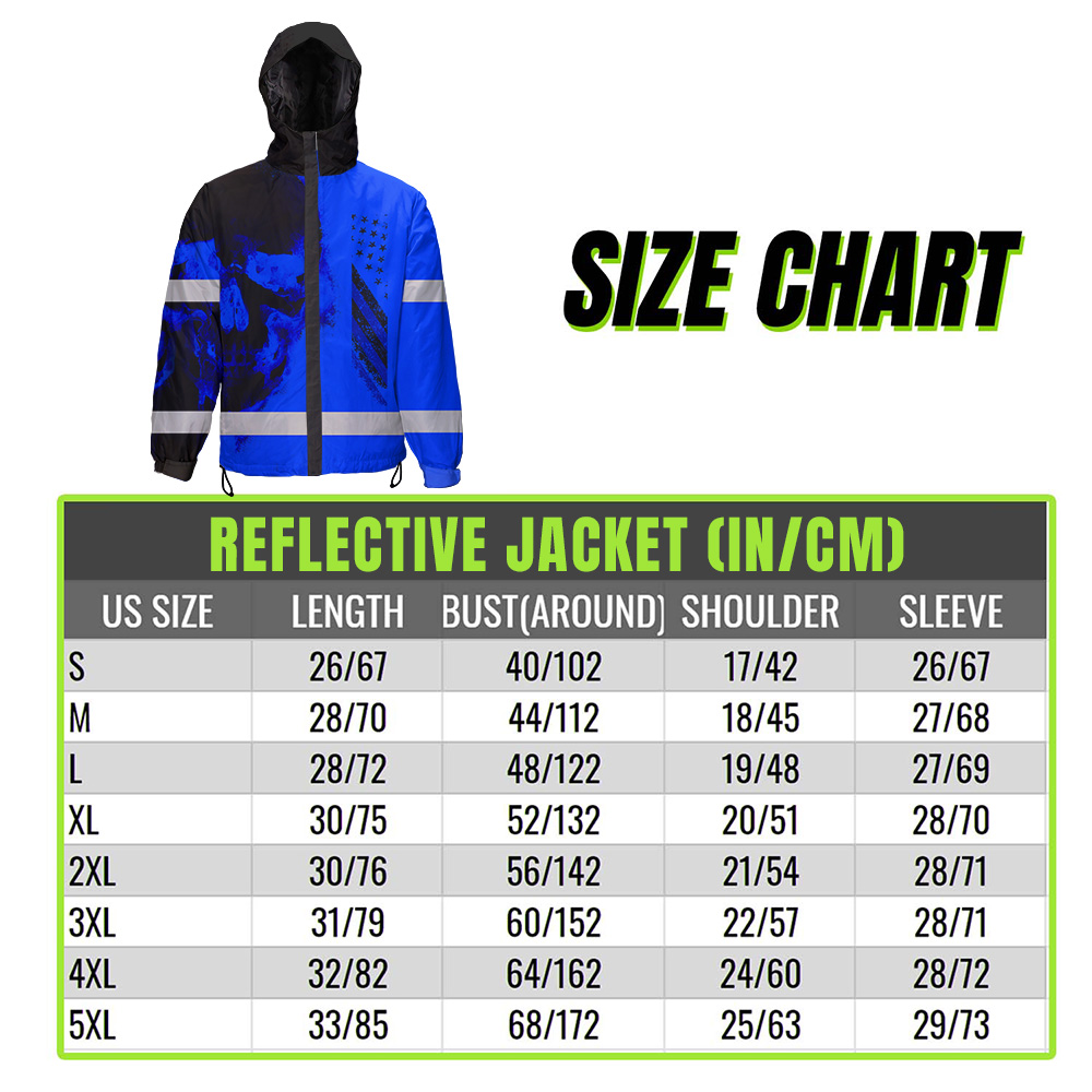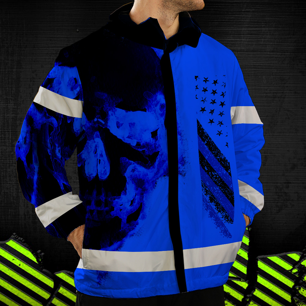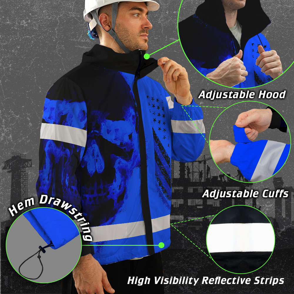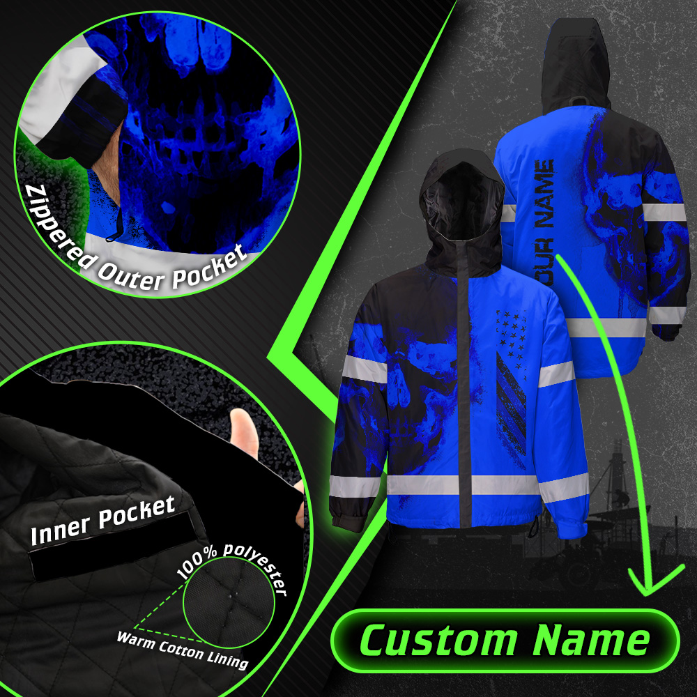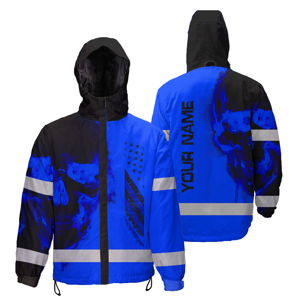 Hi Vis Jacket Waterproof And Windproof Reflective Skull US Flag Blue Neon Custom Name Safety Workwear For Truckers, Workers, Runners, Cyclists, Patriotic
