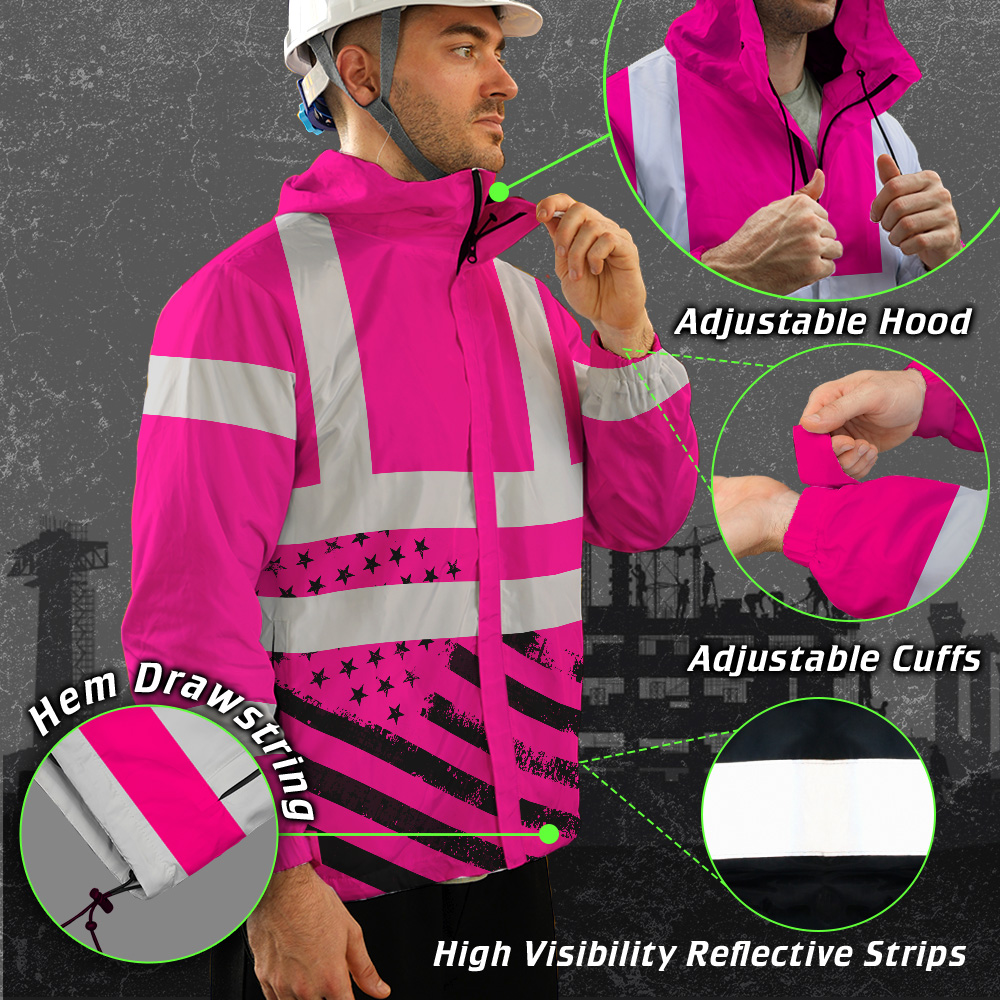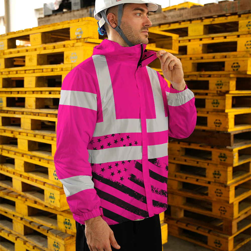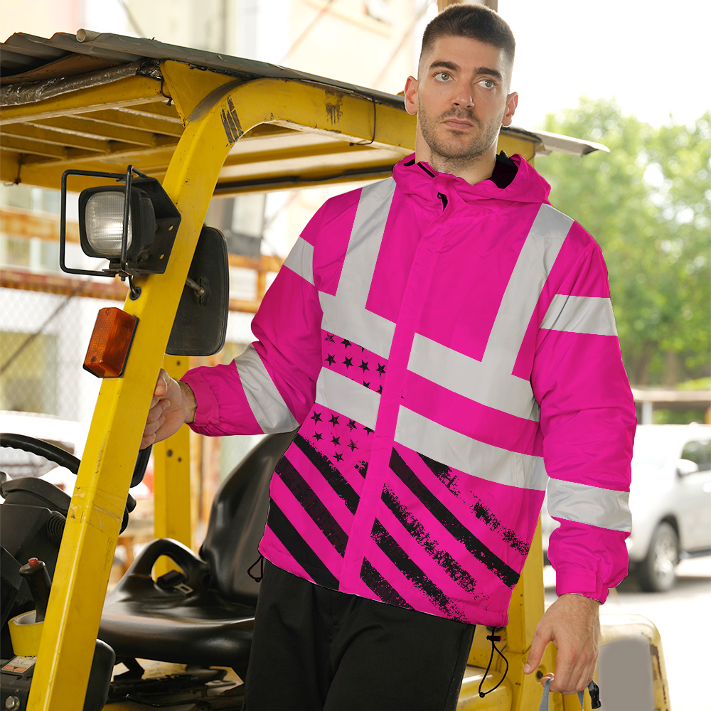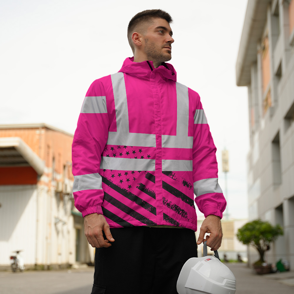 Hi Vis Jacket Waterproof And Windproof Reflective Tapes Pink USA Flag Safety Workwear For Workers