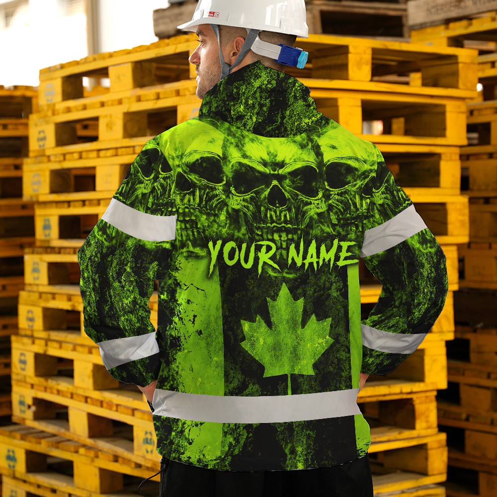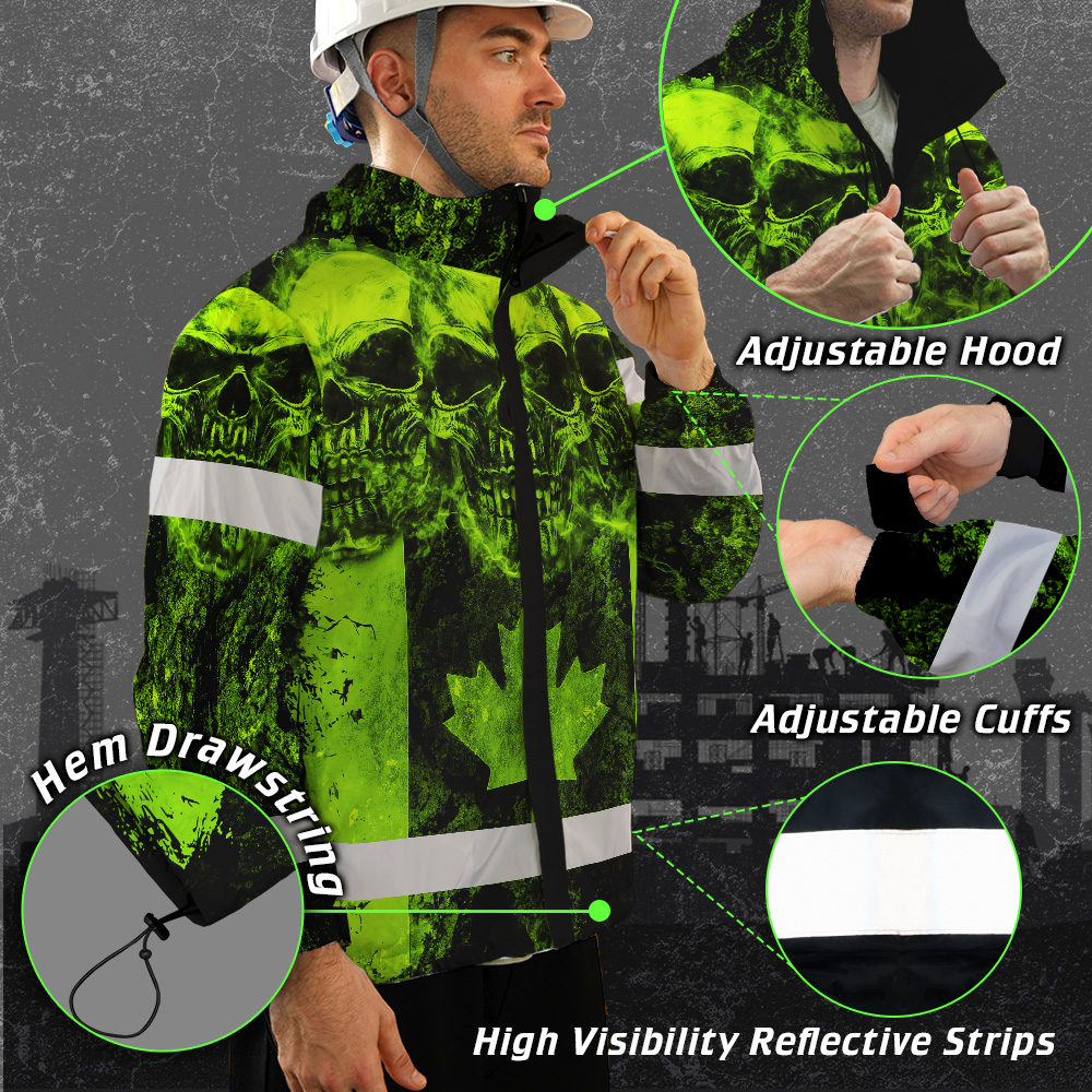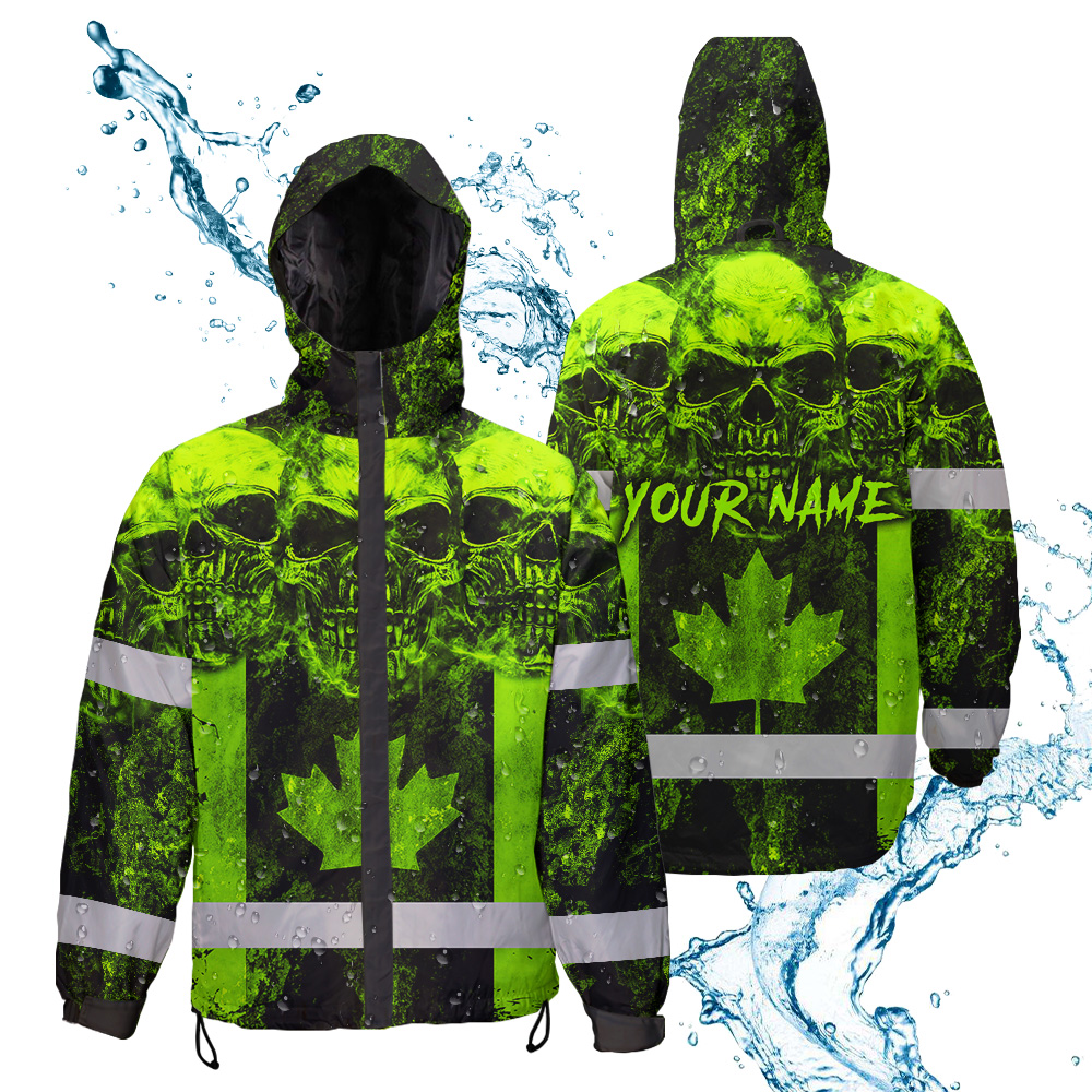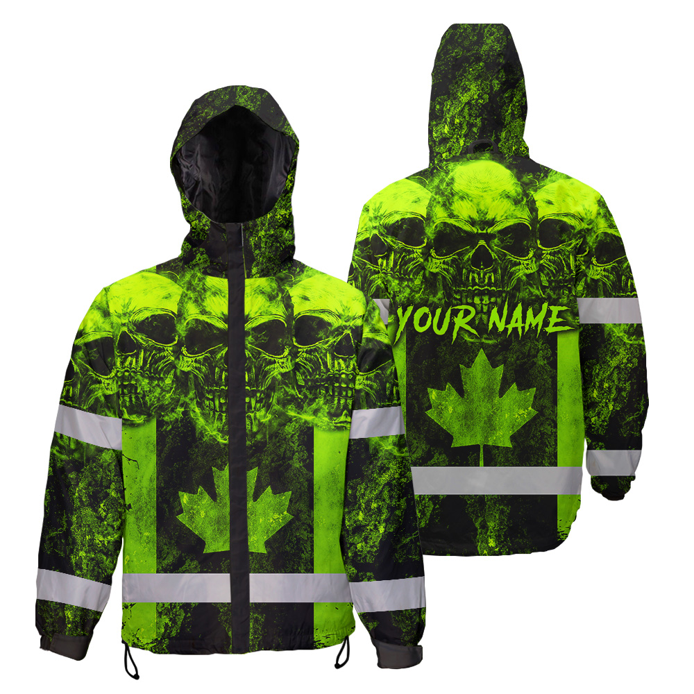 Hi Vis Jacket Waterproof Green Neon Skull Canada Flag 2 Custom Name
