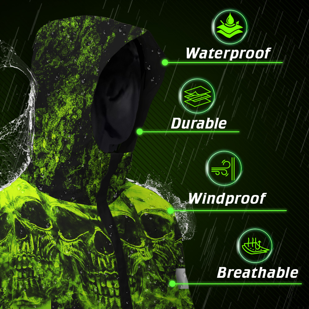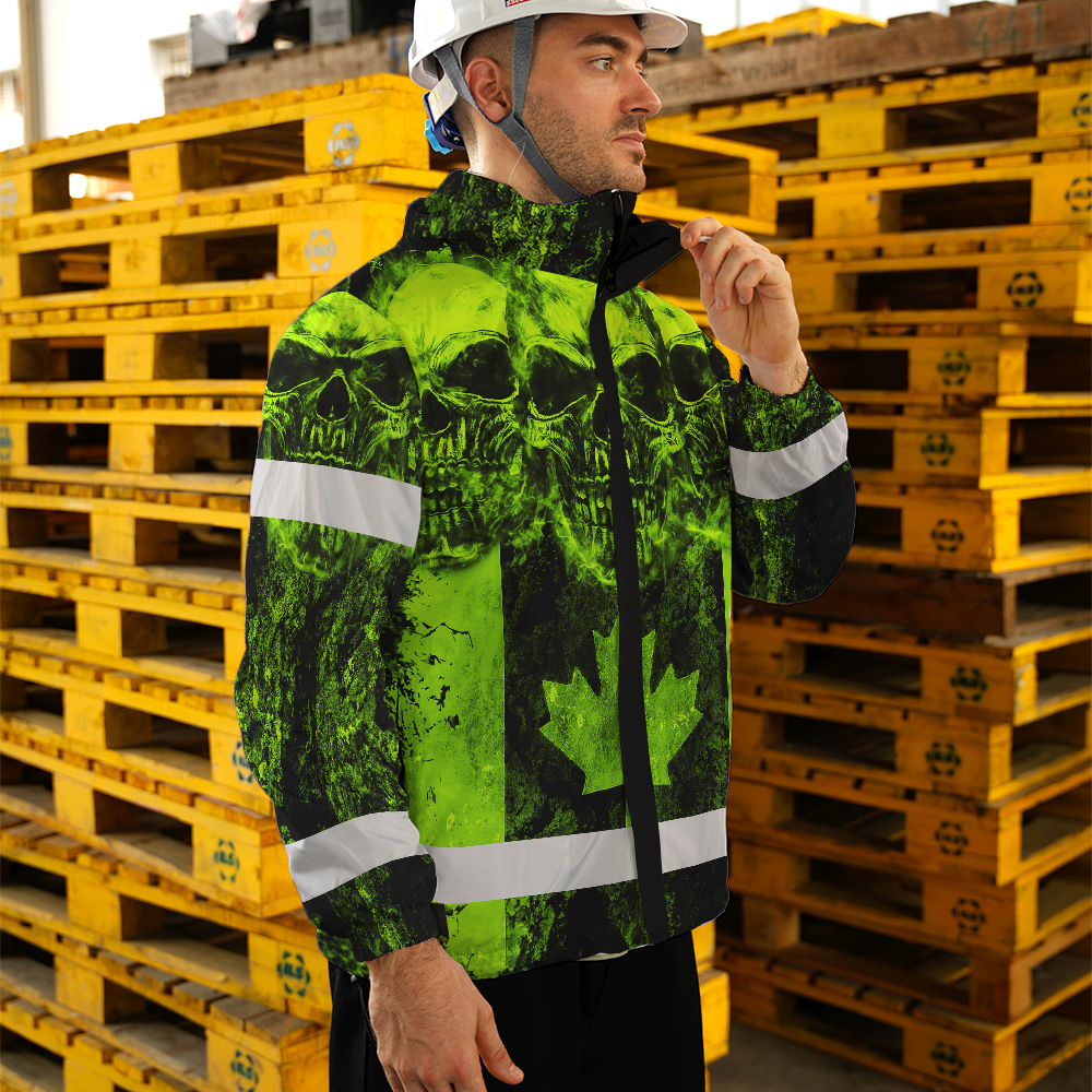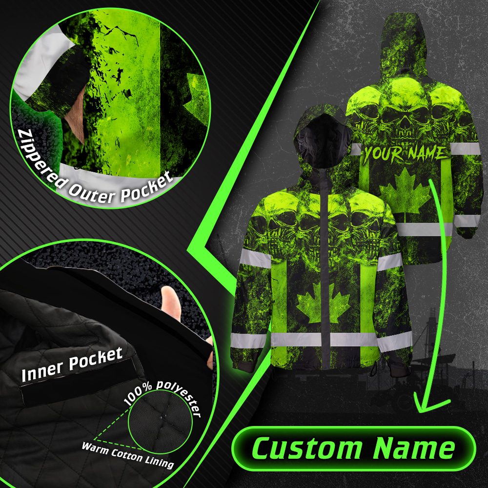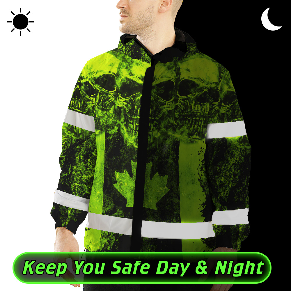 Hi Vis Jacket Waterproof Green Neon Skull Canada Flag 2 Custom Name