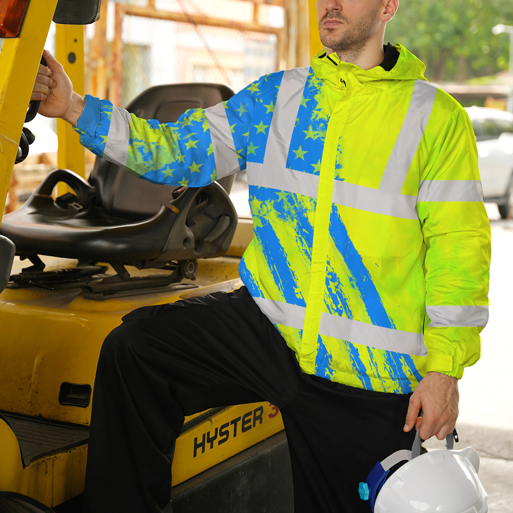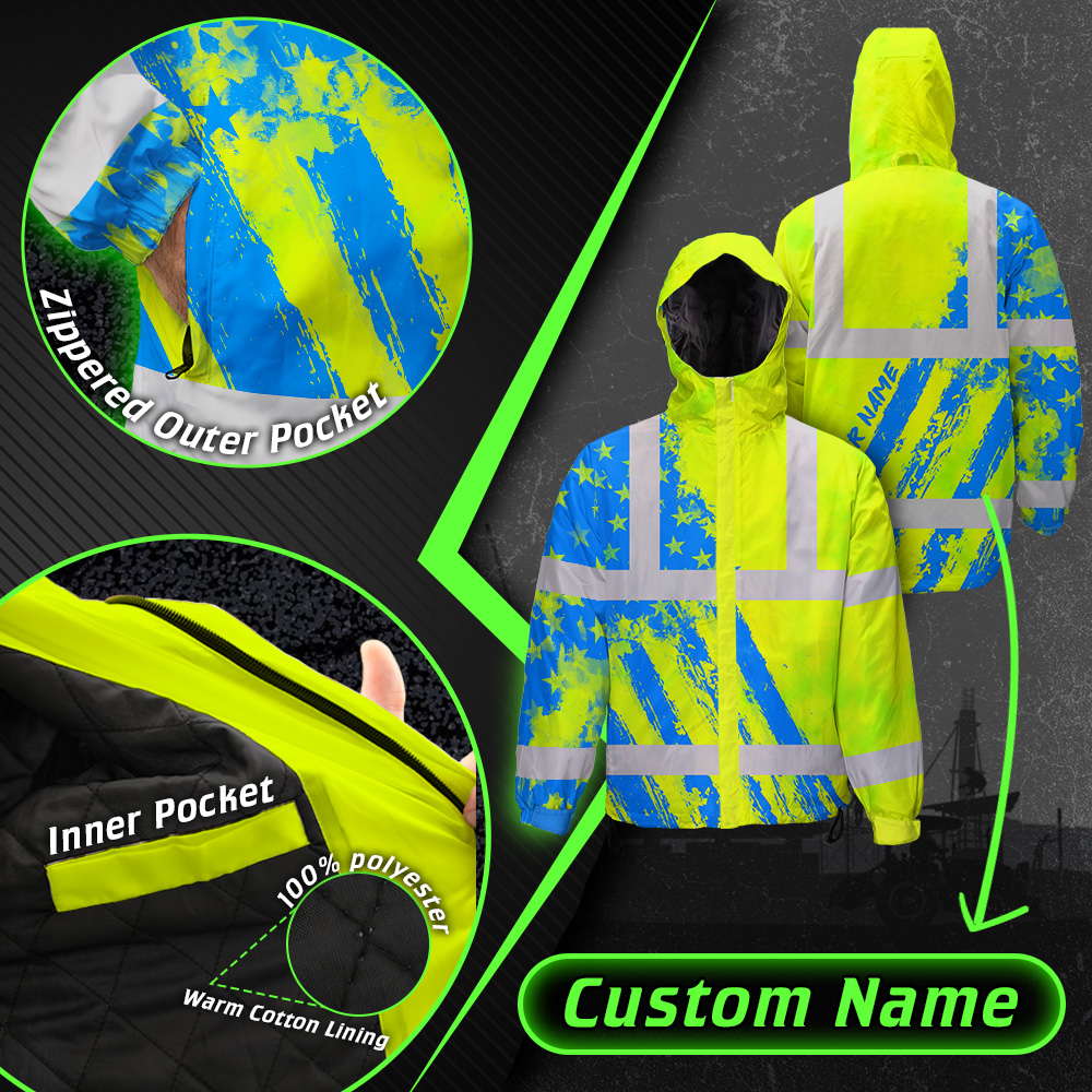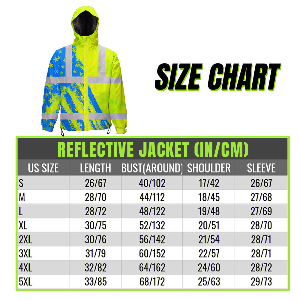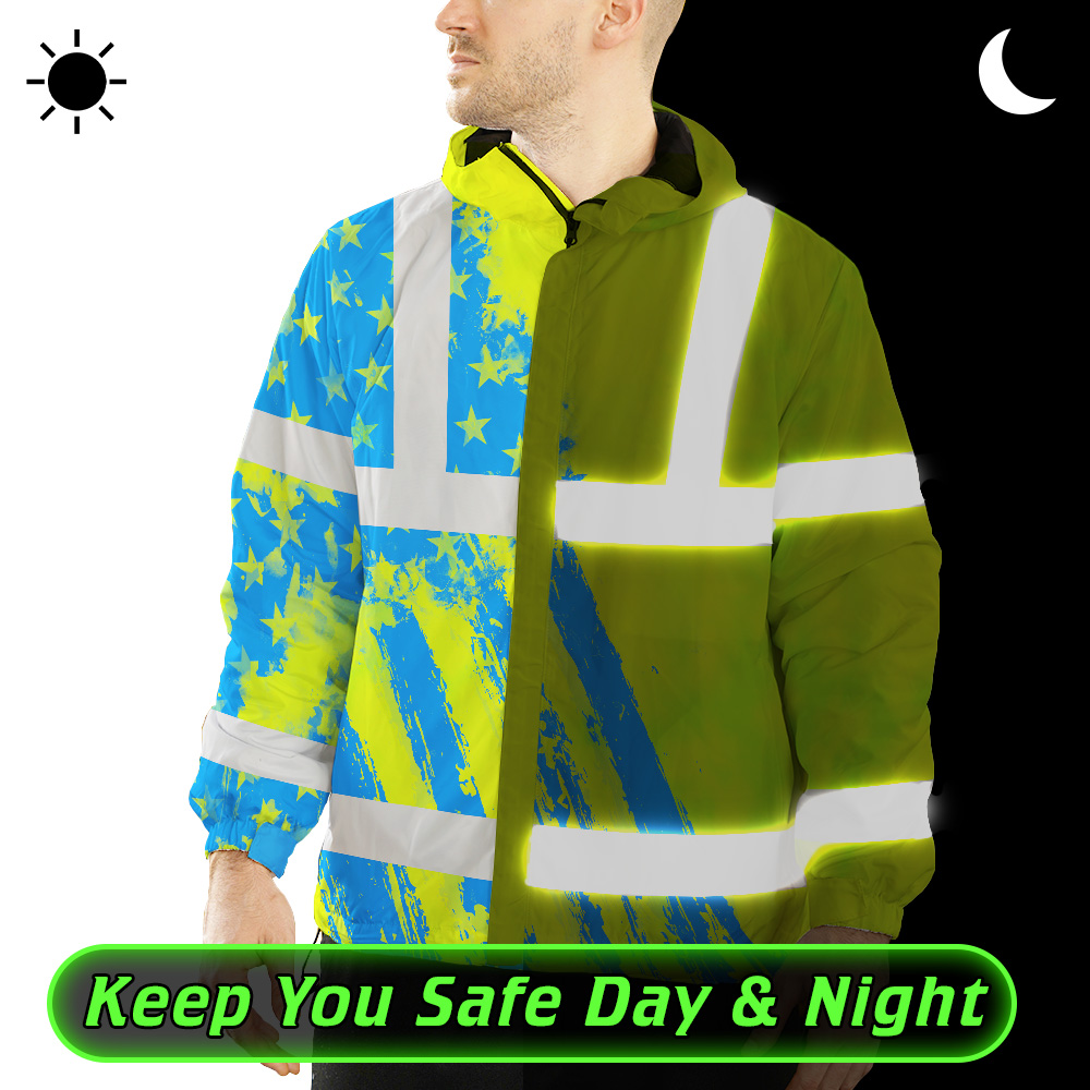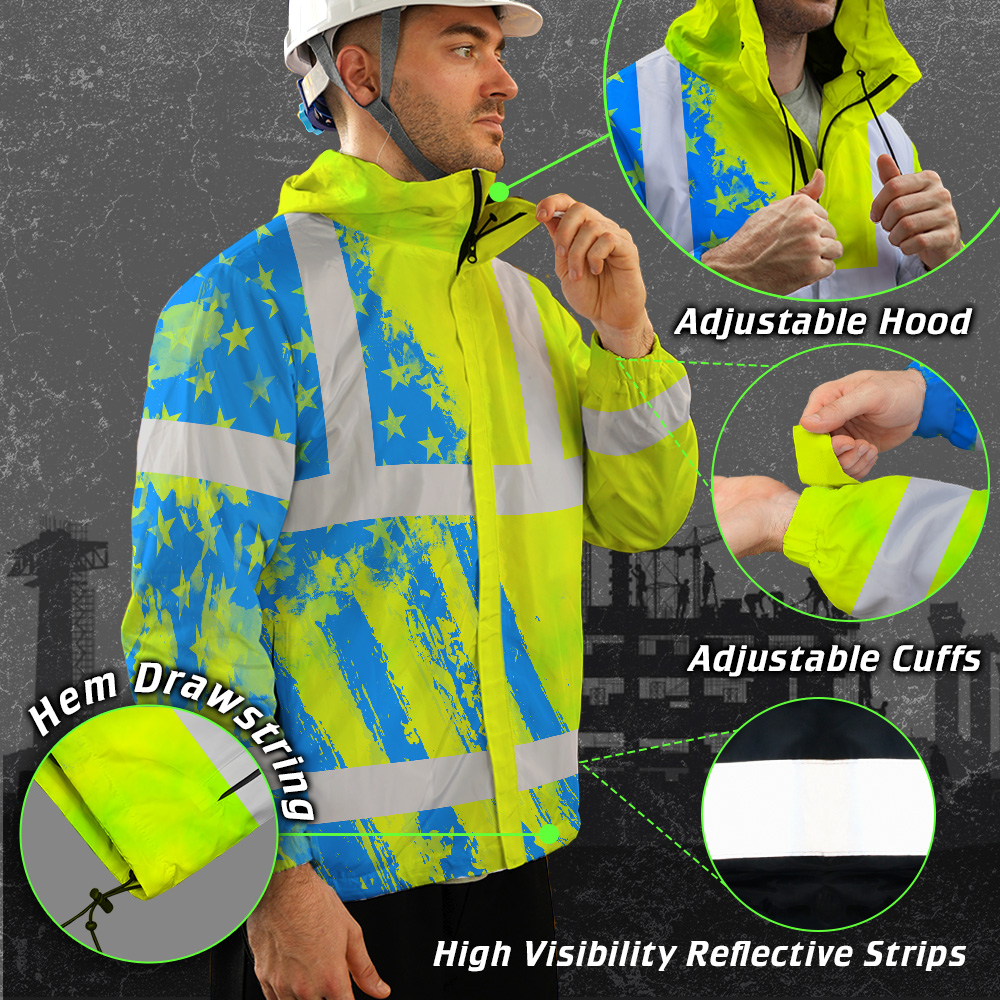 Hi Vis Jacket Waterproof Reflective Green Neon And Blue US Flag Custom Name Safety Workwear For Worker, Motorcycle Bicycle, Runner