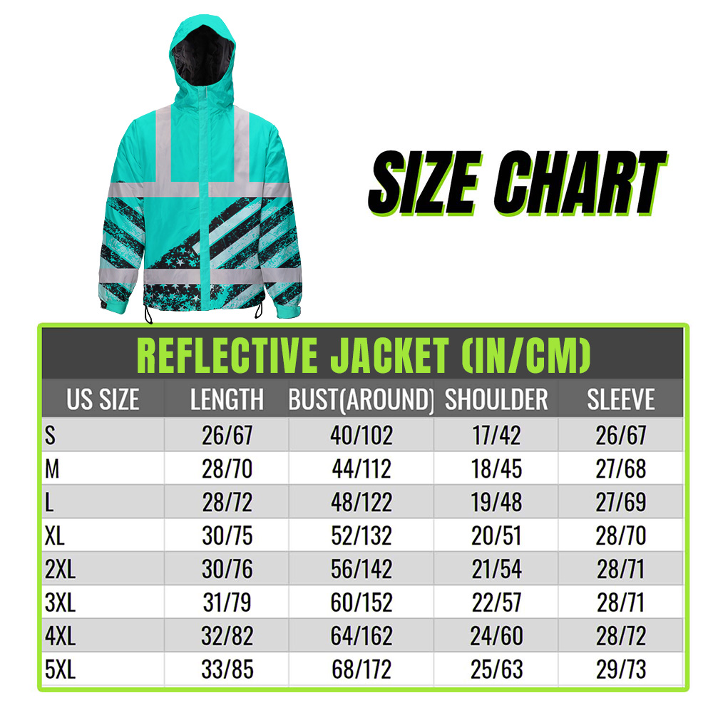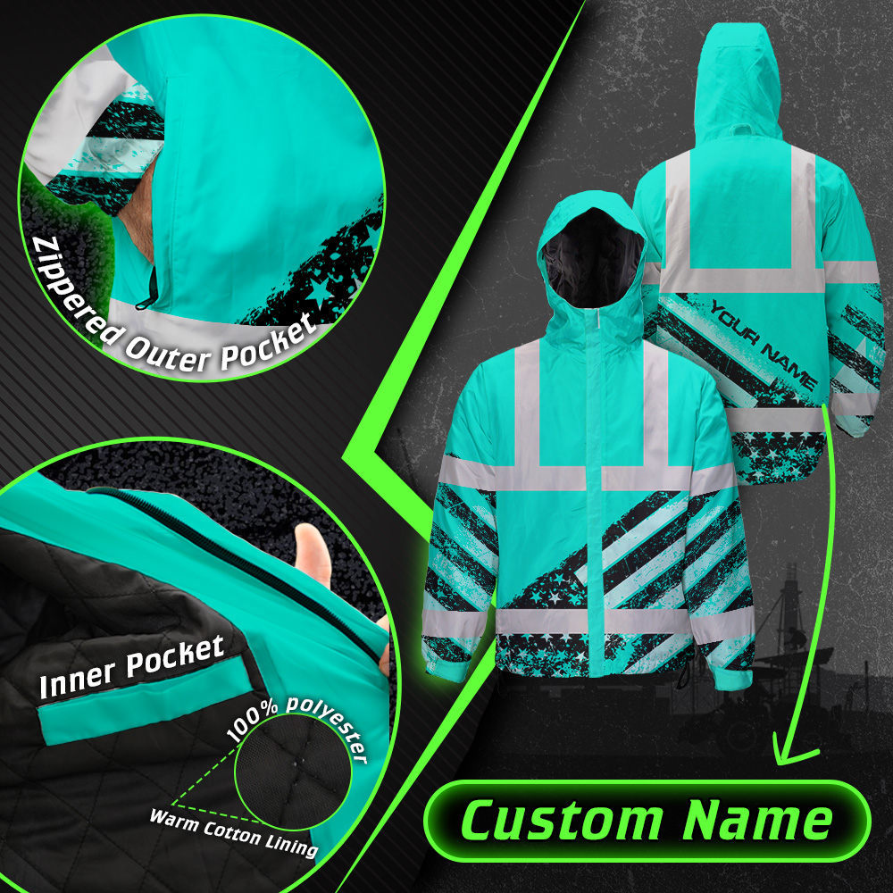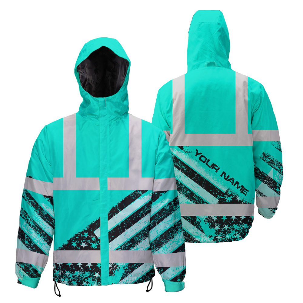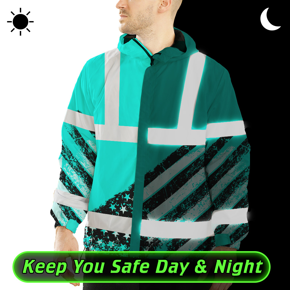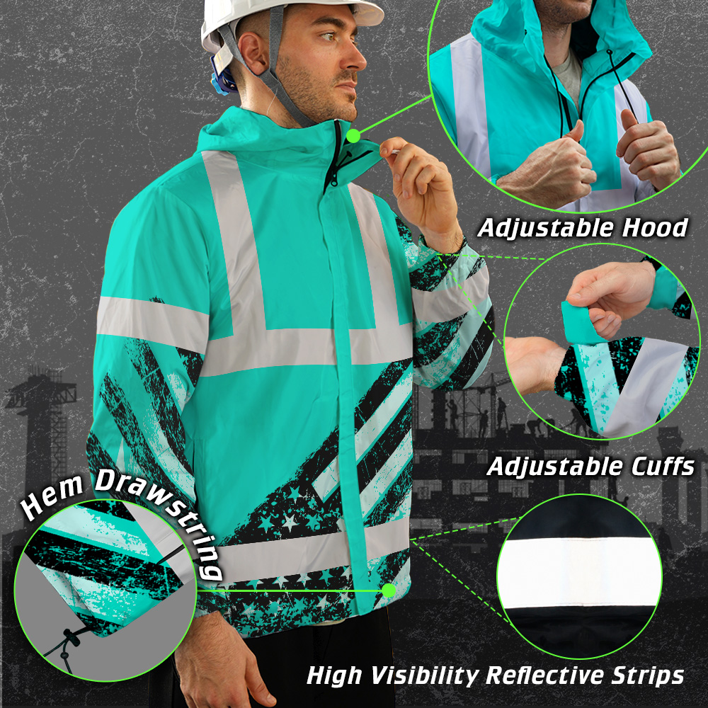 Hi Vis Jacket Waterproof Reflective Mint US Flag Paint Custom Name Safety Workwear For Worker, Motorcycle Bicycle, Runner