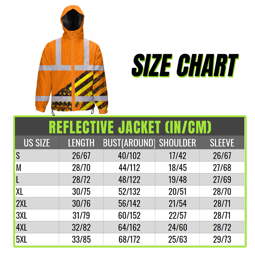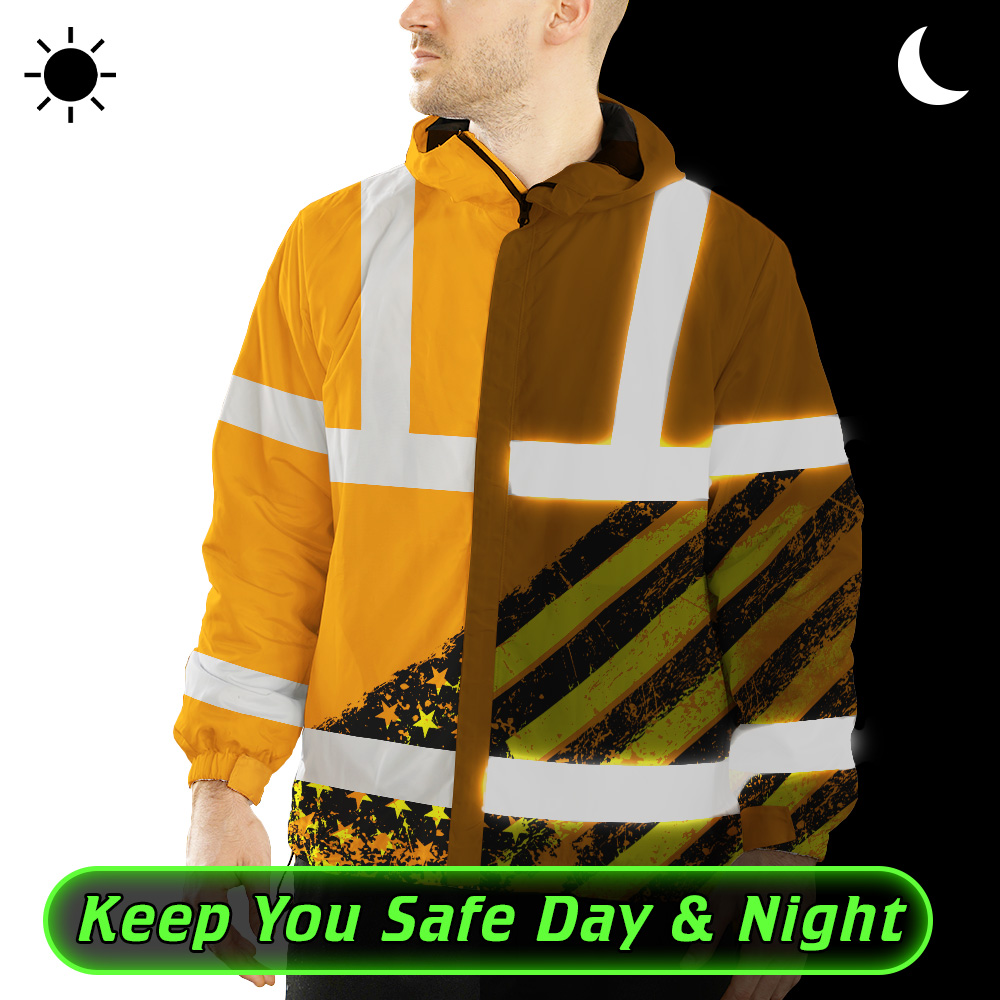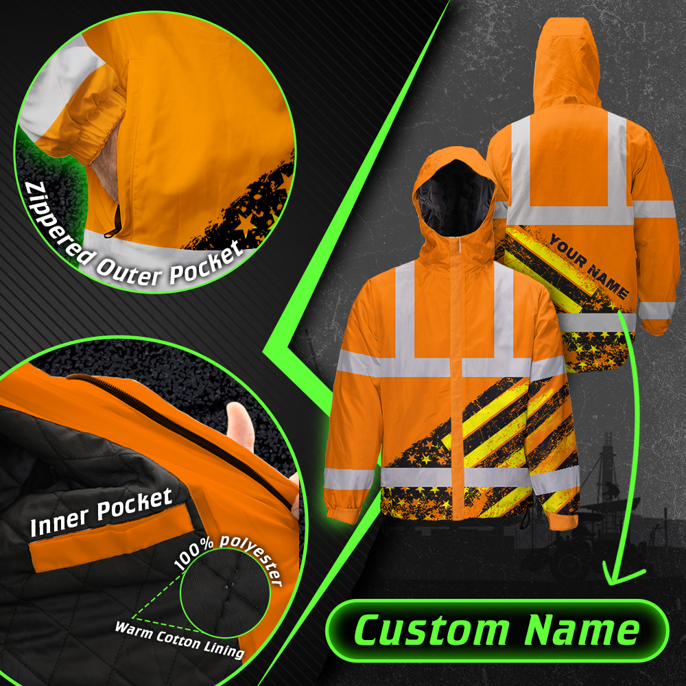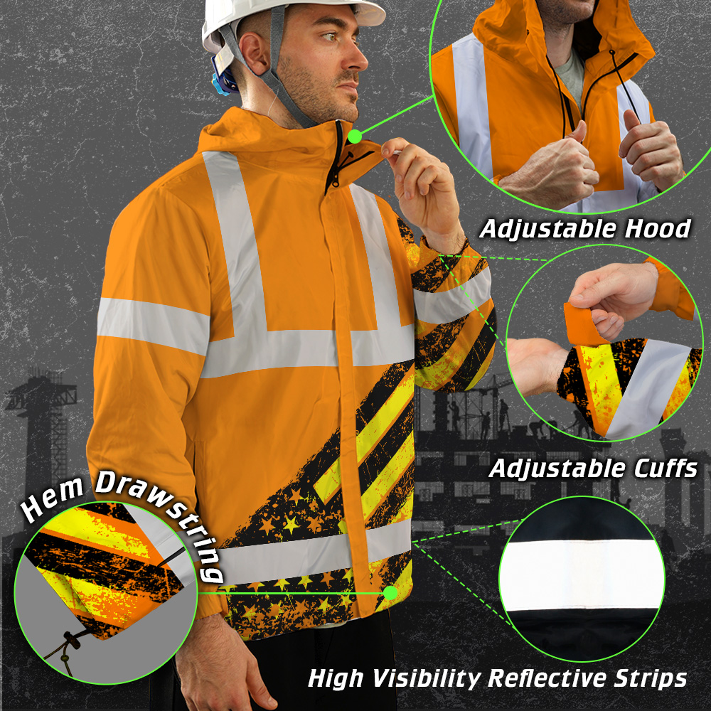 Hi Vis Jacket Waterproof Reflective Orange USA Flag Custom Name Safety Workwear For Worker, Motorcycle Bicycle, Runner