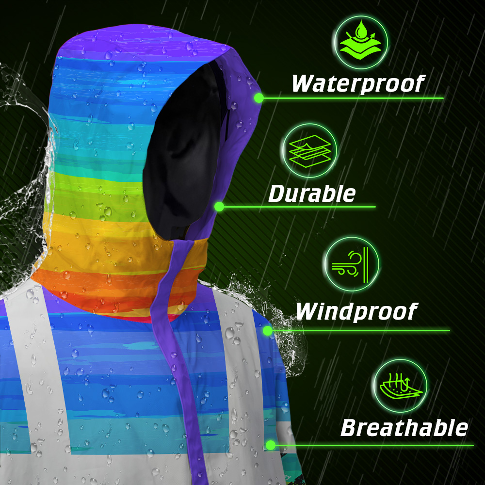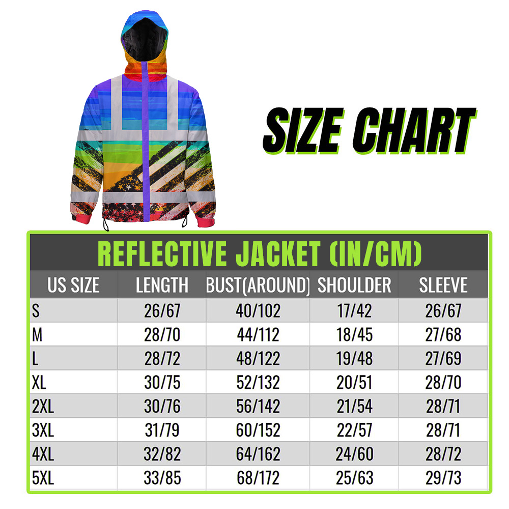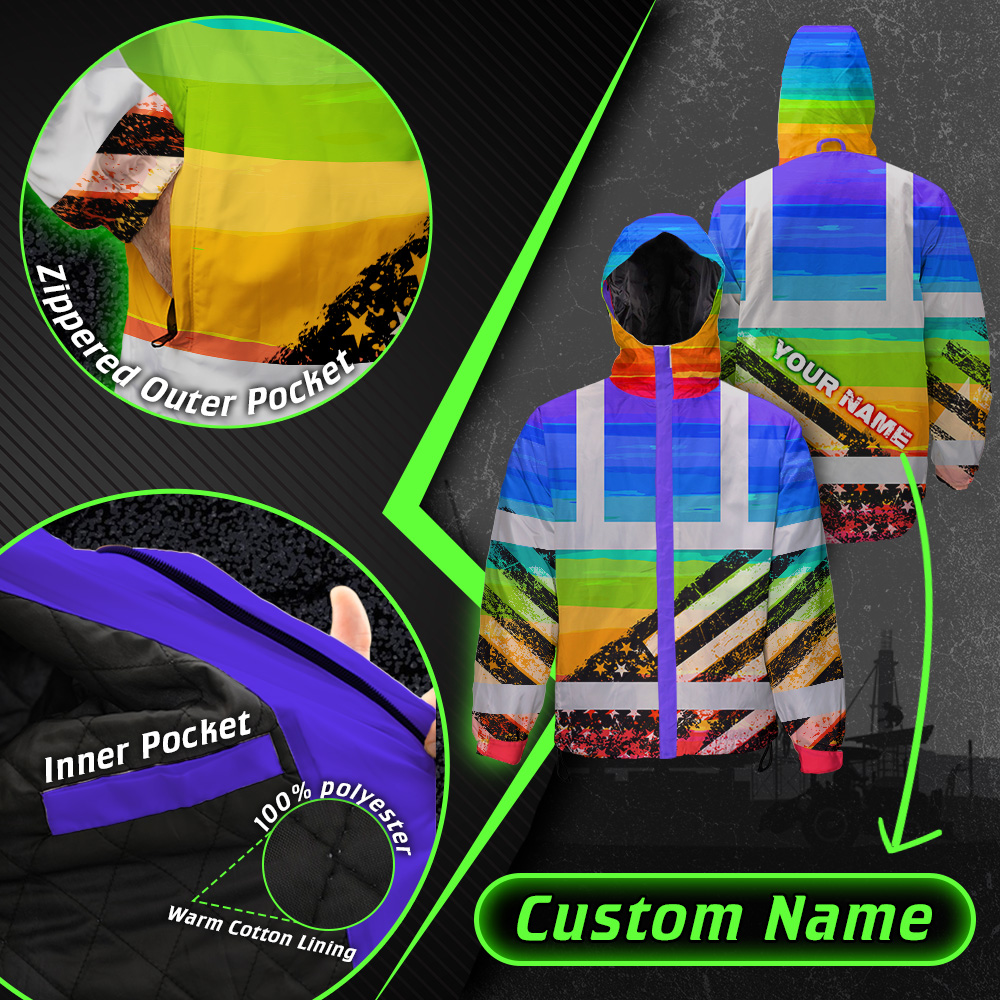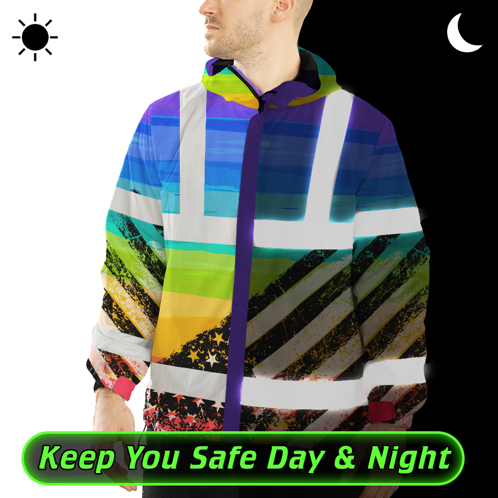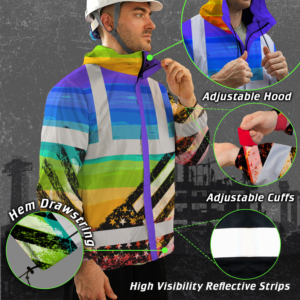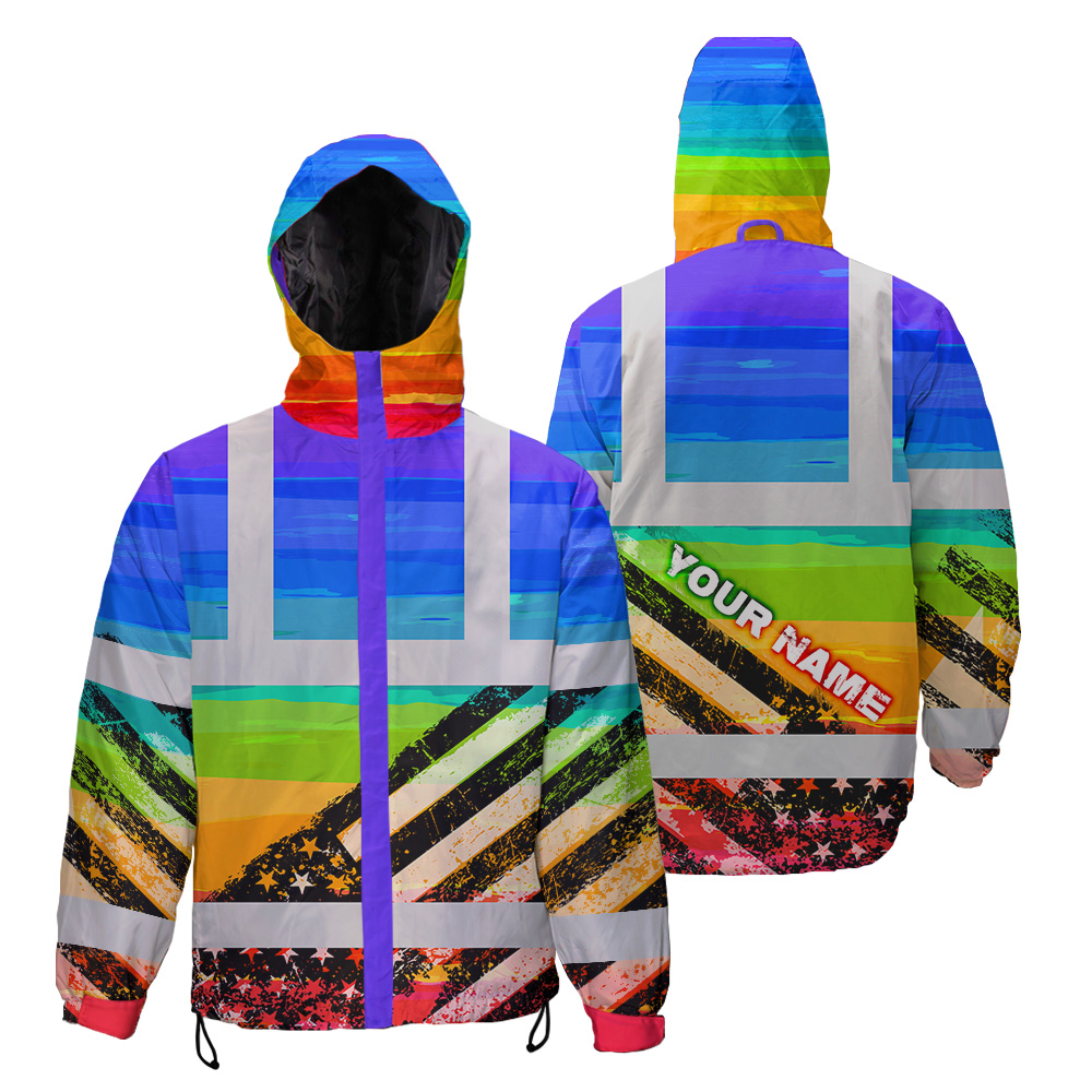 Hi Vis Jacket Waterproof Reflective Rainbow US Flag Paint Custom Name Safety Workwear For Worker, Motorcycle Bicycle, Runner