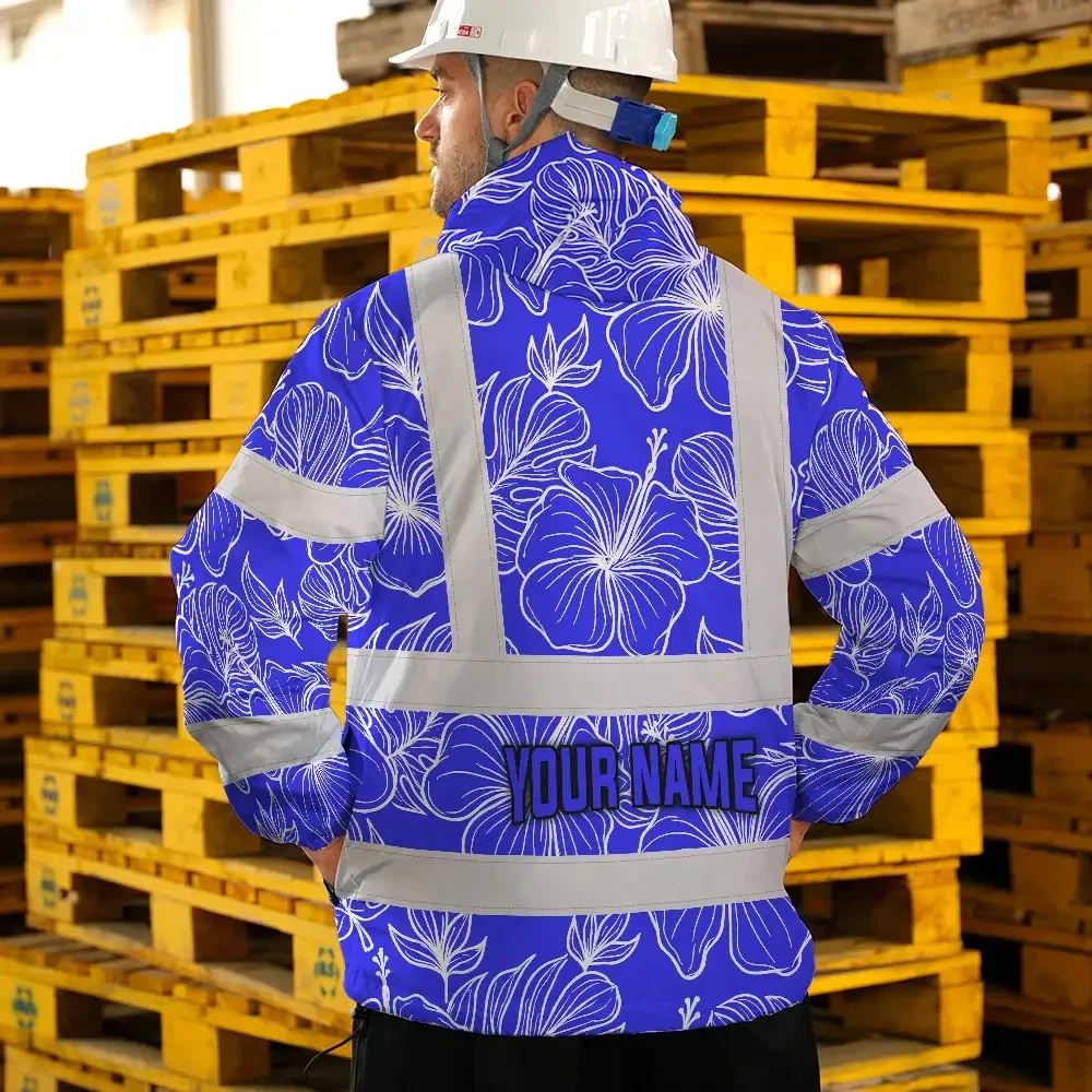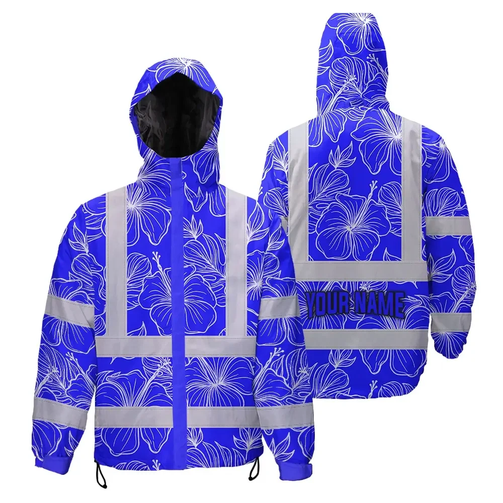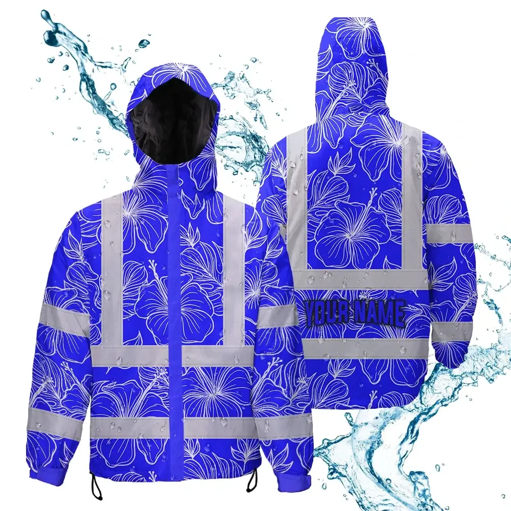 Hi Vis Jacket Waterproof Reflective Tapes Blue Neon Flowers Custom Name Safety Workwear For Workers, Truckers, Operators