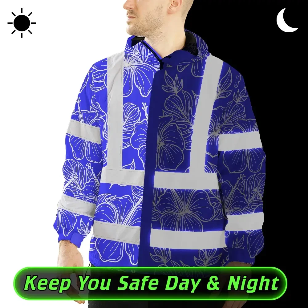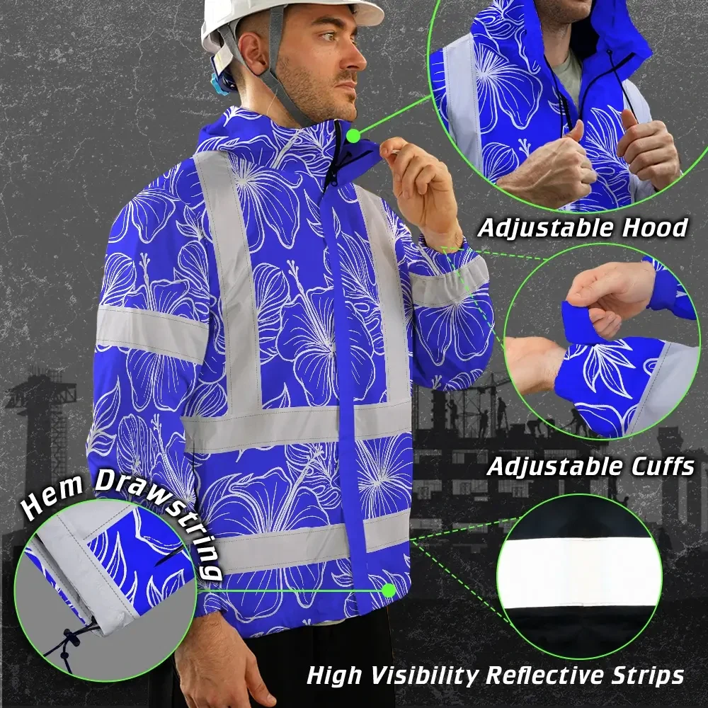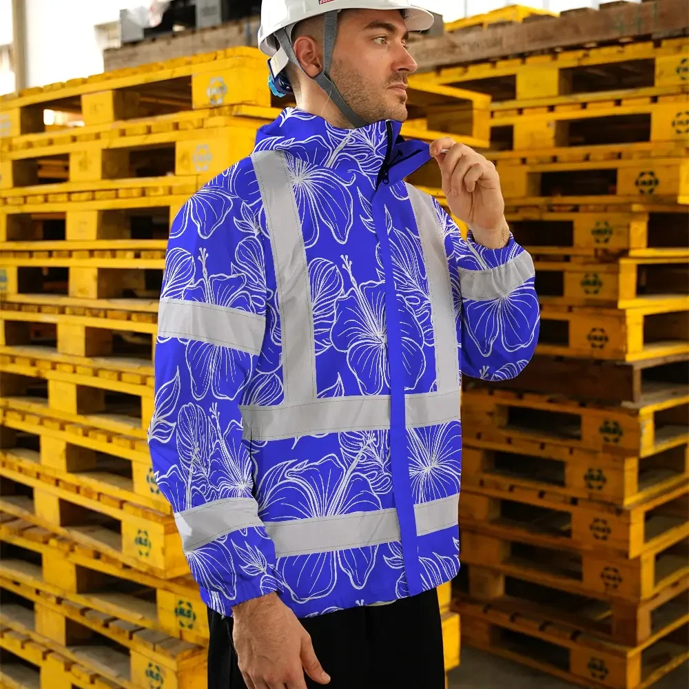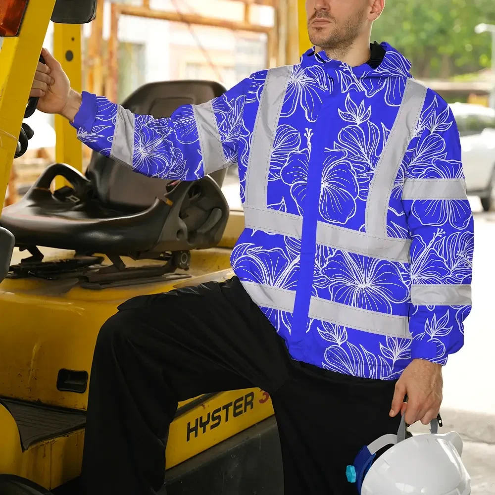 Hi Vis Jacket Waterproof Reflective Tapes Blue Neon Flowers Custom Name Safety Workwear For Workers, Truckers, Operators