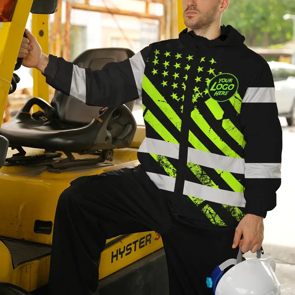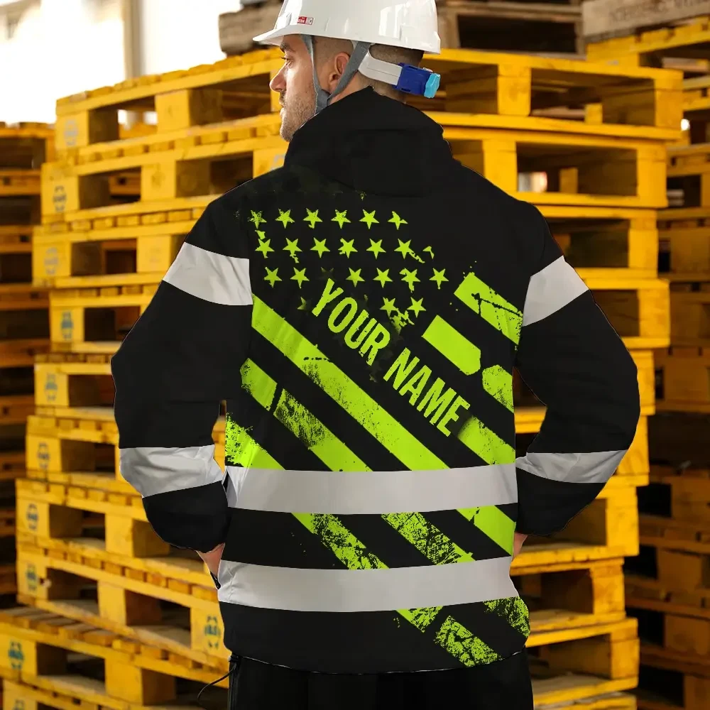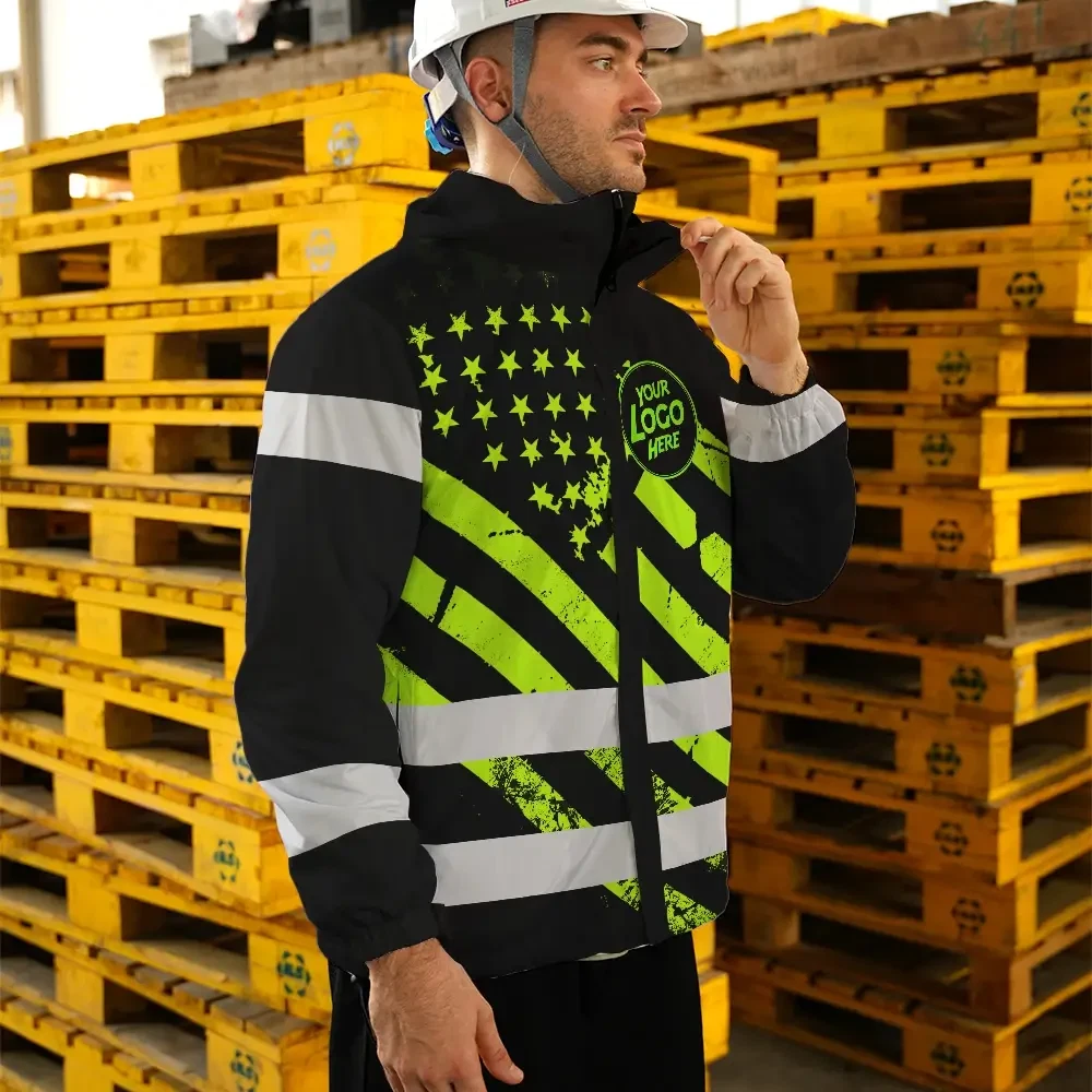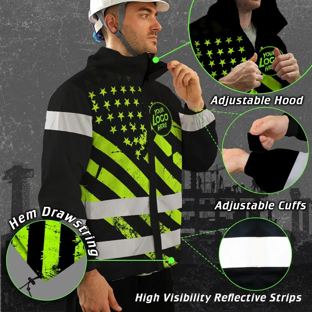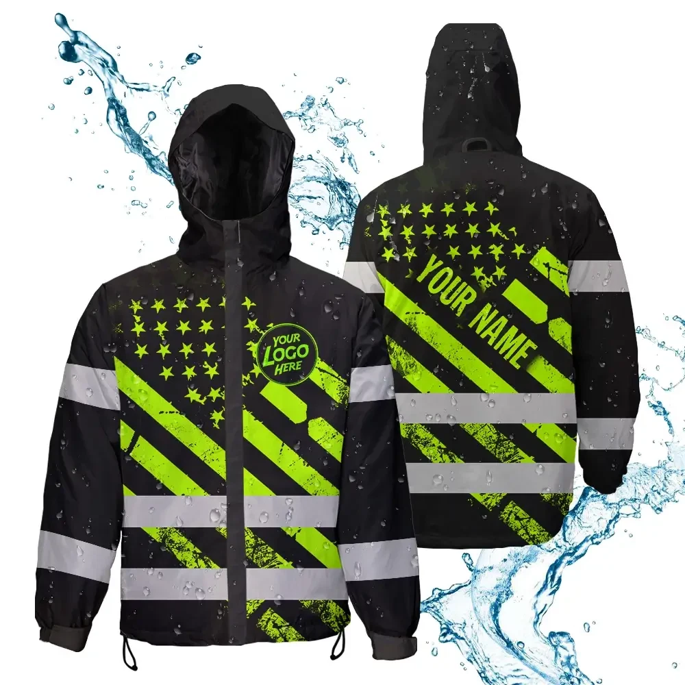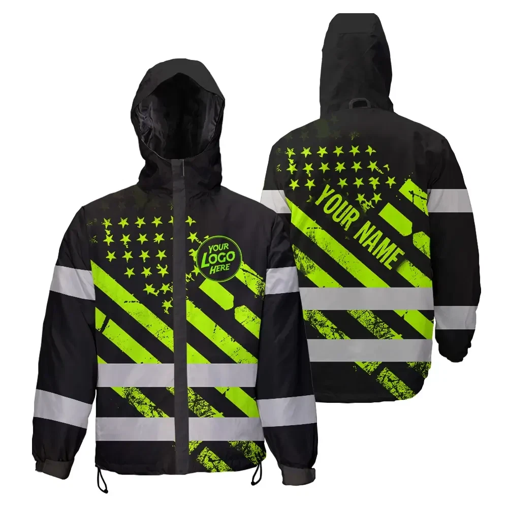 Hi Vis Jacket Waterproof Reflective Tapes Green Black USA Flag Custom Name And Logo Safety Workwear