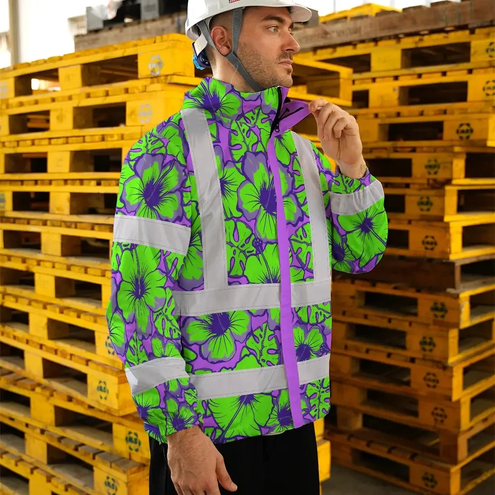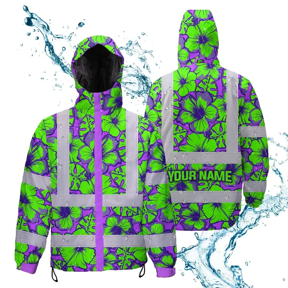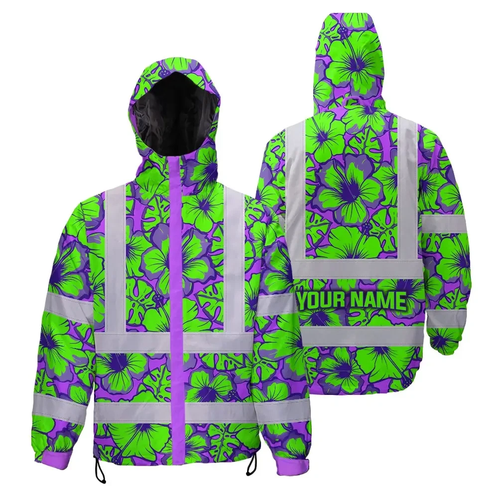 Hi Vis Jacket Waterproof Reflective Tapes Green Neon And Violet Flowers Custom Name Safety Workwear For Workers, Truckers, Operators