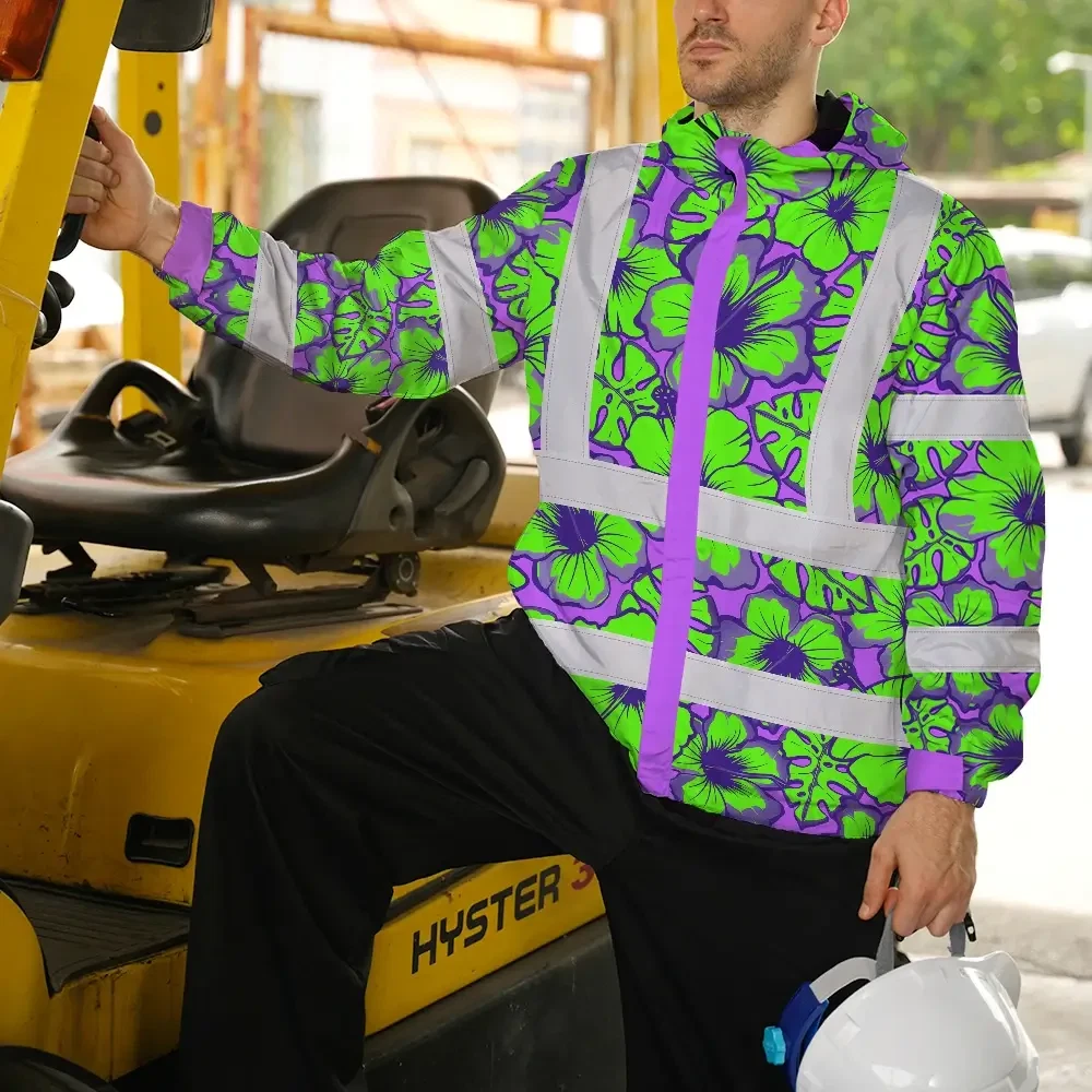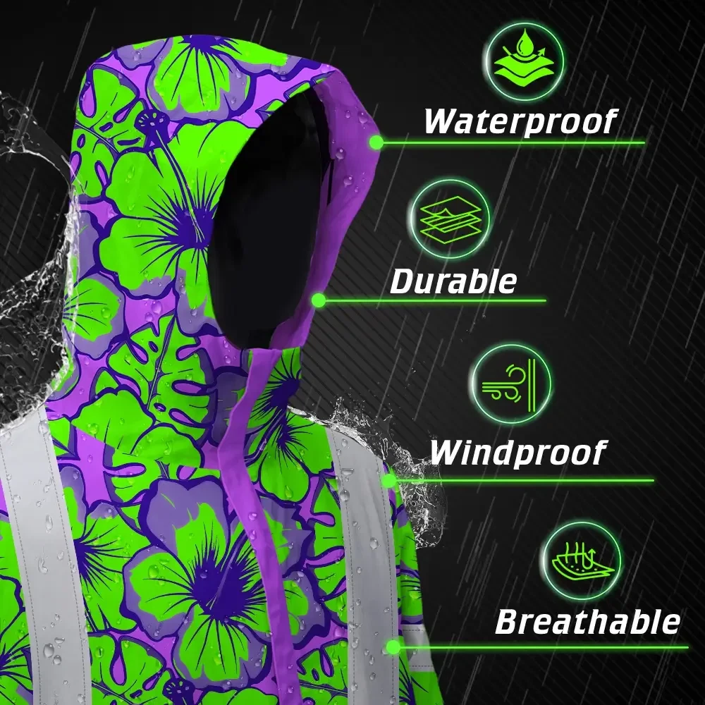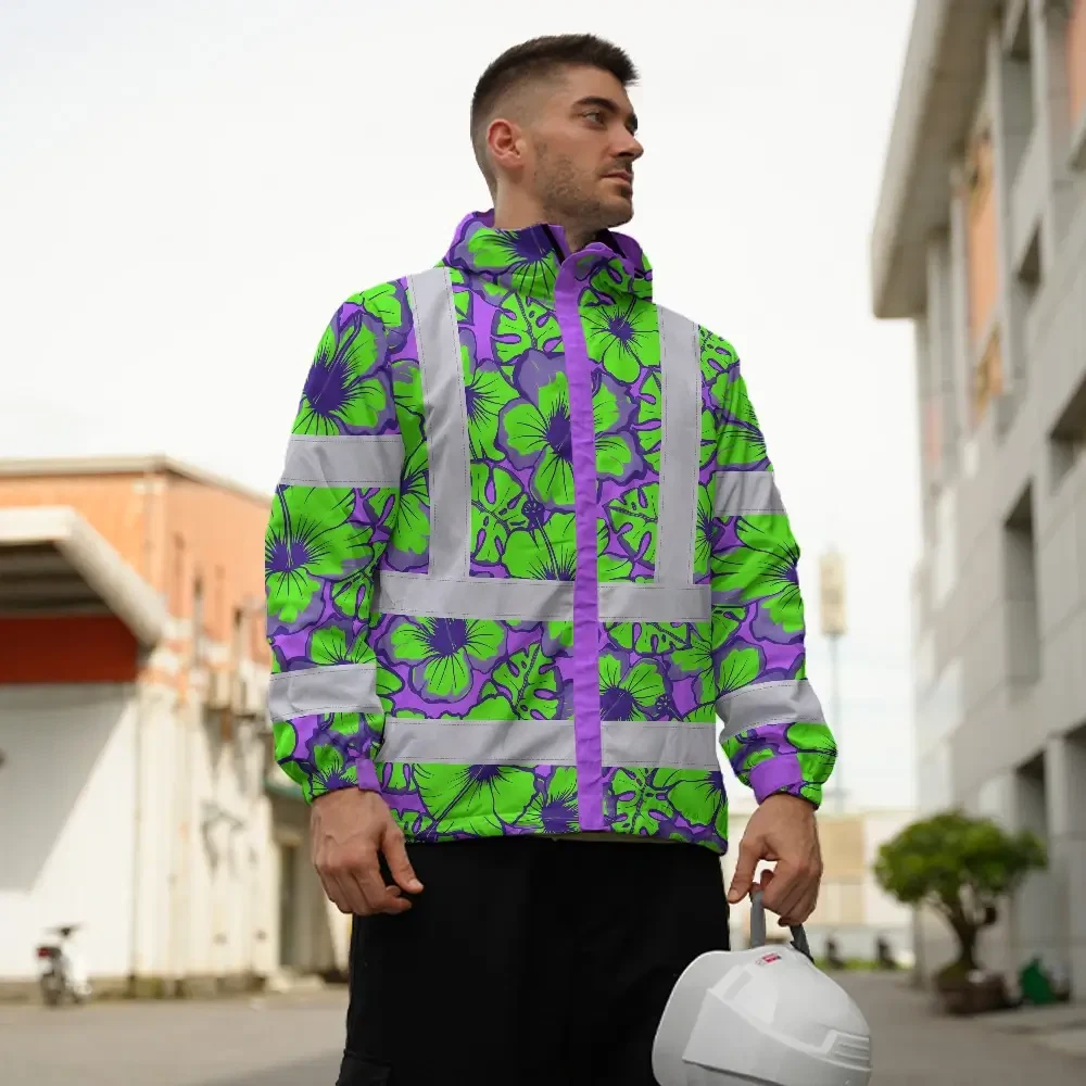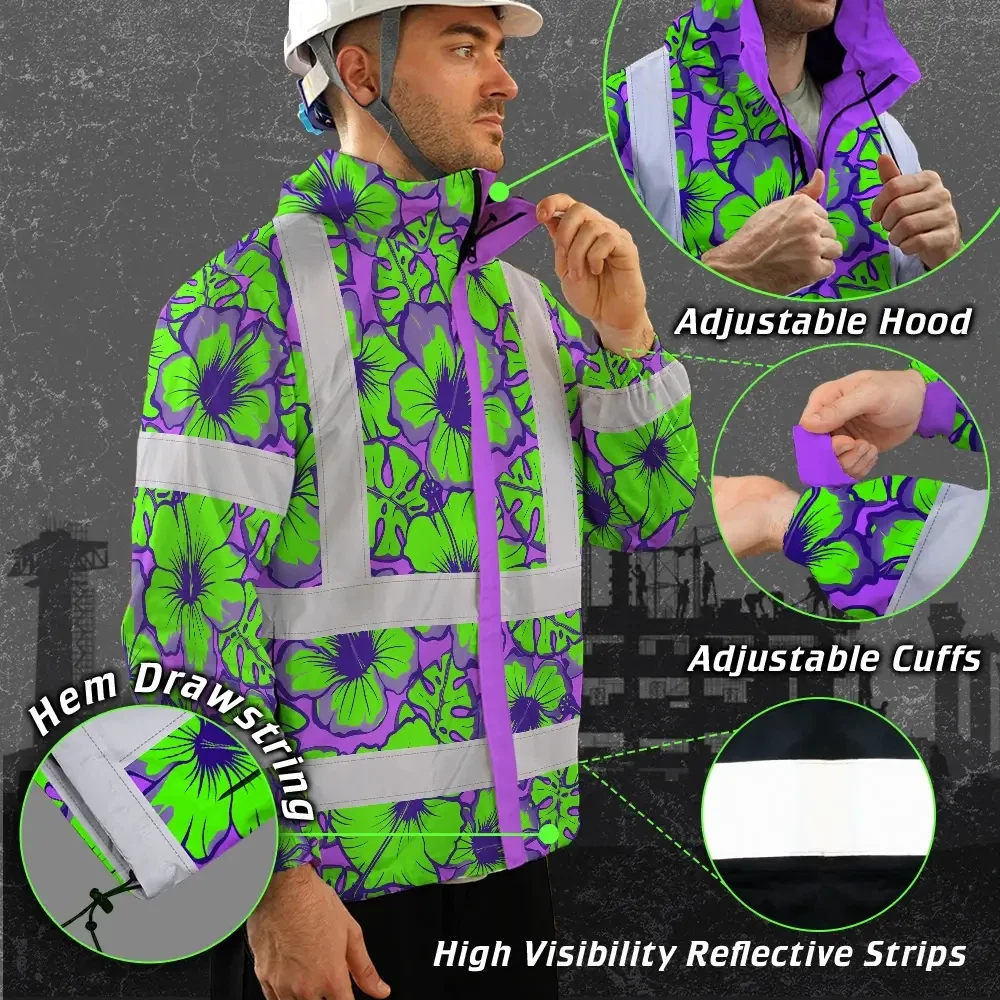 Hi Vis Jacket Waterproof Reflective Tapes Green Neon And Violet Flowers Custom Name Safety Workwear For Workers, Truckers, Operators