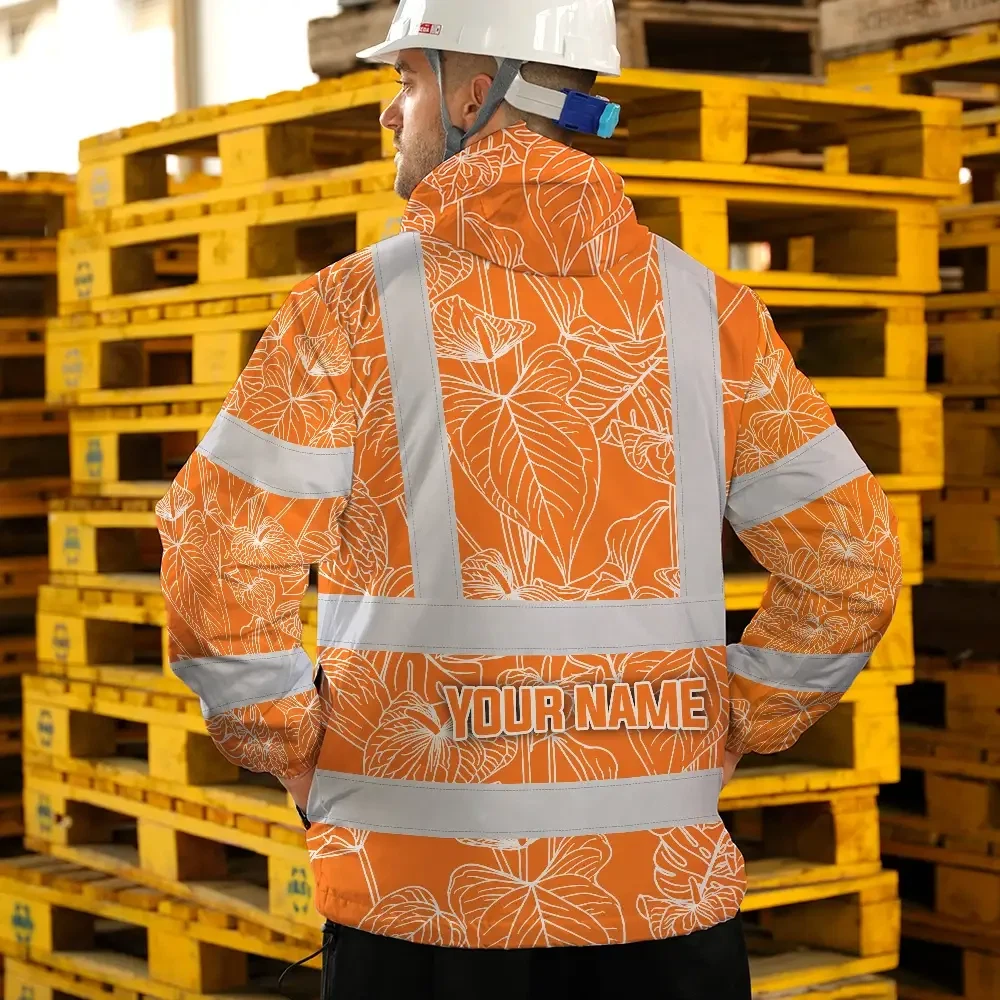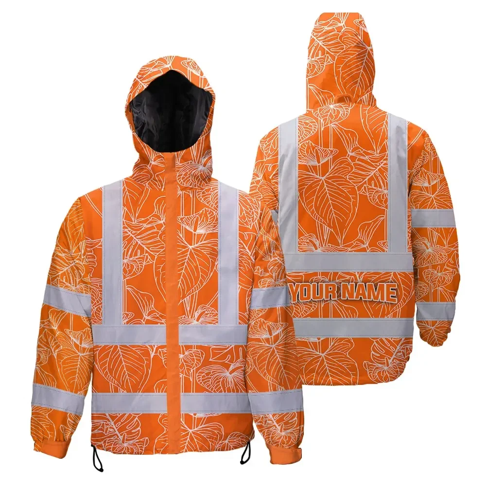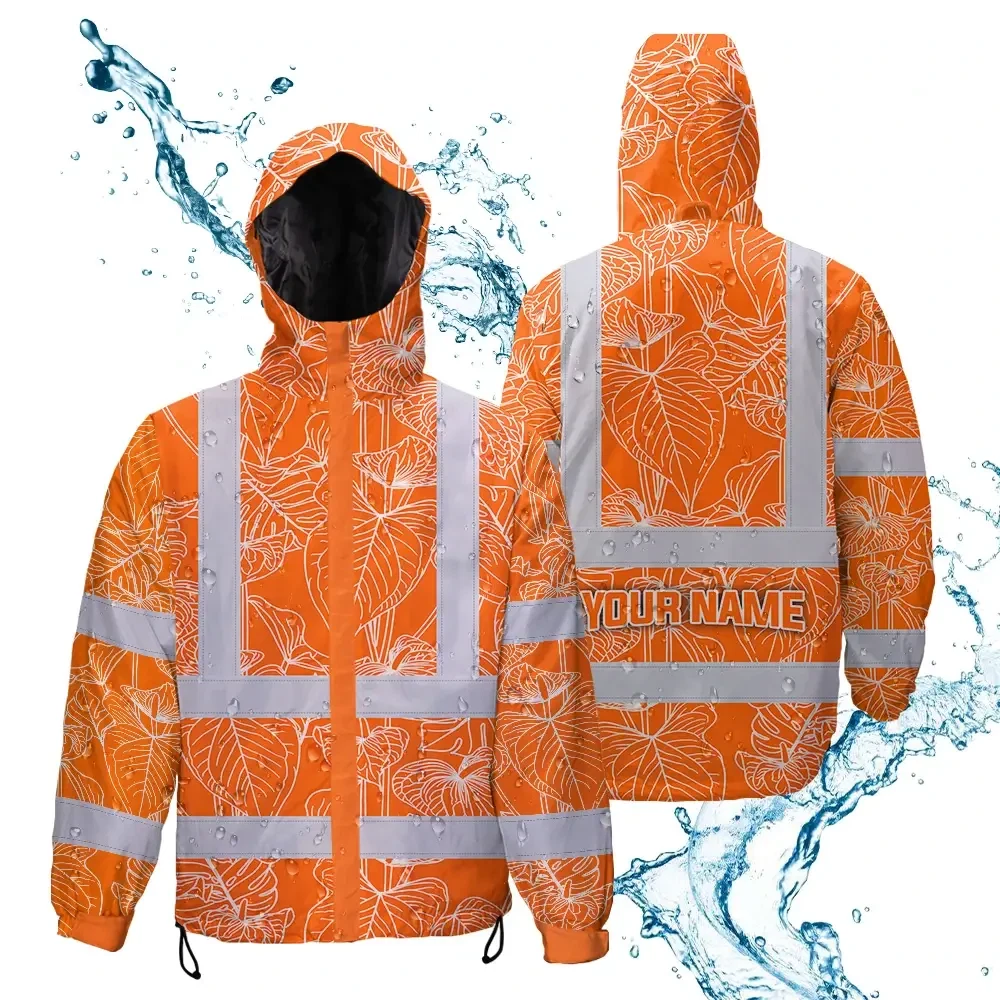 Hi Vis Jacket Waterproof Reflective Tapes Orange Neon Flowers Custom Name Safety Workwear For Workers, Truckers, Operators
