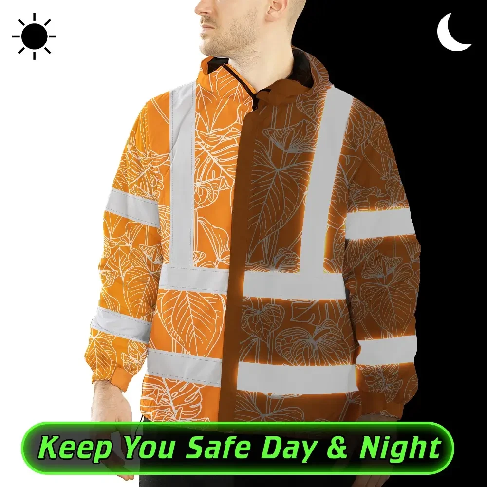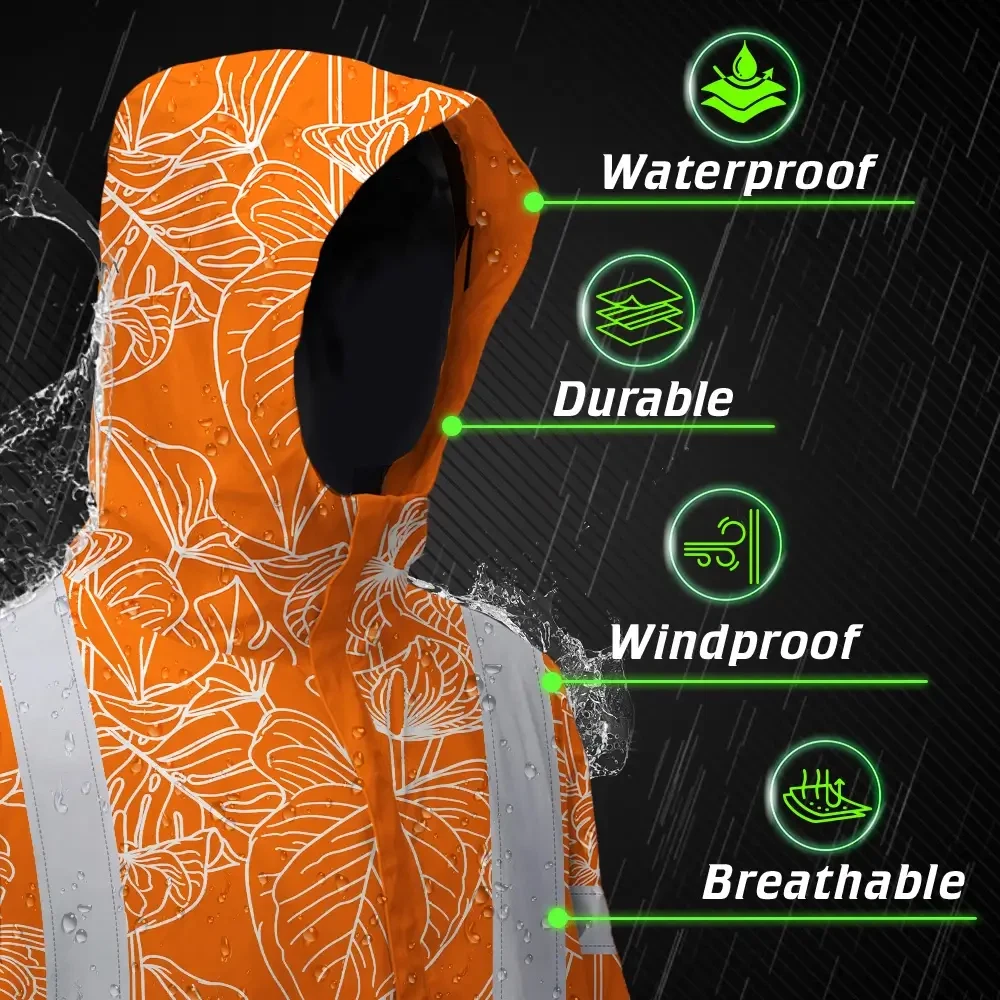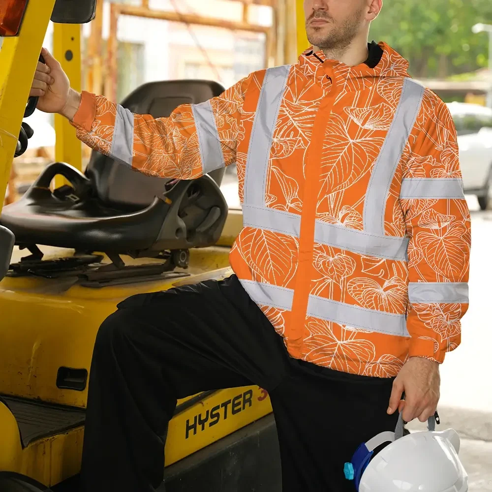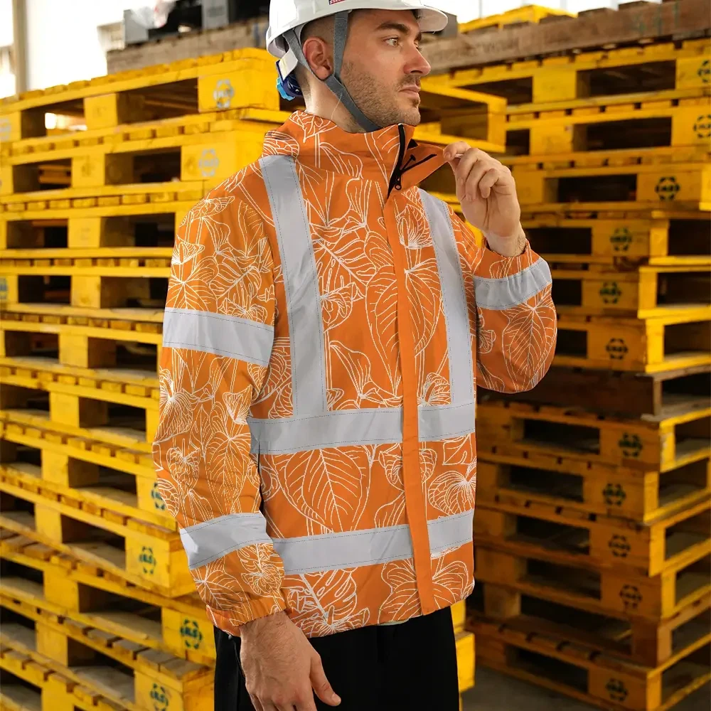 Hi Vis Jacket Waterproof Reflective Tapes Orange Neon Flowers Custom Name Safety Workwear For Workers, Truckers, Operators
