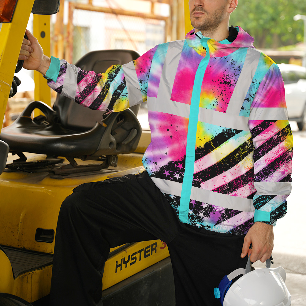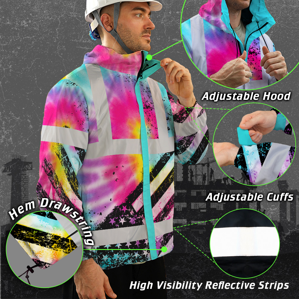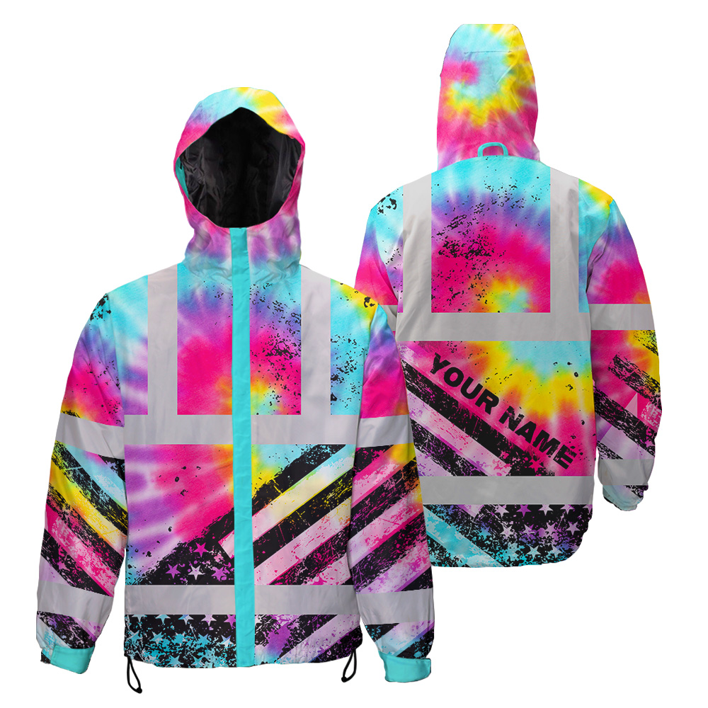 Hi Vis Jacket Waterproof Reflective Tie Dye US Flag Paint Custom Name Safety Workwear For Worker, Motorcycle Bicycle, Runner