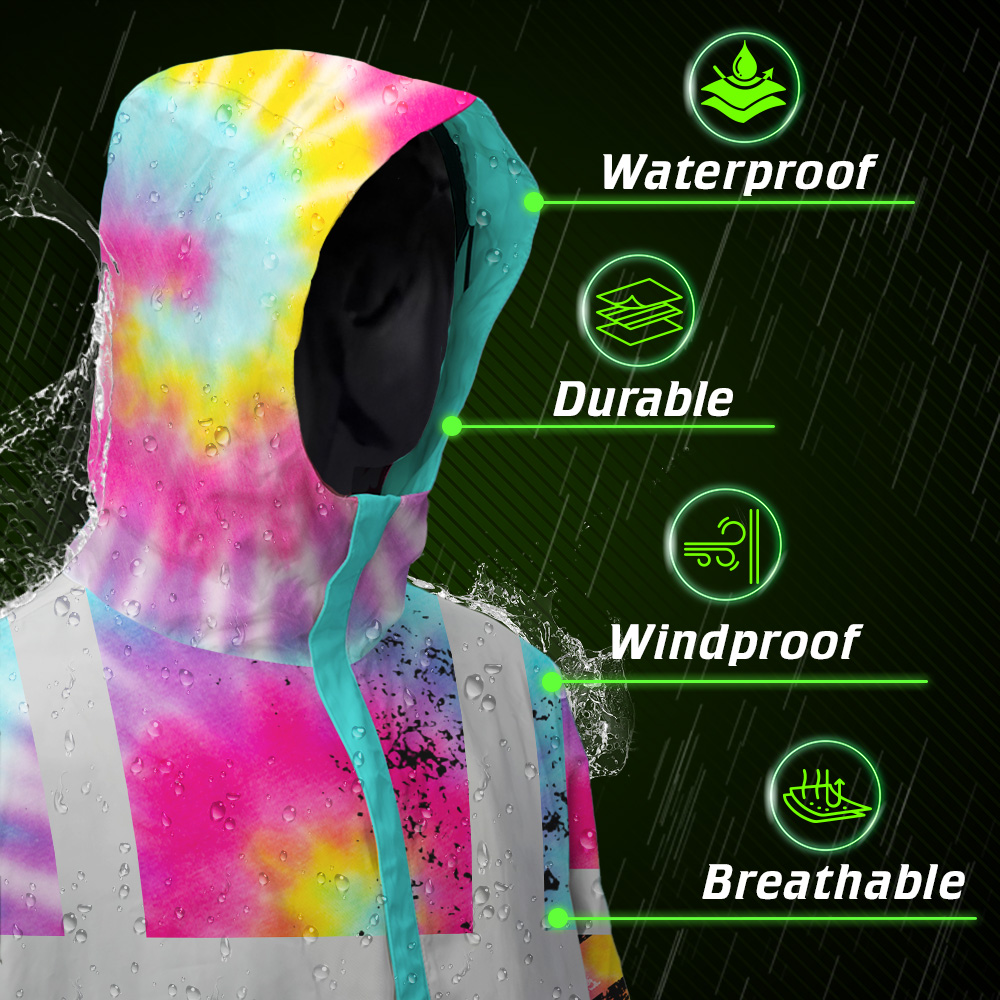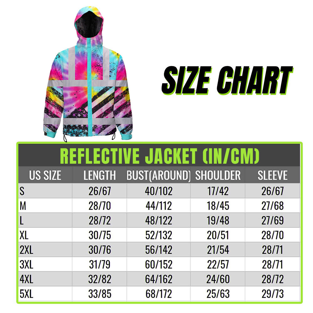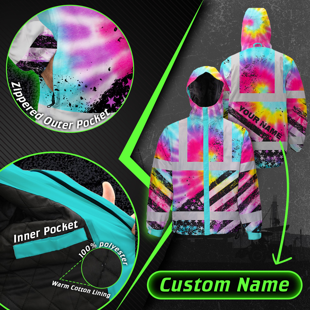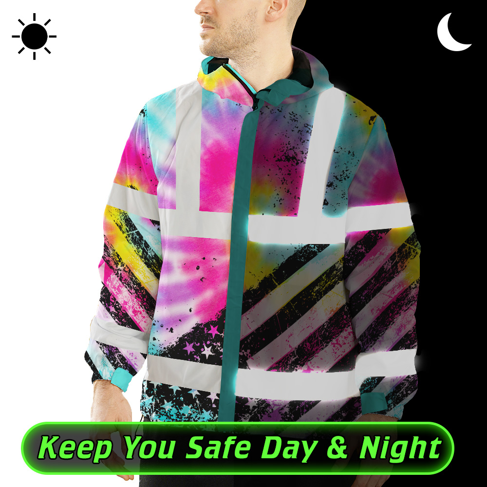 Hi Vis Jacket Waterproof Reflective Tie Dye US Flag Paint Custom Name Safety Workwear For Worker, Motorcycle Bicycle, Runner