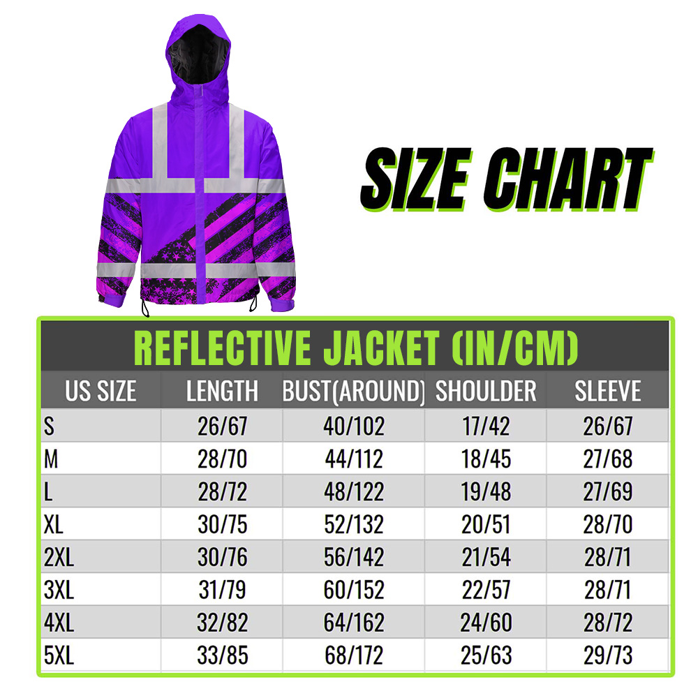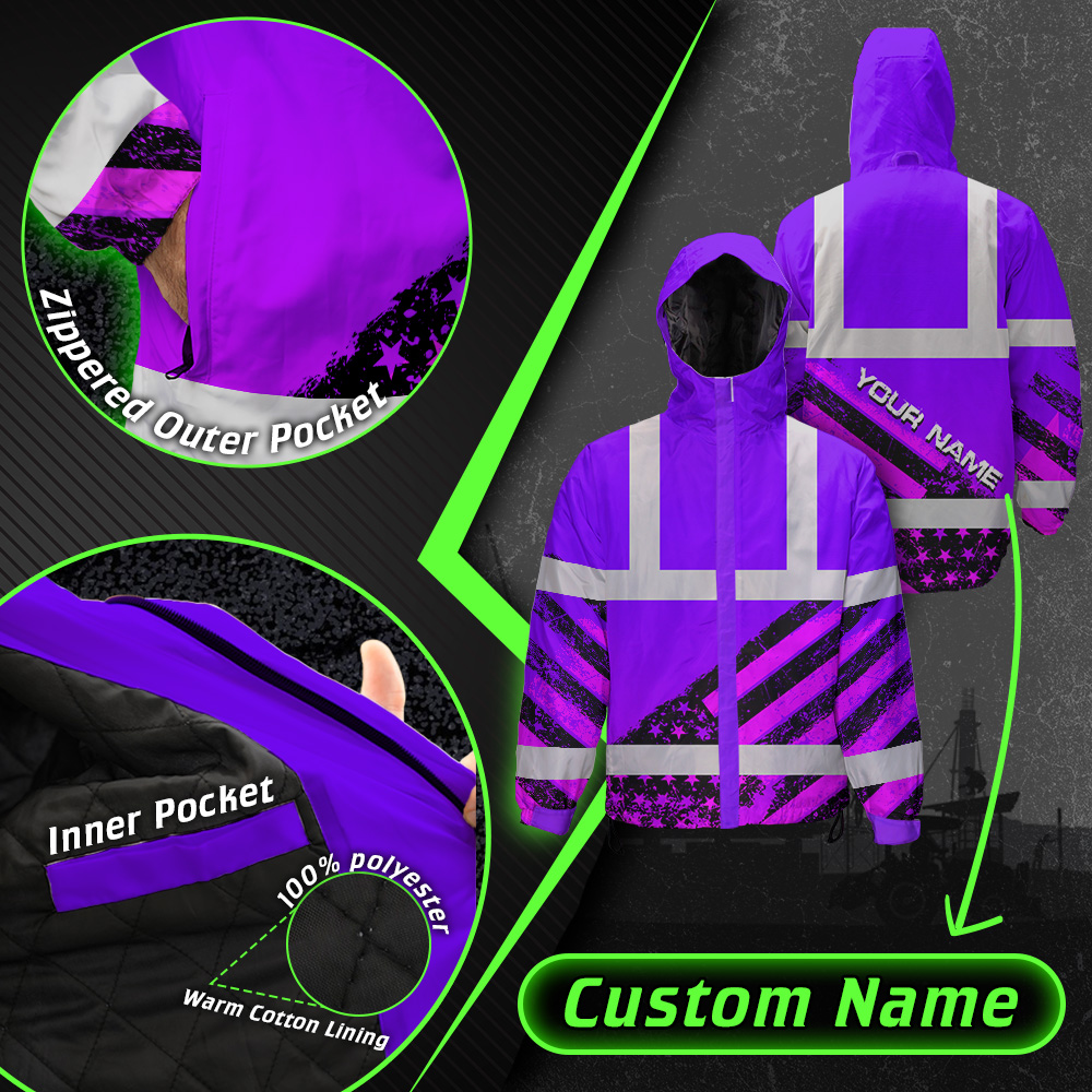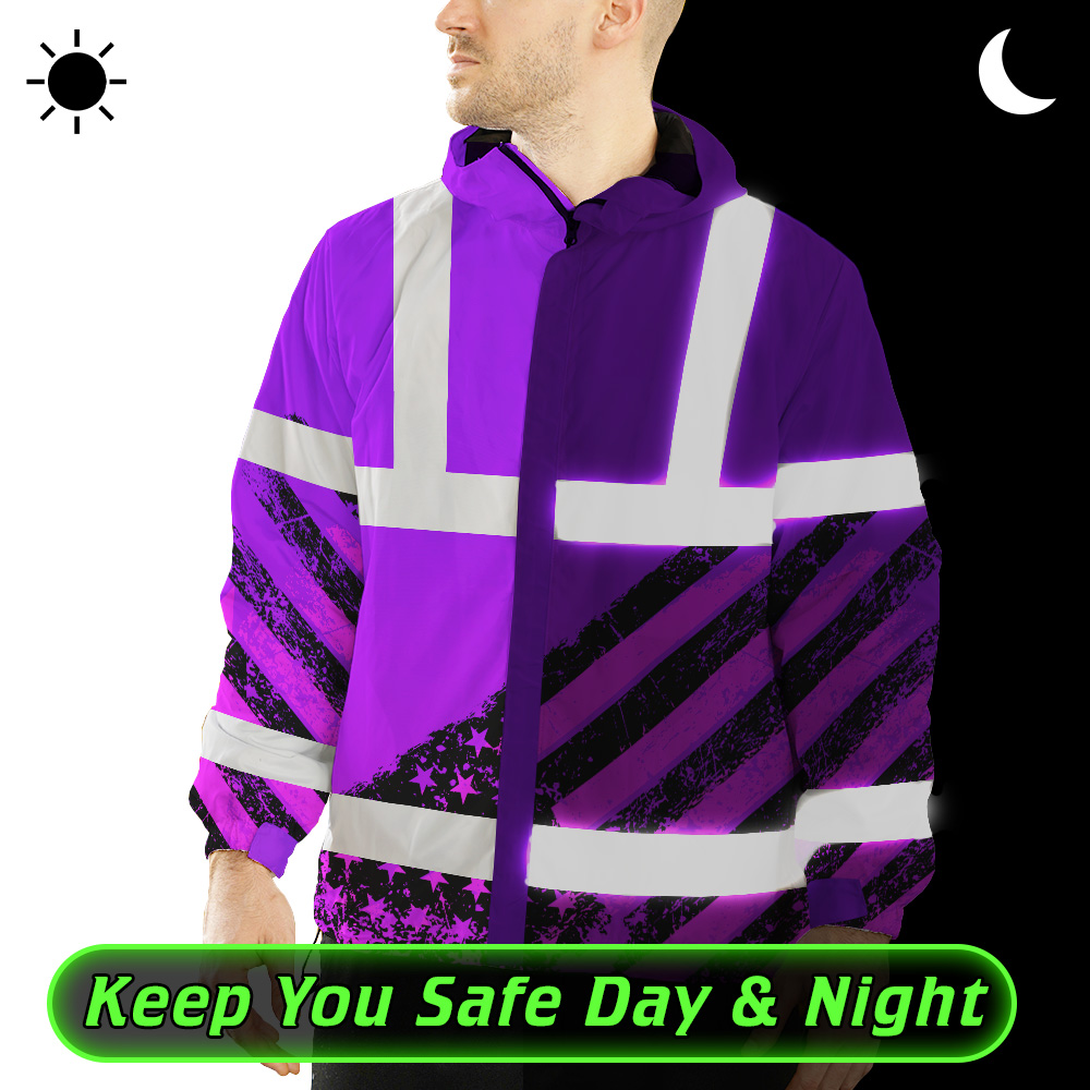 Hi Vis Jacket Waterproof Reflective Violet US Flag Paint Custom Name Safety Workwear For Worker, Motorcycle Bicycle, Runner