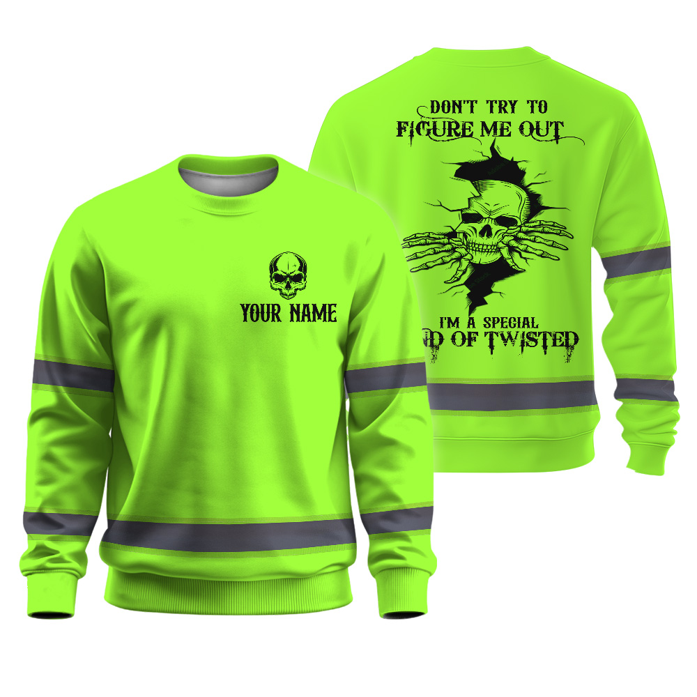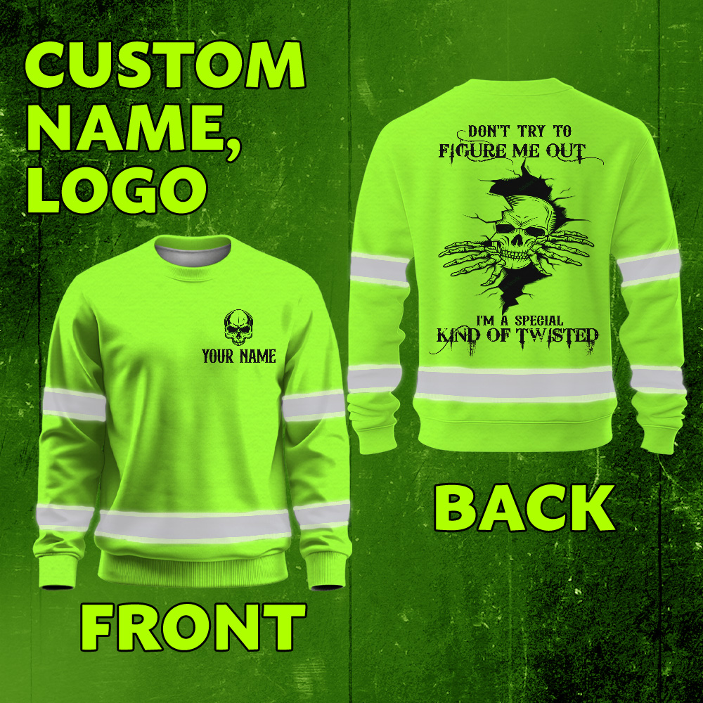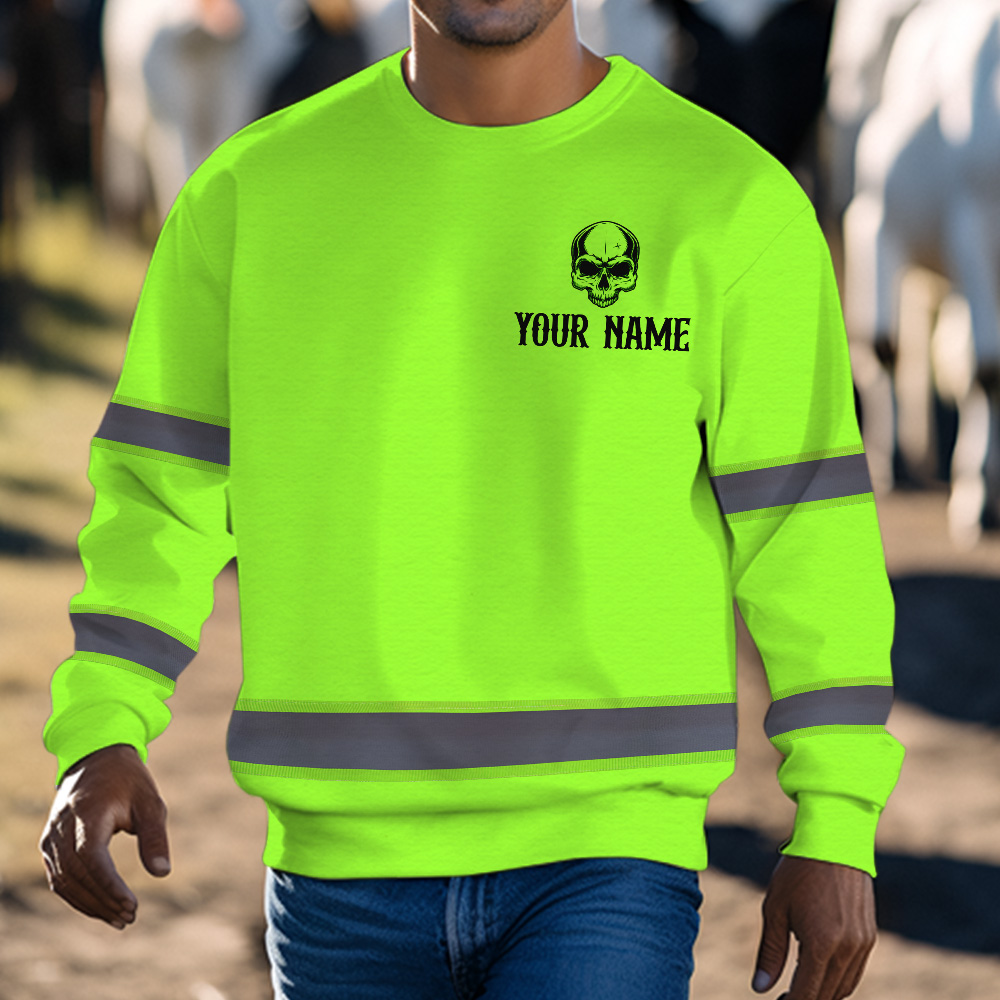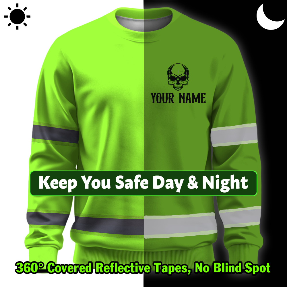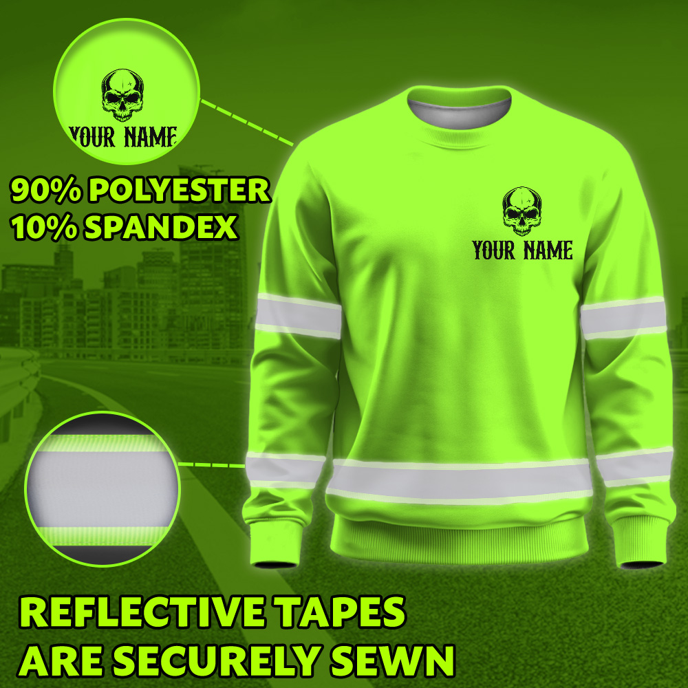 Hi Vis Long Sleeve Shirt Green Neon Reflective Customize Name Safety Workwear For Workers, Runners, Truckers, Skull Lovers
