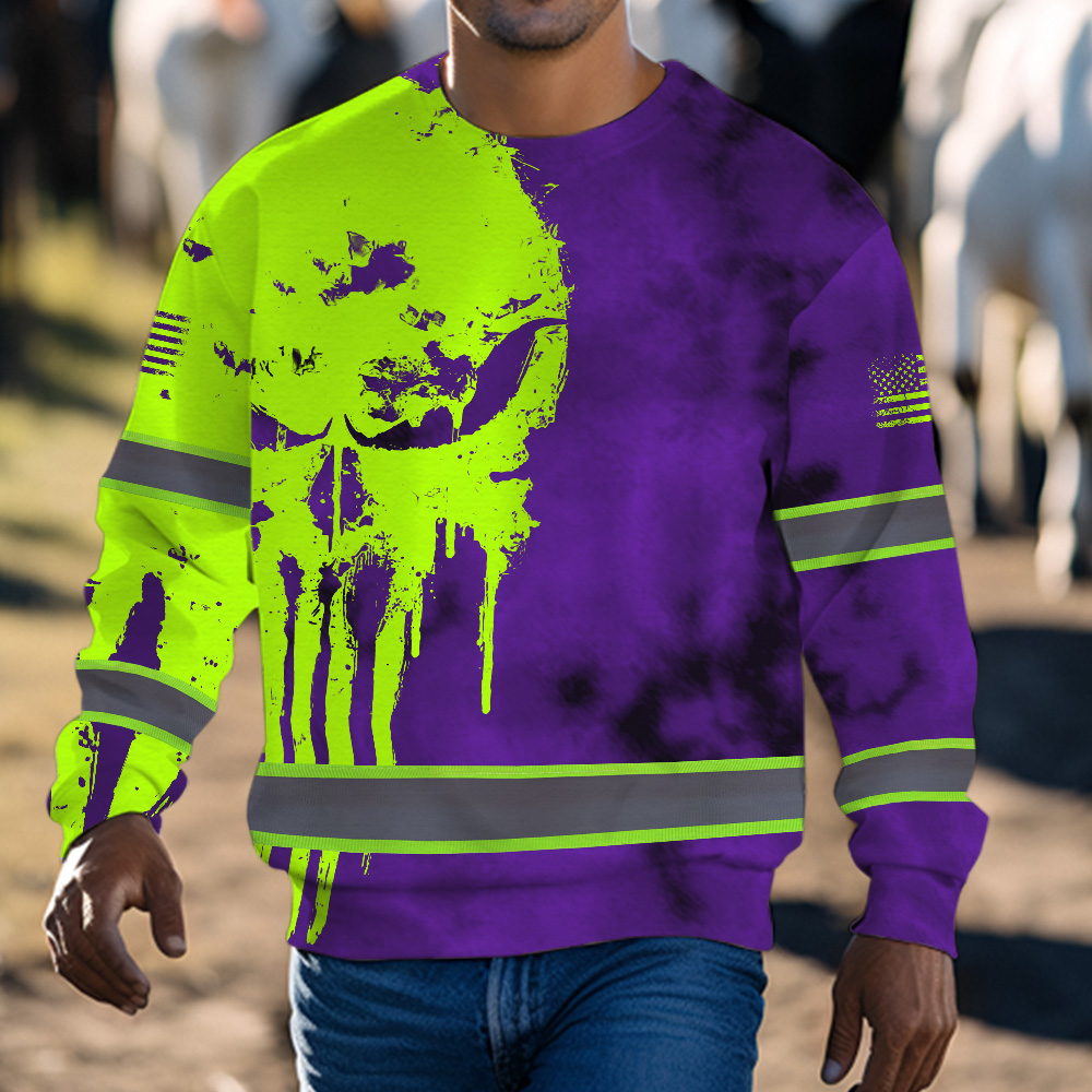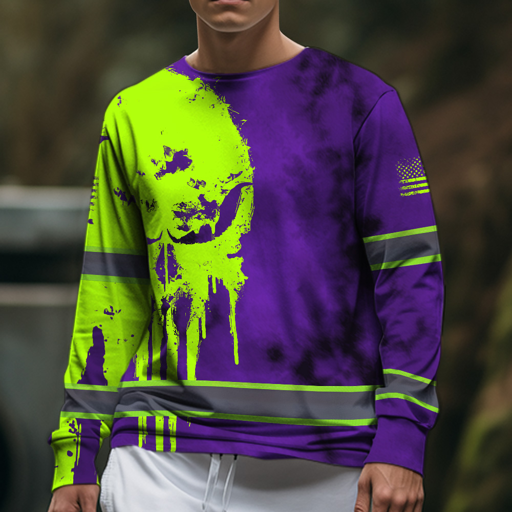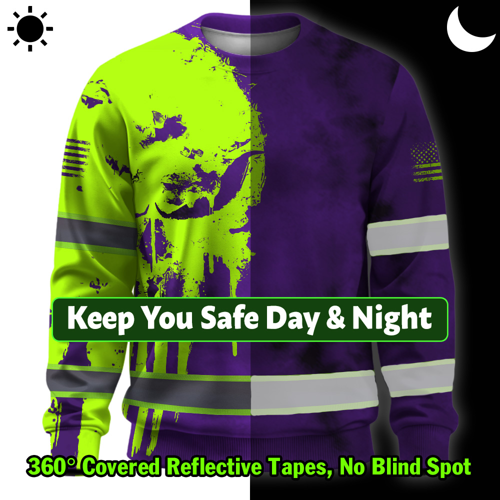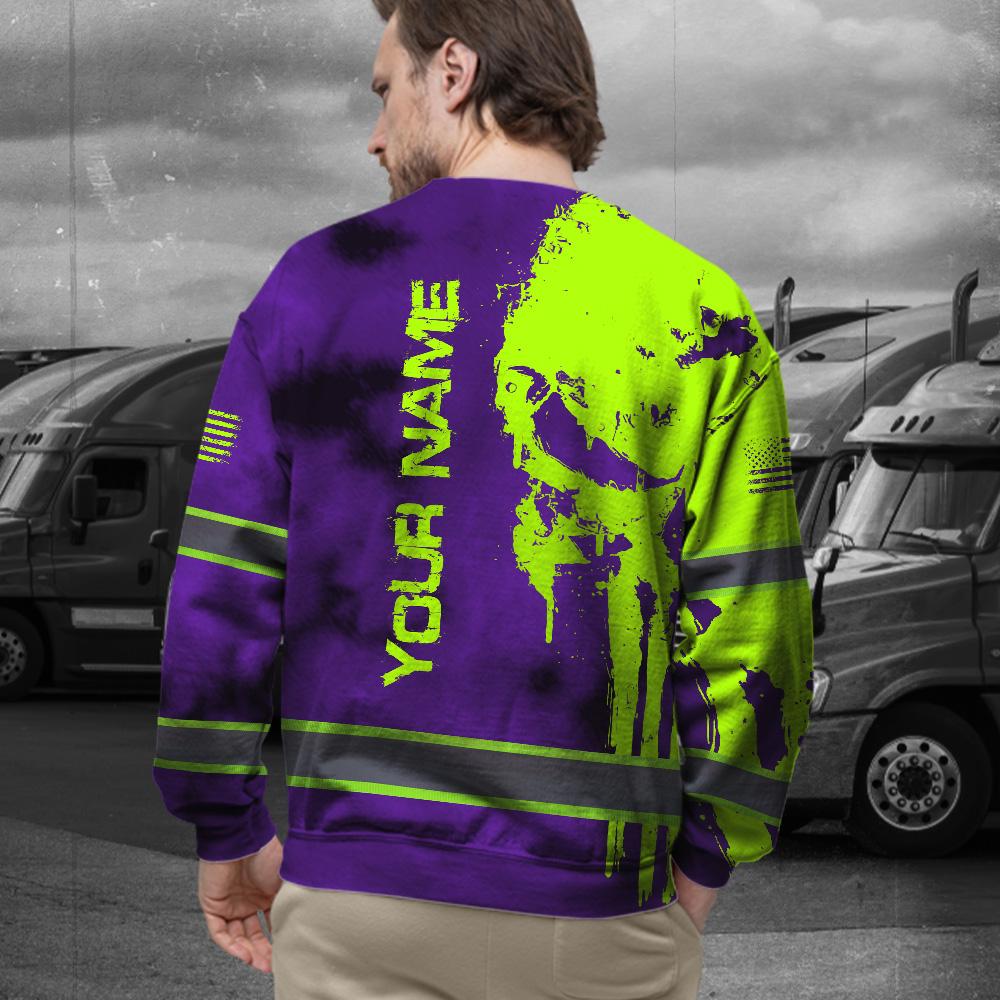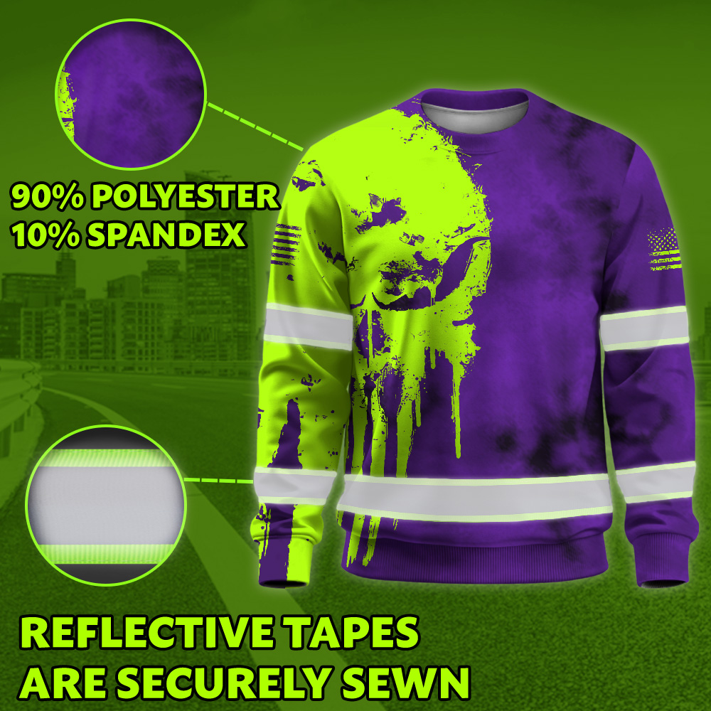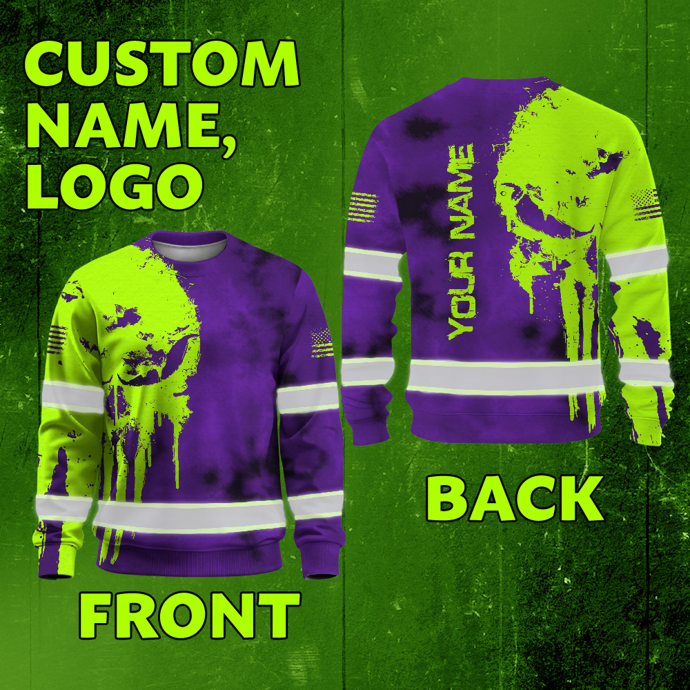 Hi Vis Long Sleeve Shirt Reflective Black Pattern Skull Custom Name Safety Workwear For Workers, Runners, Truckers, Skull Lovers