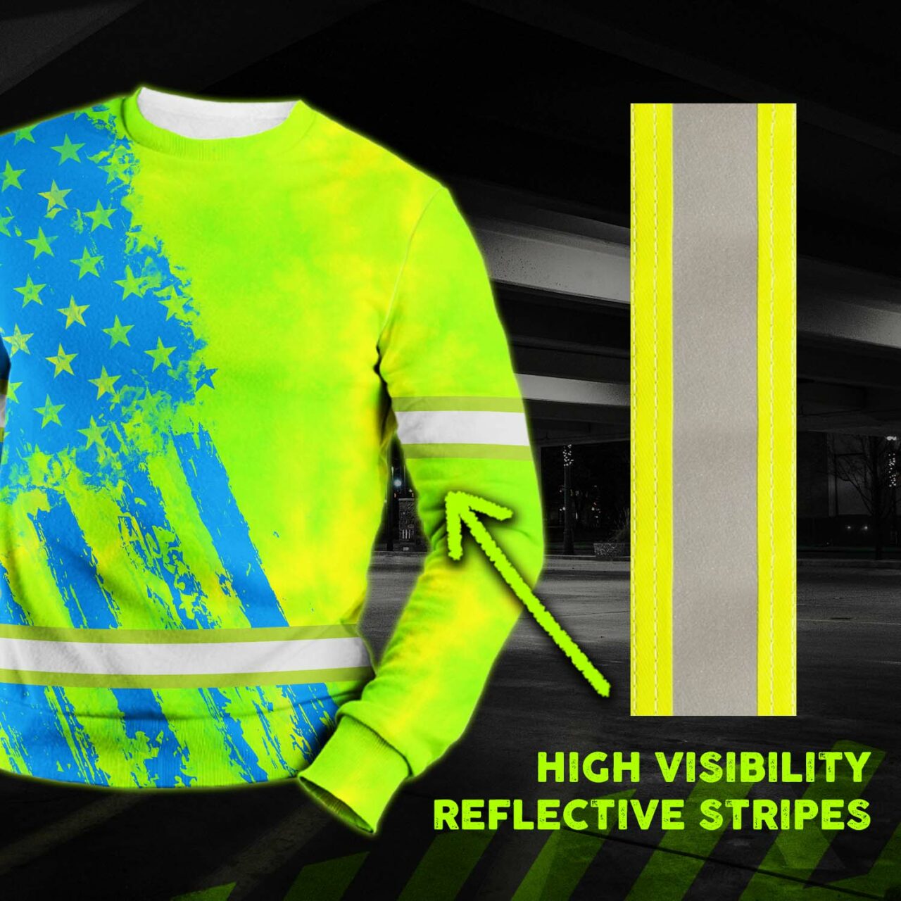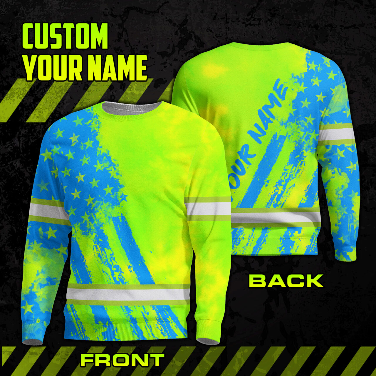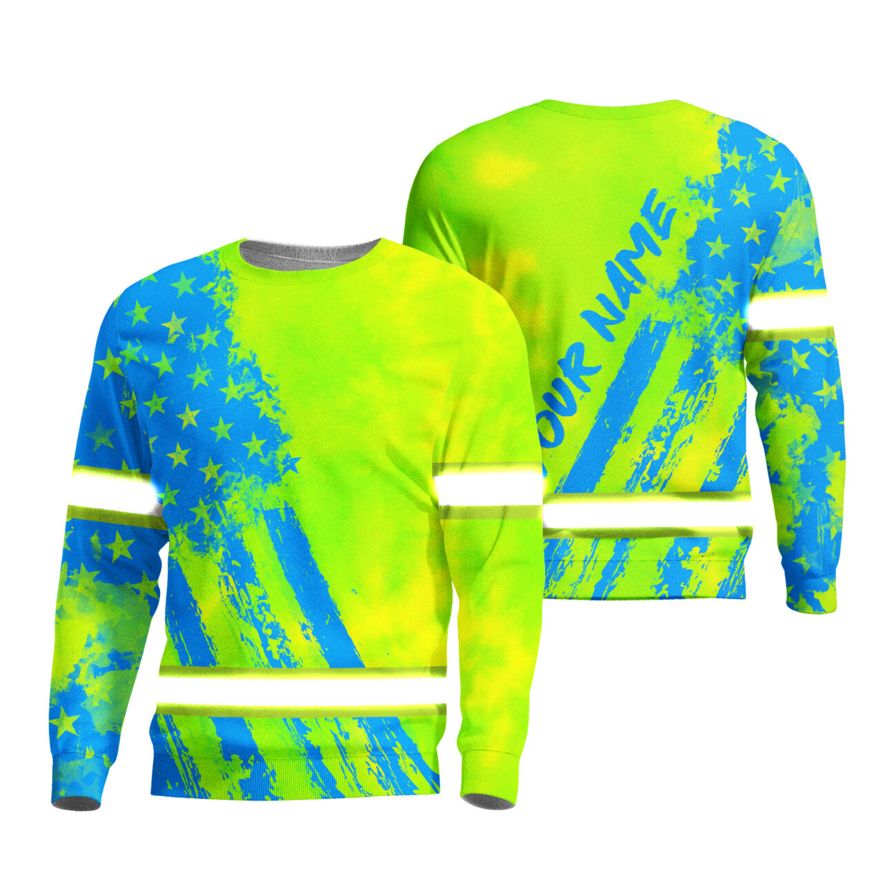 Hi Vis Long Sleeve Shirt Reflective Tapes Green Neon And Blue US Flag Custom Name Safety Workwear