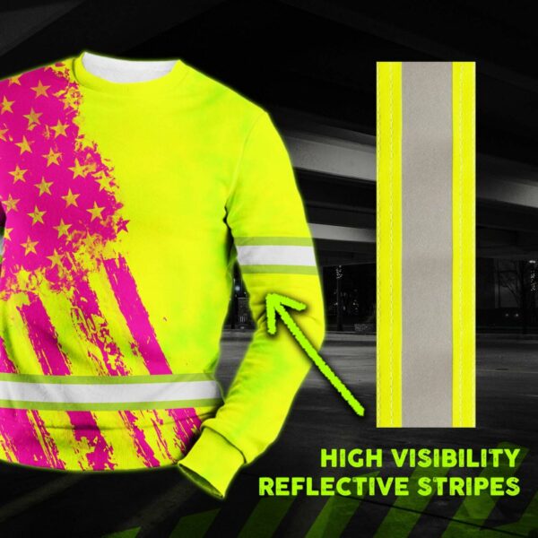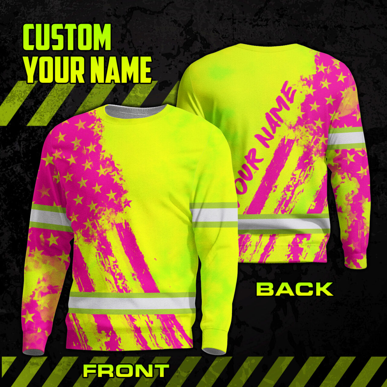 Hi Vis Long Sleeve Shirt Reflective Tapes Green Neon And Pink US Flag Custom Name Safety Workwear