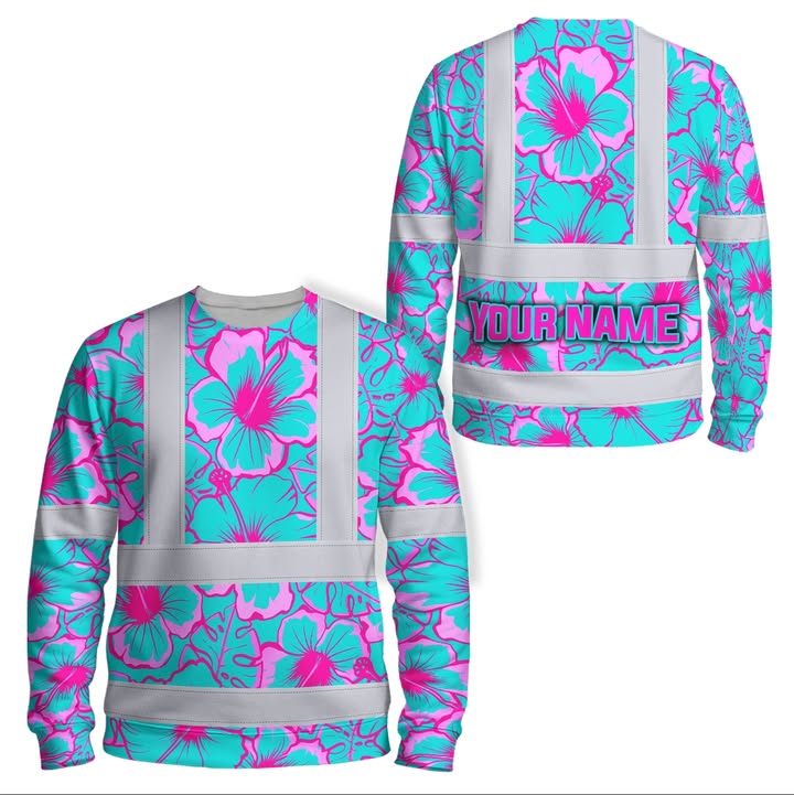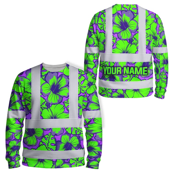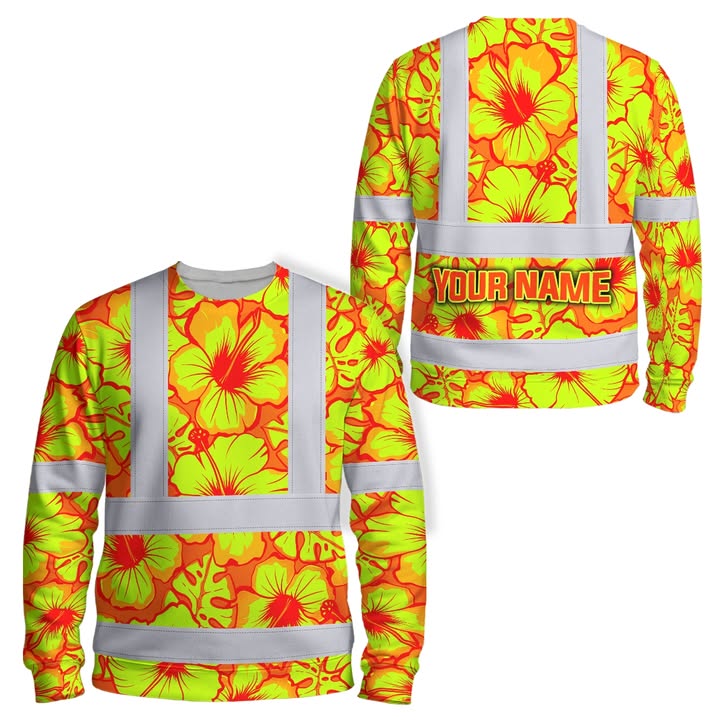 Hi Vis Long Sleeve Shirt Reflective Tapes Orange, Green, Blue Neon And Yellow Flowers Custom Name Safety Workwear For Workers, Truckers, Operators