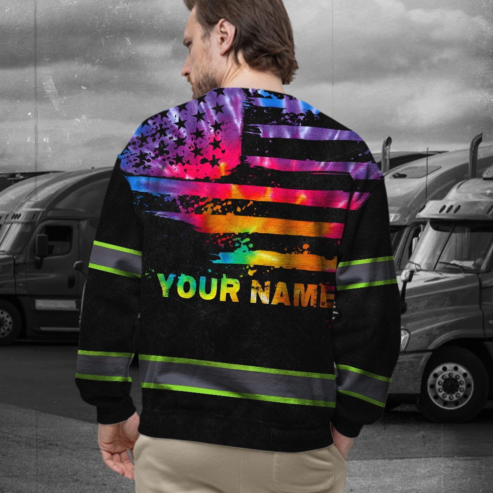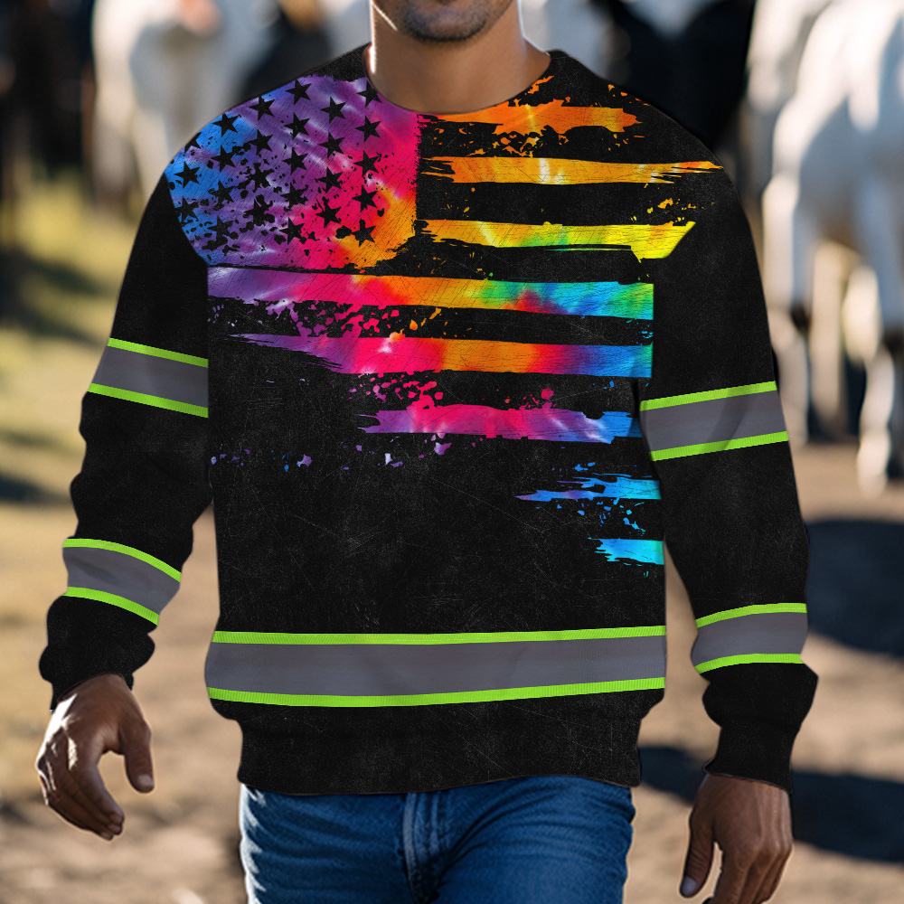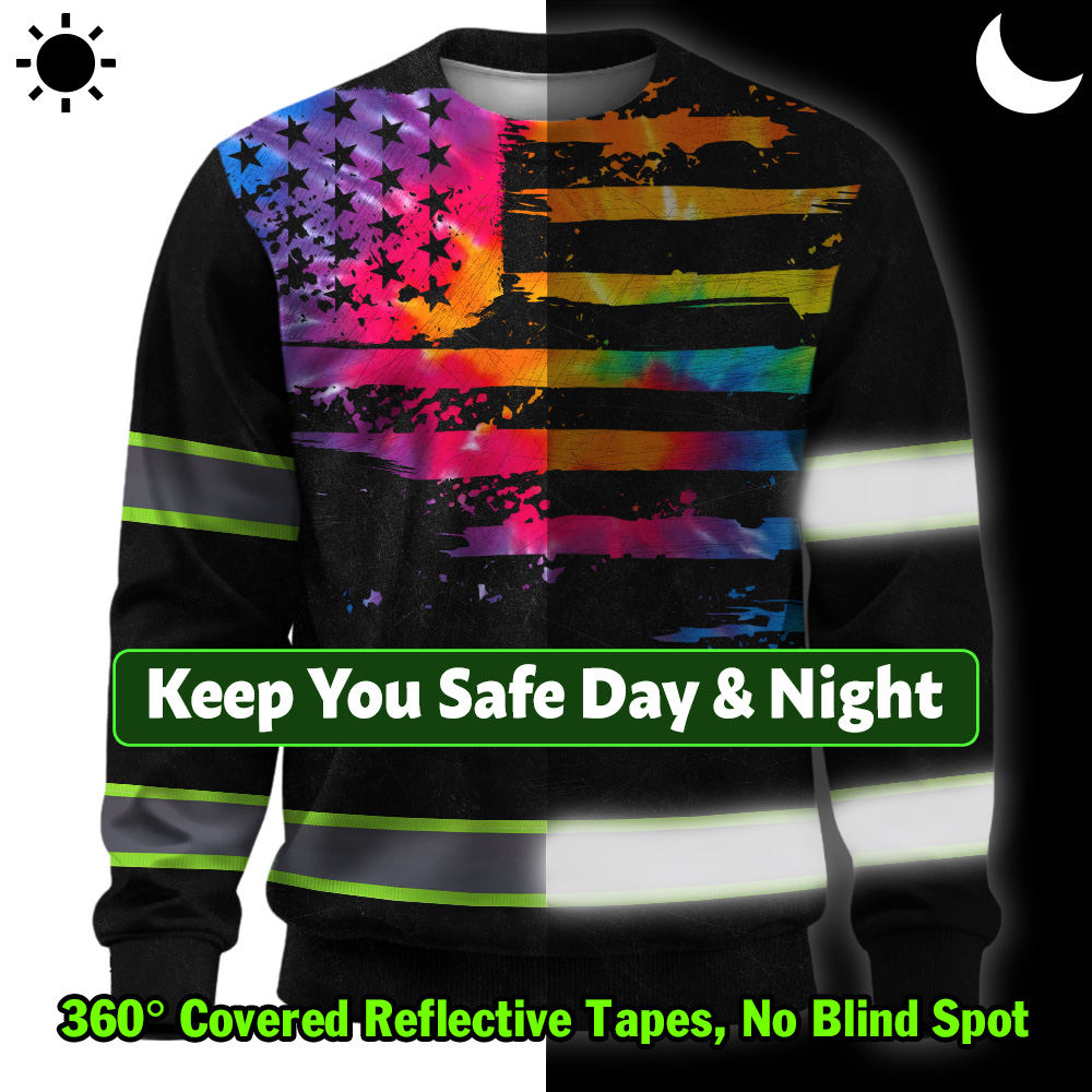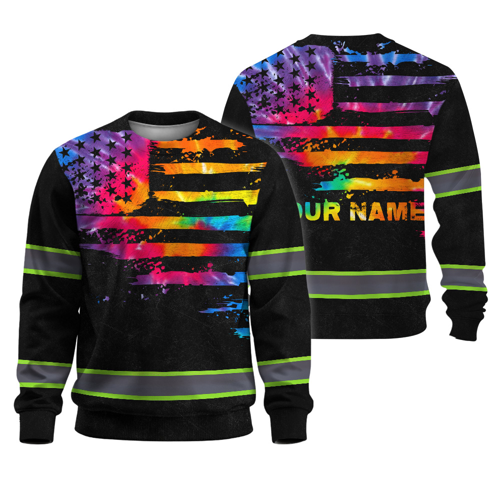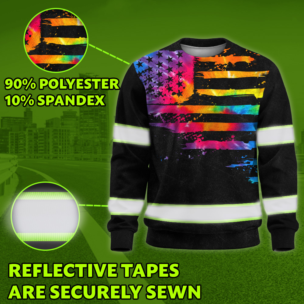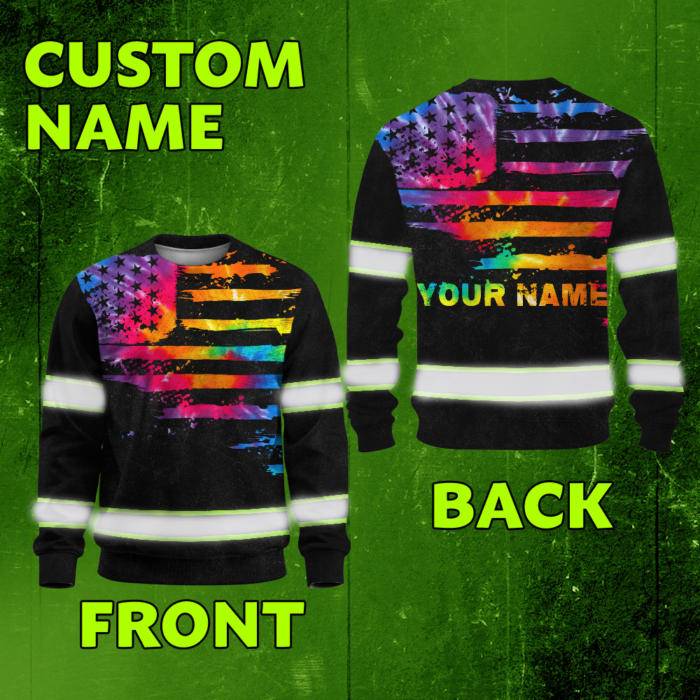 Hi Vis Long Sleeve Shirt Reflective Tapes Rainbow Tie Dye US Flag Custom Name
