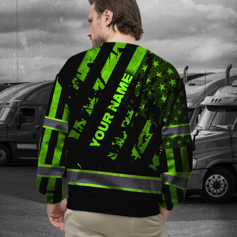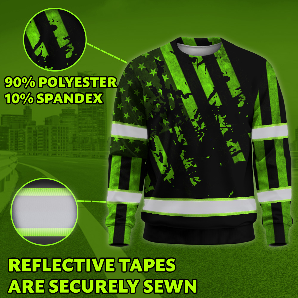 Hi Vis Long Sleeve Shirt Reflective USA Flag Custom Name Logo Safety Workwear For Worker, Operator, Trucker, Patriotic