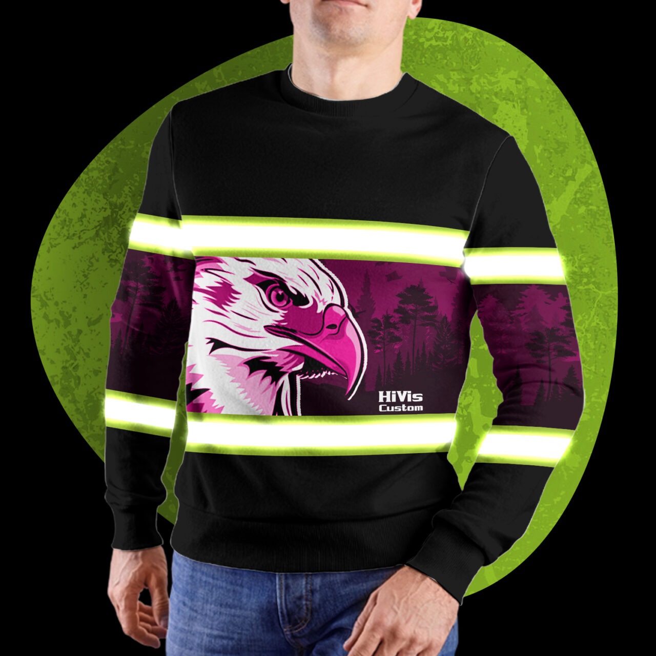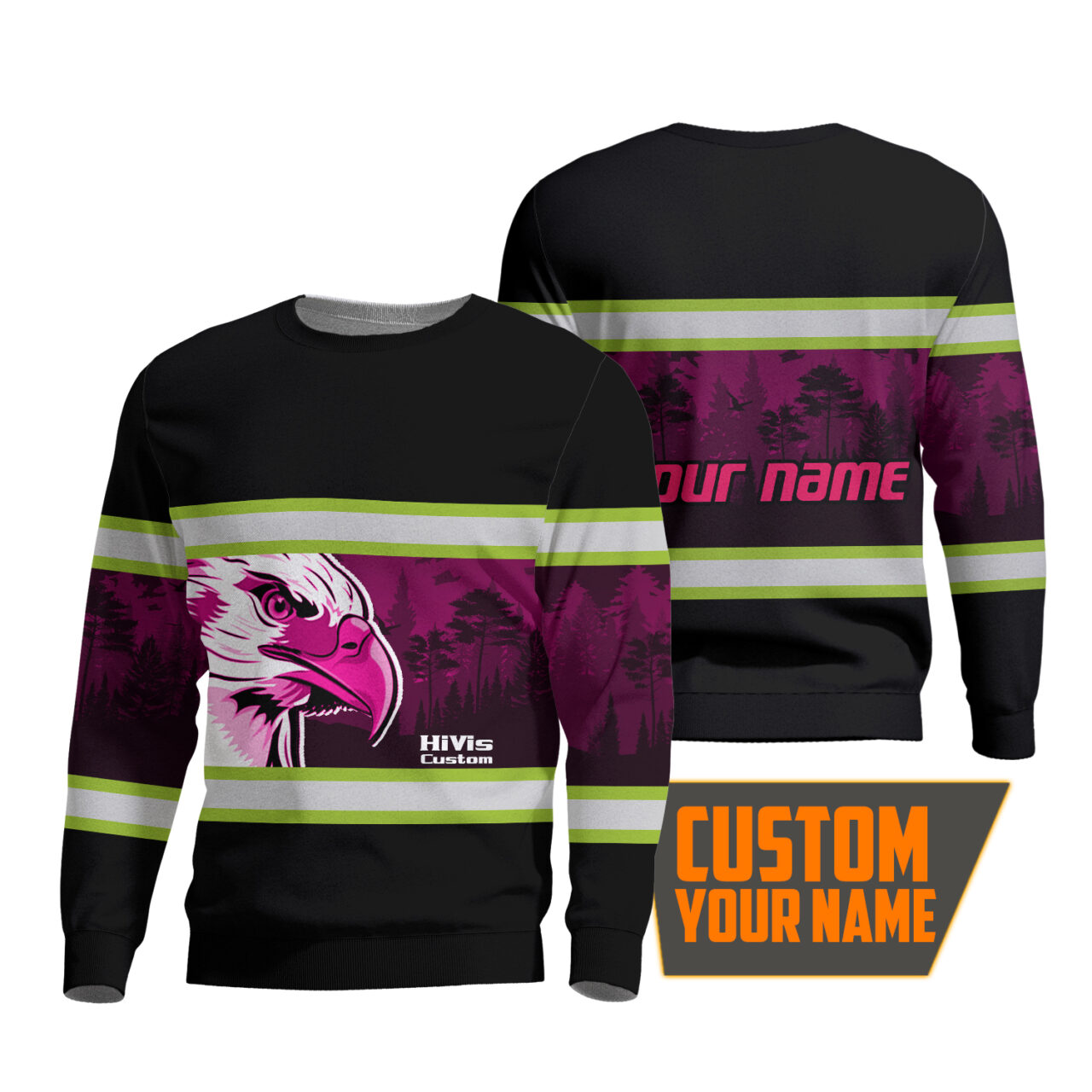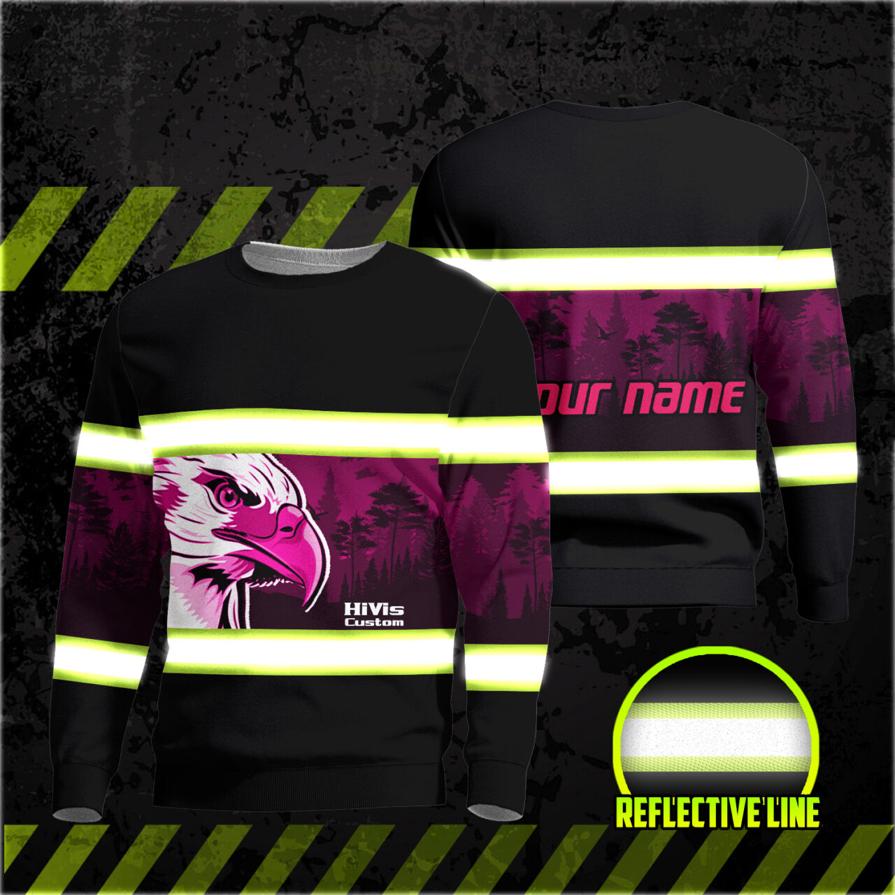Hi Vis Long Sleeves Shirt Reflective Pink Eagle USA Flag Custom Name Safety Workwear For Workers, Patriotic, Veteran, Military'