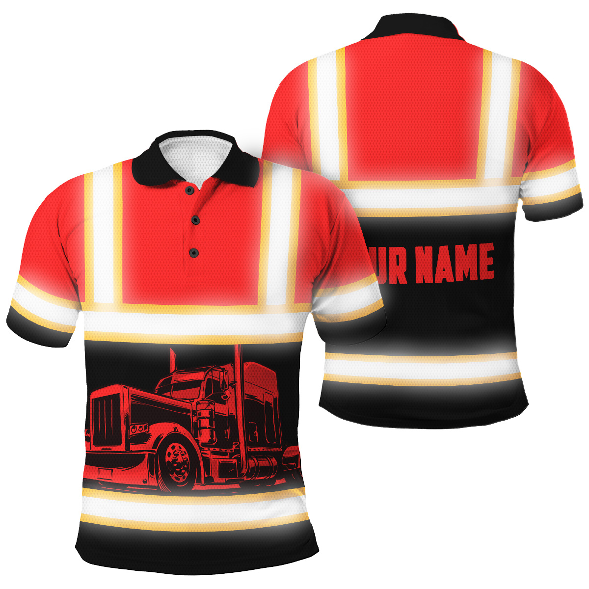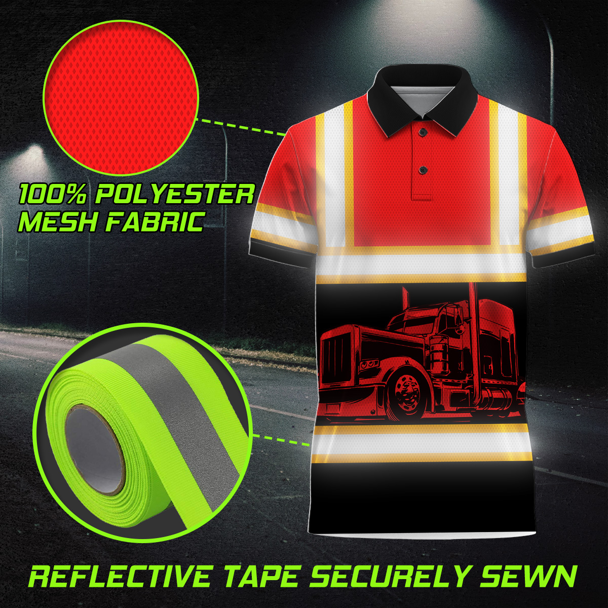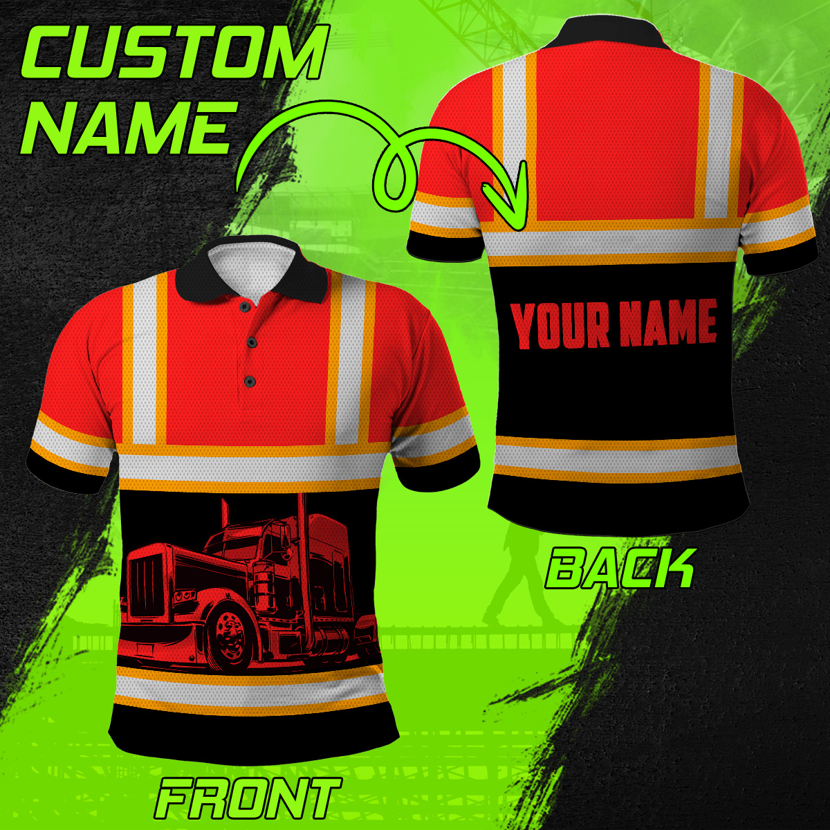 Hi Vis Polo Reflective Tapes Orange Semi Truck Driver Custom Name Safety Workwear For Truckers, Workers, Runners, Cyclists