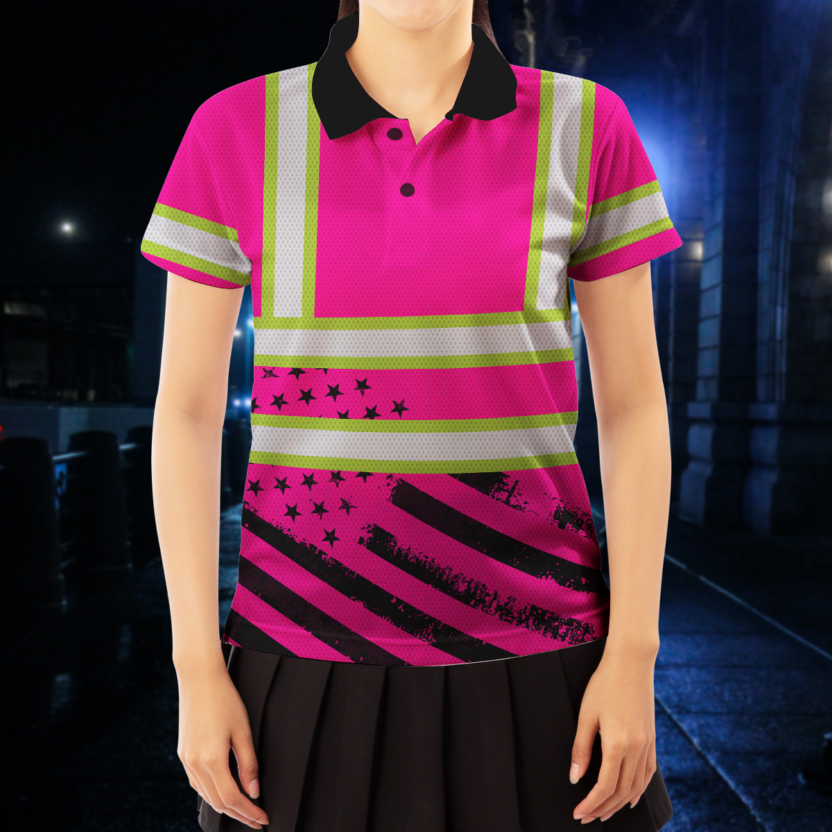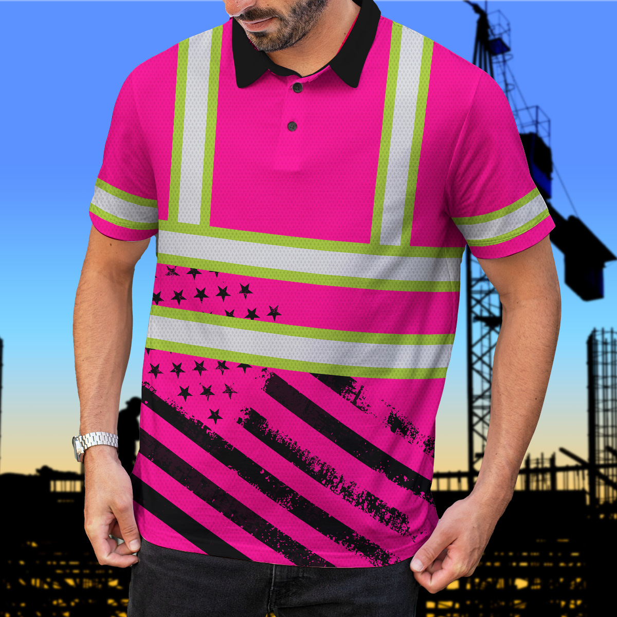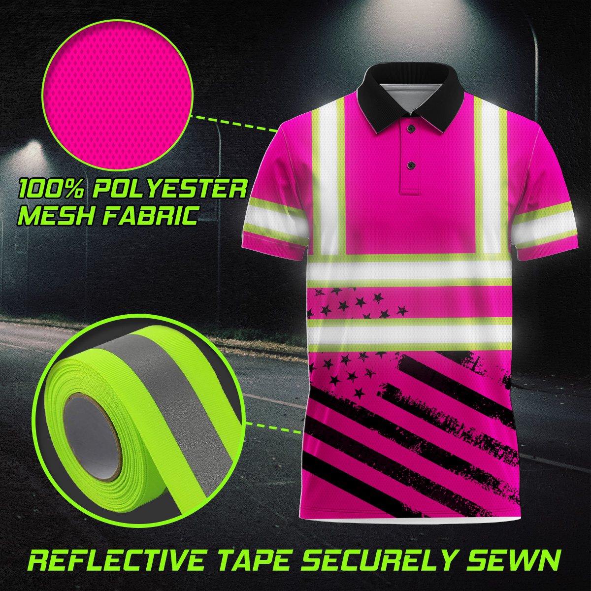 Hi Vis Polo Reflective Tapes Pink USA Flag Safety Workwear For Workers