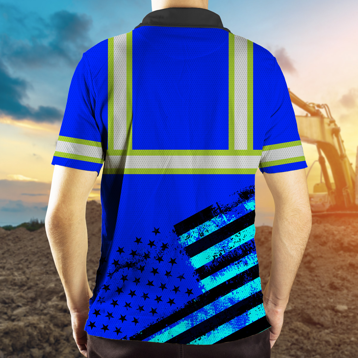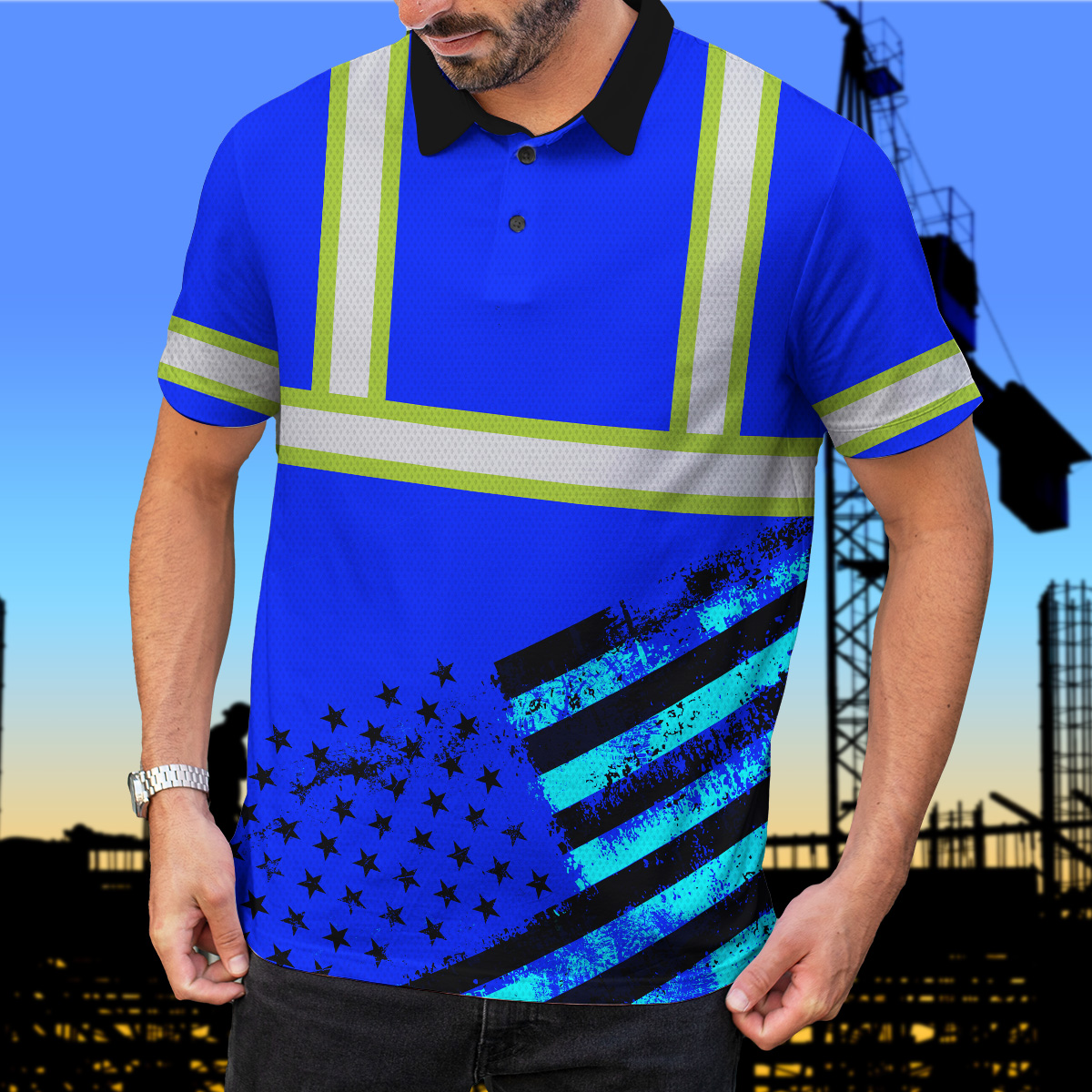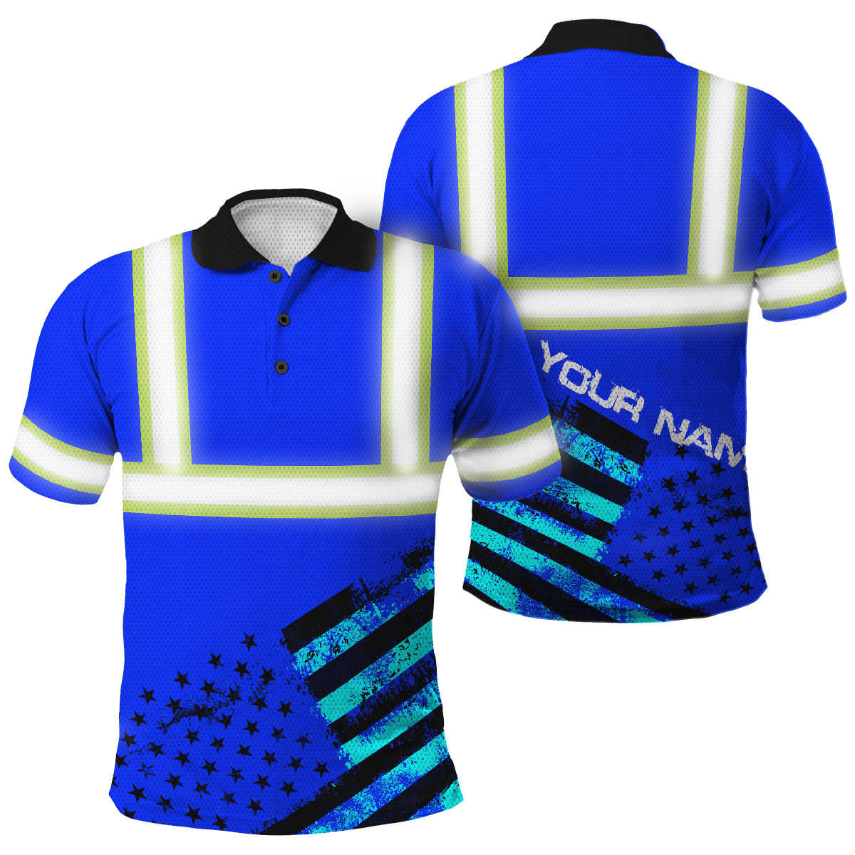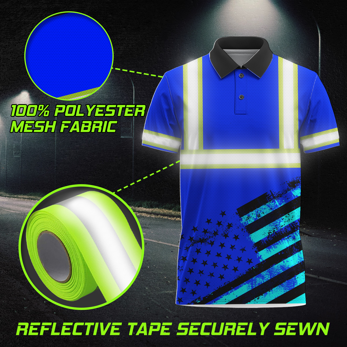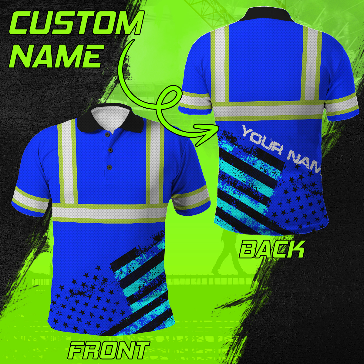 Hi Vis Polo Shirt Reflective Black And Blue Neon USA Flag Custom Name Safety Workwear