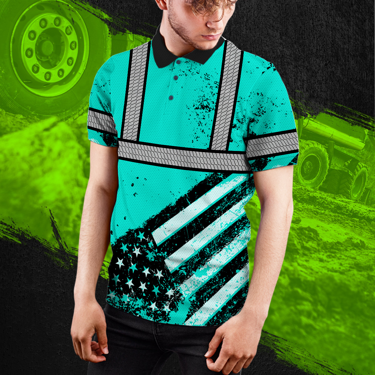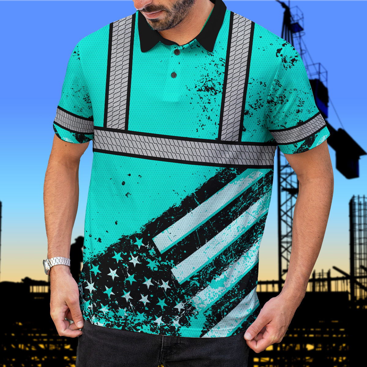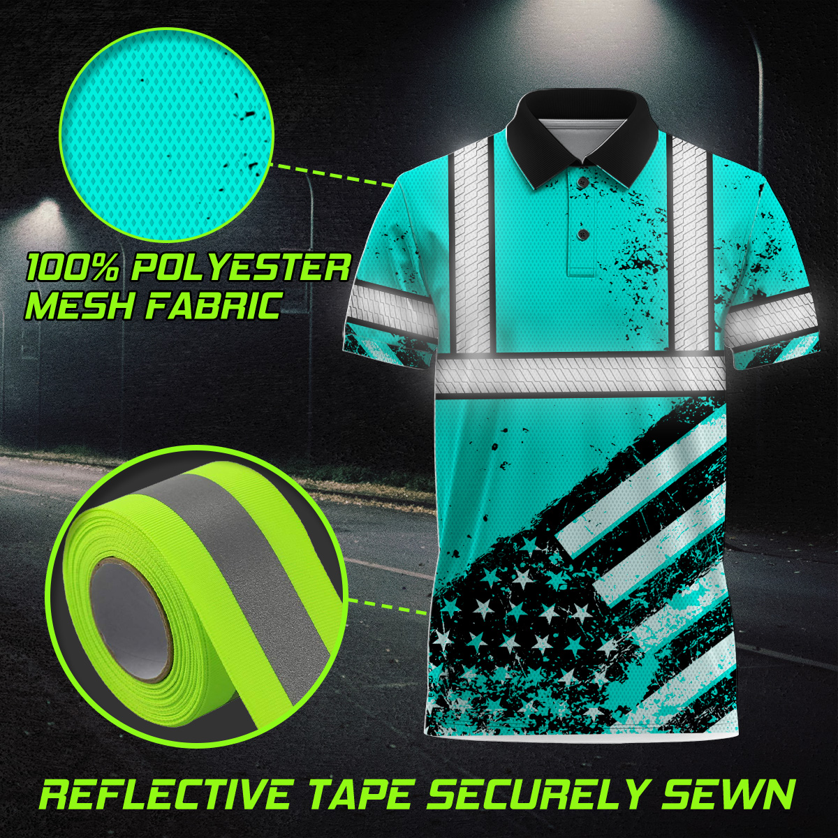 Hi Vis Polo Shirt Reflective Mint US Flag Paint Safety Workwear For Worker, Motorcycle Bicycle, Runner